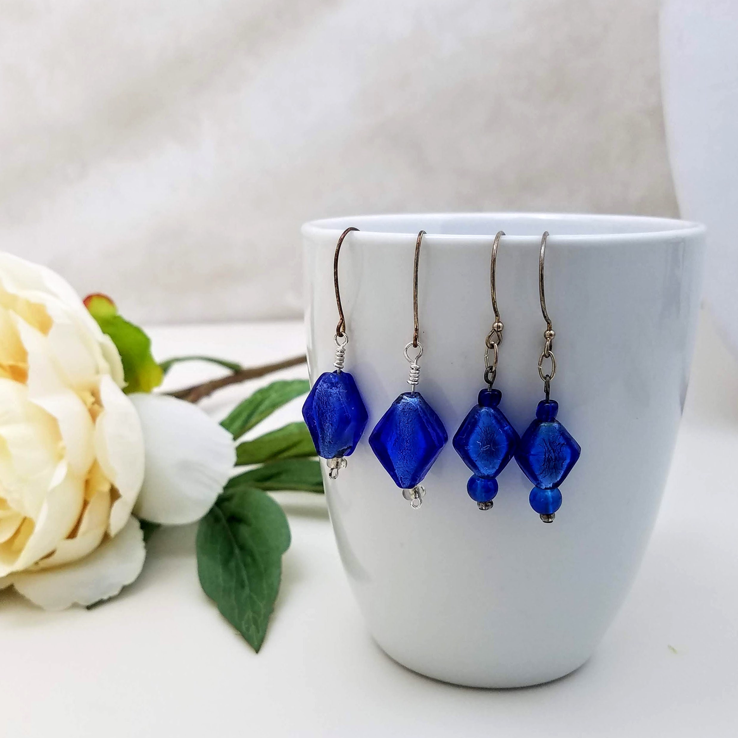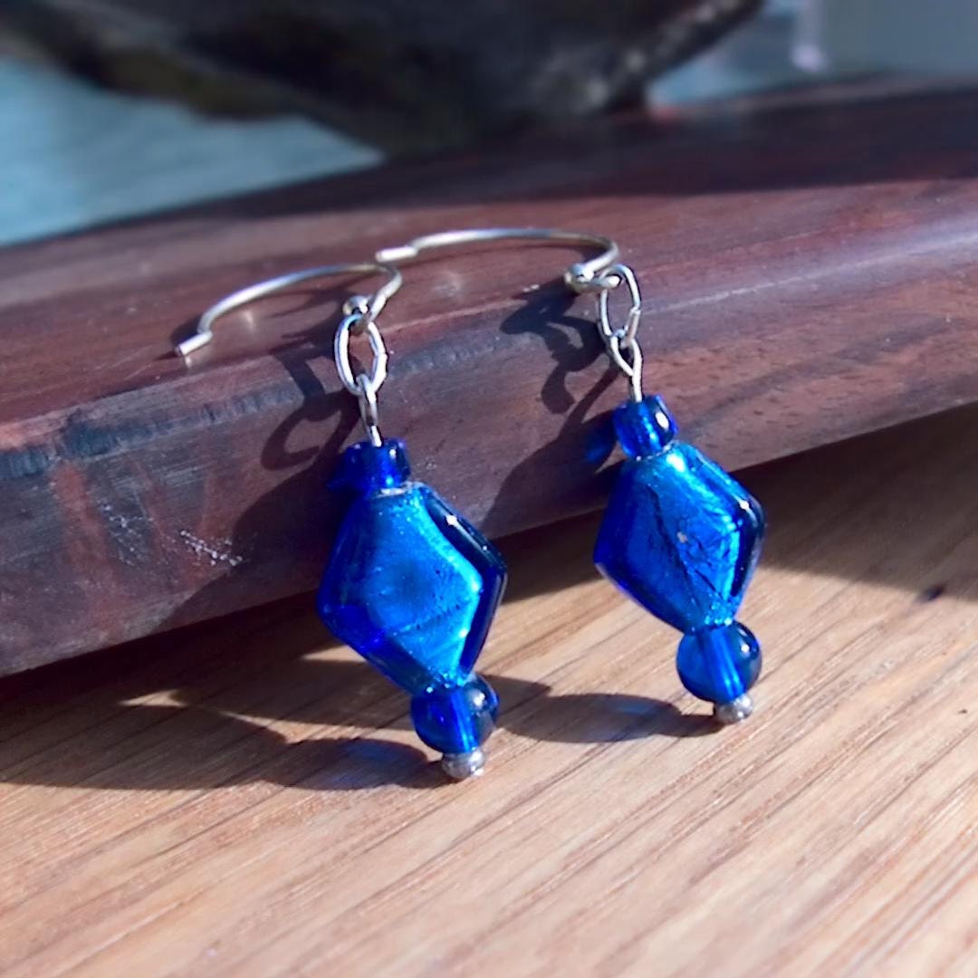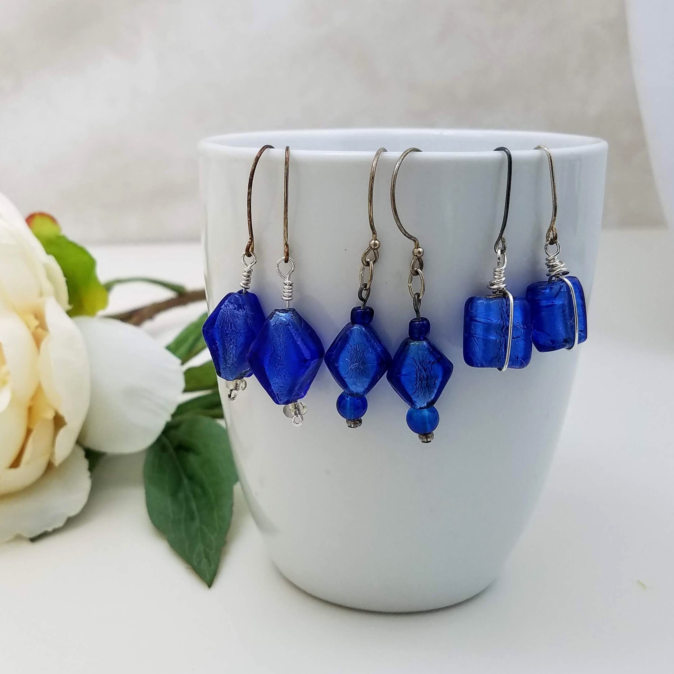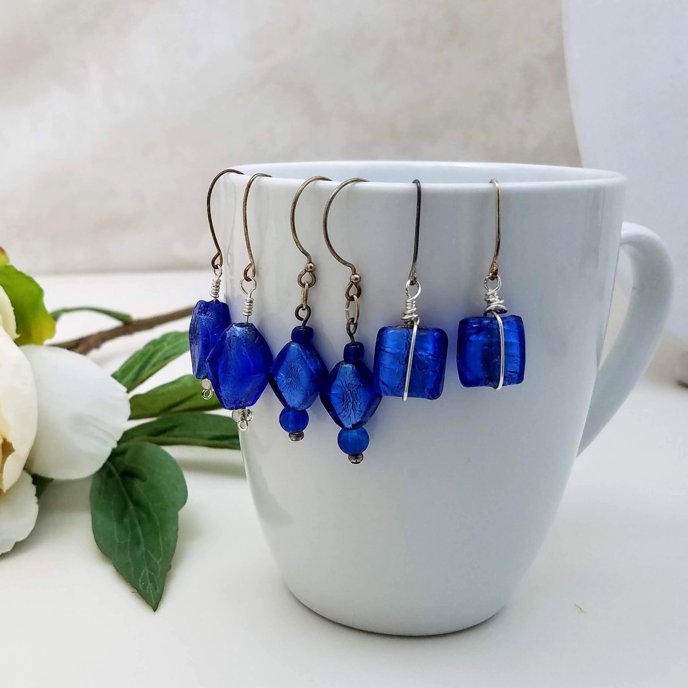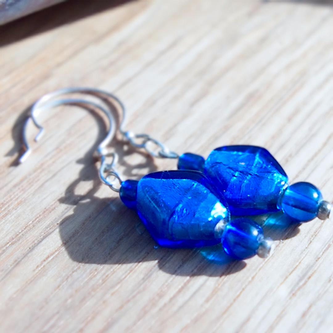 Bohemian earrings, blue and silver earrings made from bright cobalt blue Lampwork Glass bead dangle from silver plated wires to create 2 1/4" dangle drop earrings. Blue earrings double as everyday earrings and date night earrings - vibrant and beautiful, a simple pair of bohemian glass earrings. This cobalt blue glass is a trending, hard to find color, it is light weight and striking. A wonderful gift for her under $20.00.