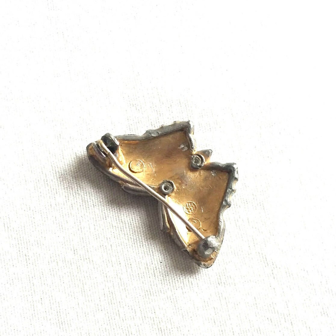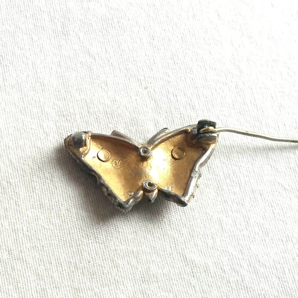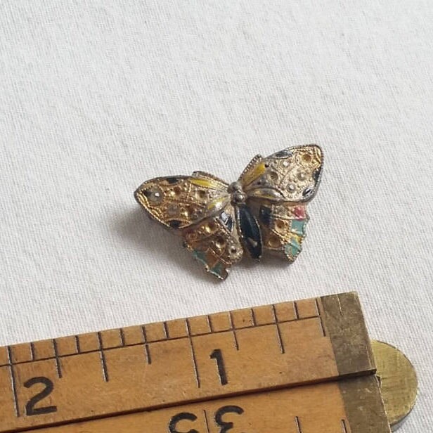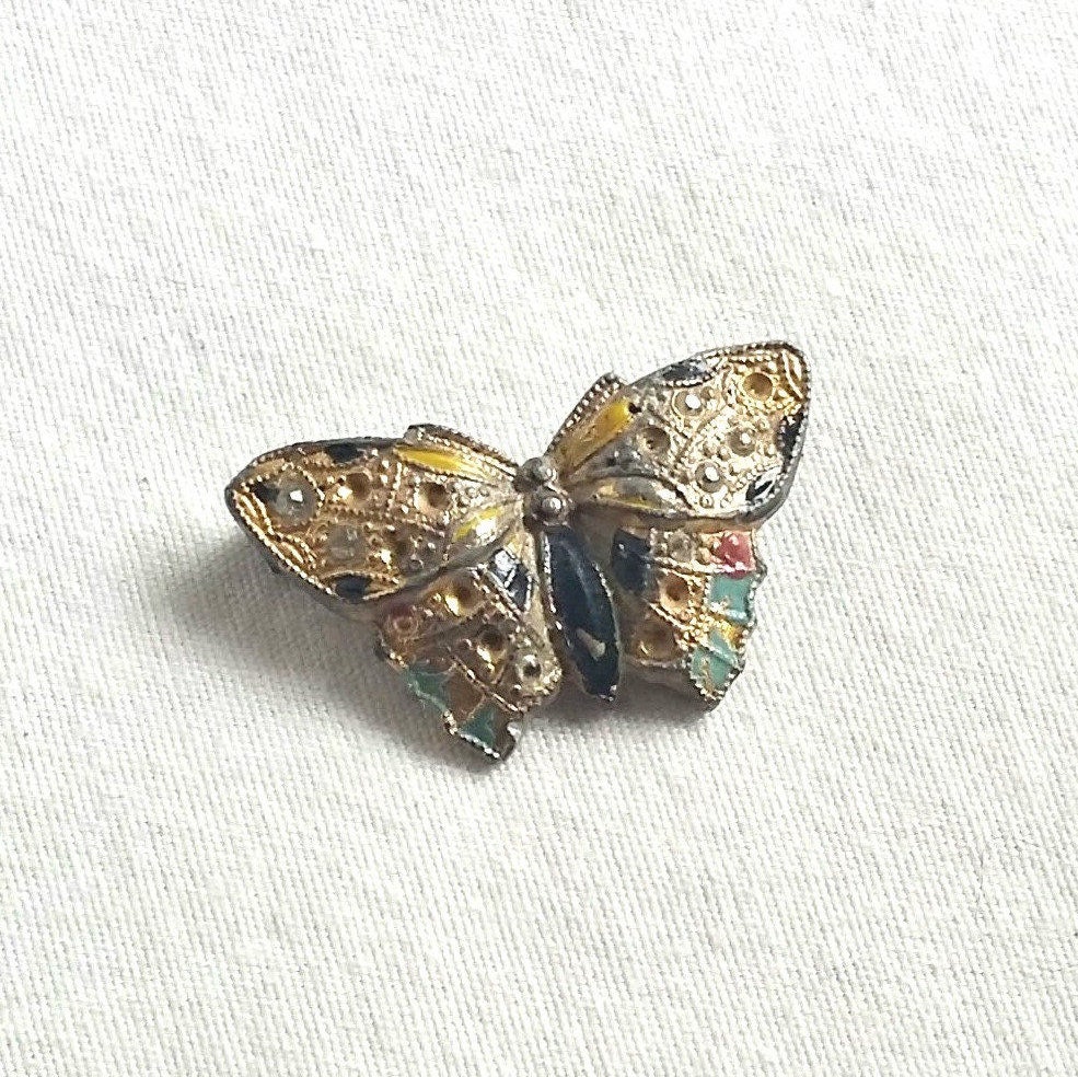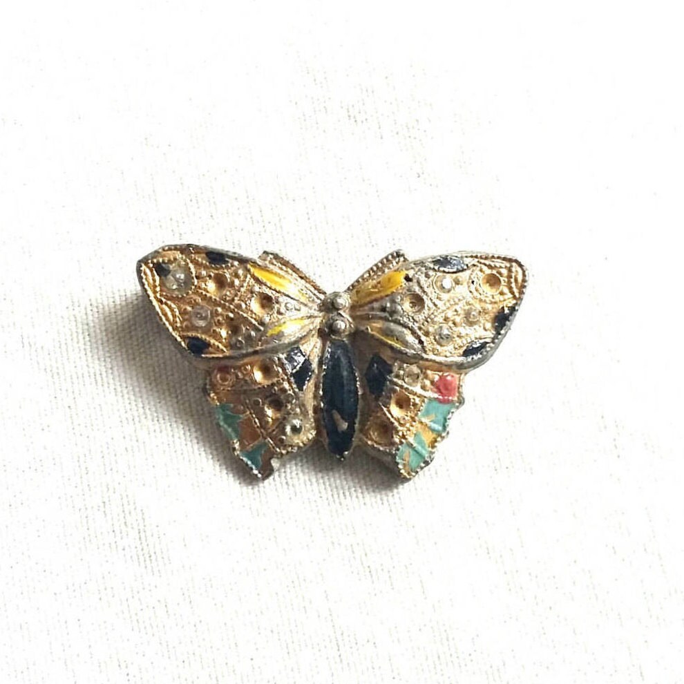 A small enamel butterfly brooch, gold colored with small rhinestones and painted areas of blue, red, and black. The gold colored butterfly pin is made of pot metal and fastens with a simple 'c' clasp. Once sparkling with numerous rhinestones, now seven are left. A rare 1940's pin. Once used as a perfume pin, the backing long since gone. This lovely petite butterfly is now a simple addition to your vintage jewelry collection.