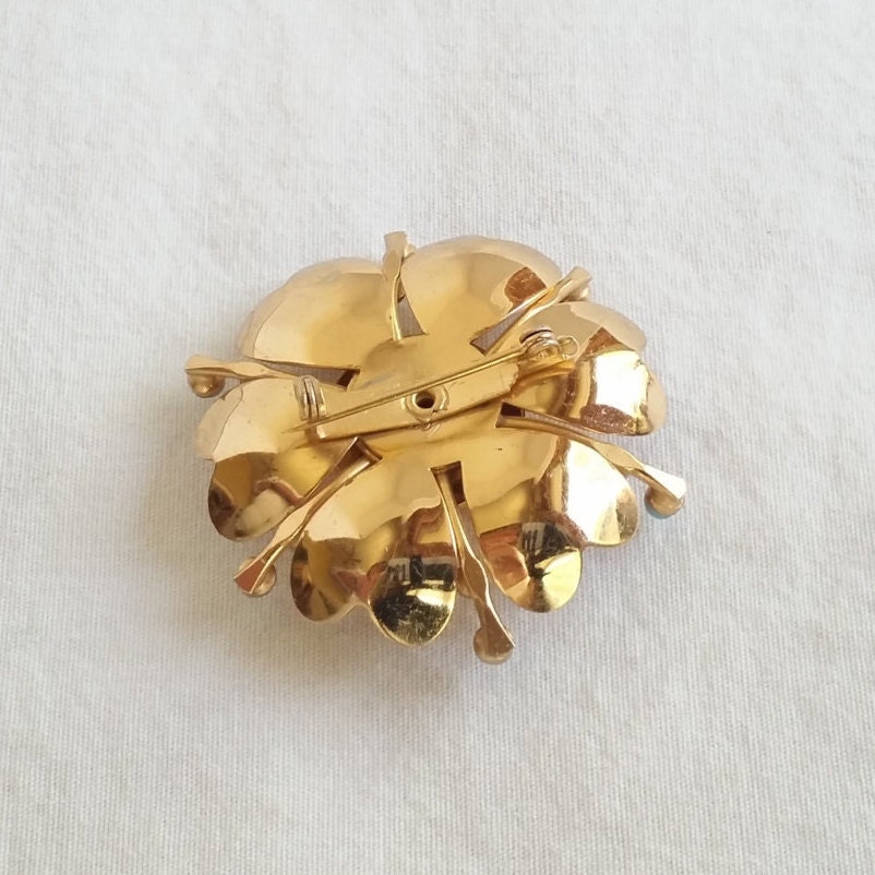 Vintage Coro Brooch, a gold enamel and rhinestone pin. This vintage flower brooch is almost an antique, the signature showing as jewelry made around 1919. A beautiful statement brooch with ruby crystal rhinestones. What a wonderful gift for her this holiday season.