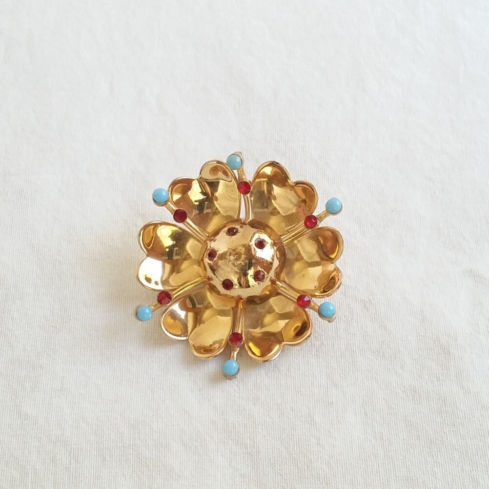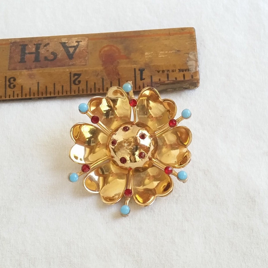This vintage designer brooch is signed by Coro Jewelry. A gold pin, gold enameled with ruby red rhinestones and turquoise colored Lucite or Bakelite stones. The brooch is composed of six heart petals. In the center is a dome. The dome has five ruby rhinestones in it. The petals are highlighted by a shoot coming out in between each one, each shoot holds a ruby rhinestone and a faux turquoise stone.