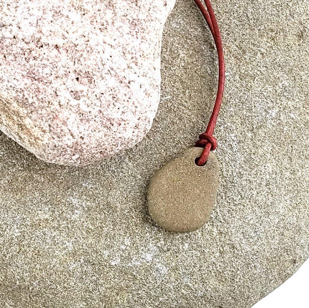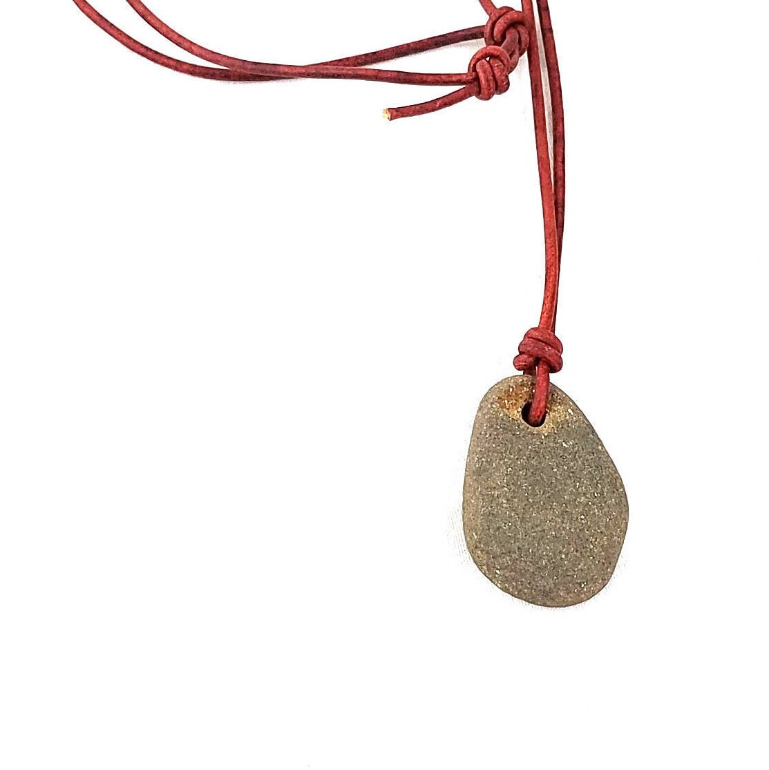 A hand gathered and drilled river rock pendant, a natural river stone necklace, with a brown gray river stone and a premium brown adjustable leather cord. This unisex river rock necklace is smooth to the touch, worn by the river I gathered it from in upstate Pennsylvania. A unique piece of rock jewelry, natural and rustic. It has been strung on a premium red-brown leather cord and tied to be adjustable. This necklace is made to be hypoallergenic, it has no added metal findings. Looking at the photos you can see the colors this stone takes on in different lighting conditions.