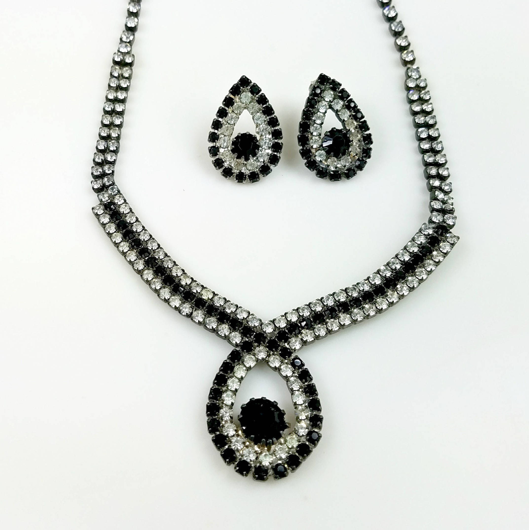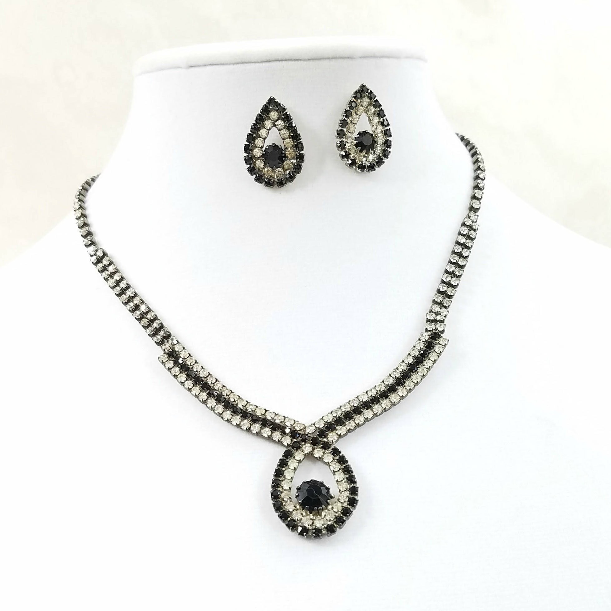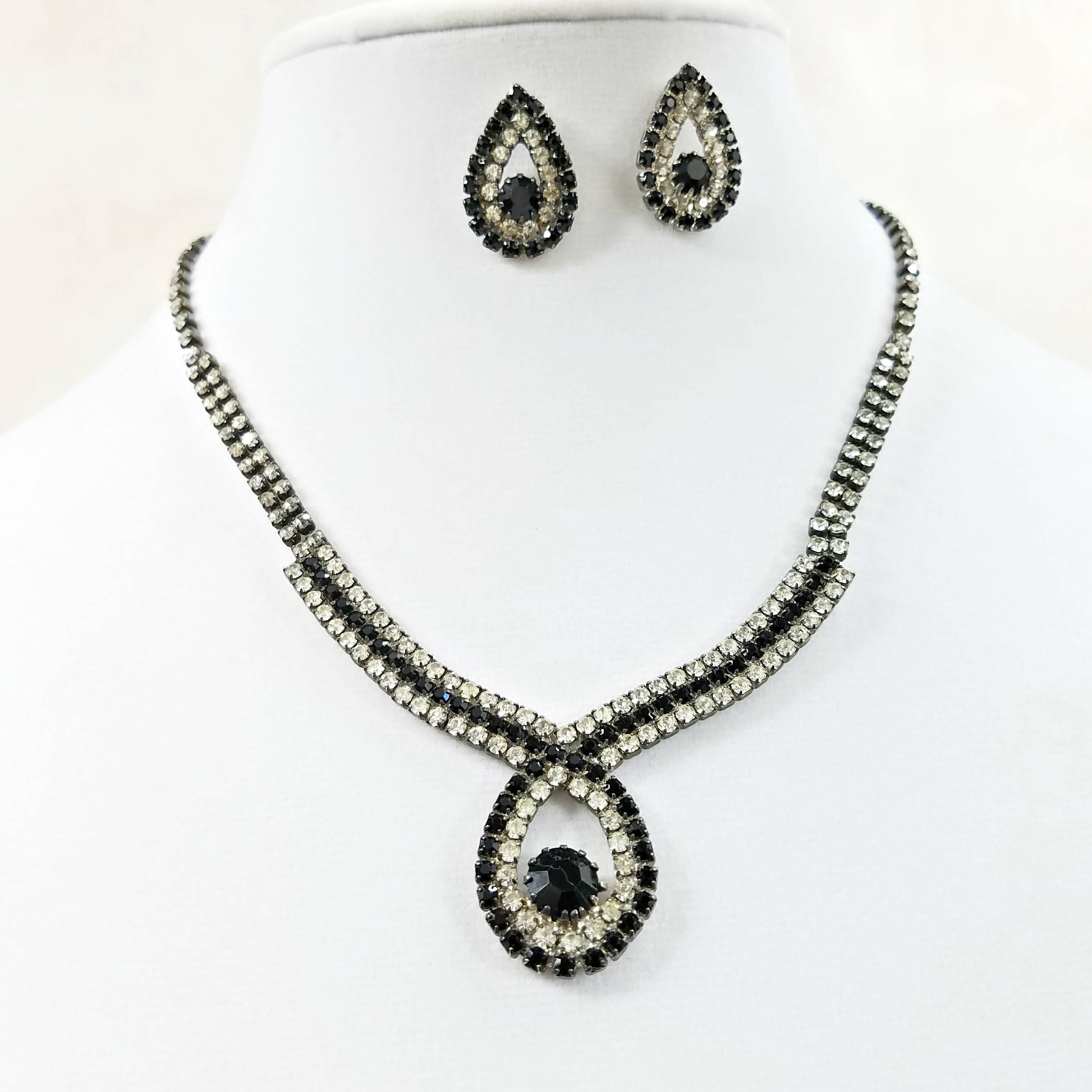 Glamorous vintage rhinestone jewelry set to match your black and white ensembles. This set has both a black and clear rhinestone necklace with one-inch drop and black and clear rhinestone earrings which are pierced earrings. An elegant wedding jewelry set, the drop necklace makes quite a statement. The stones are prong set.