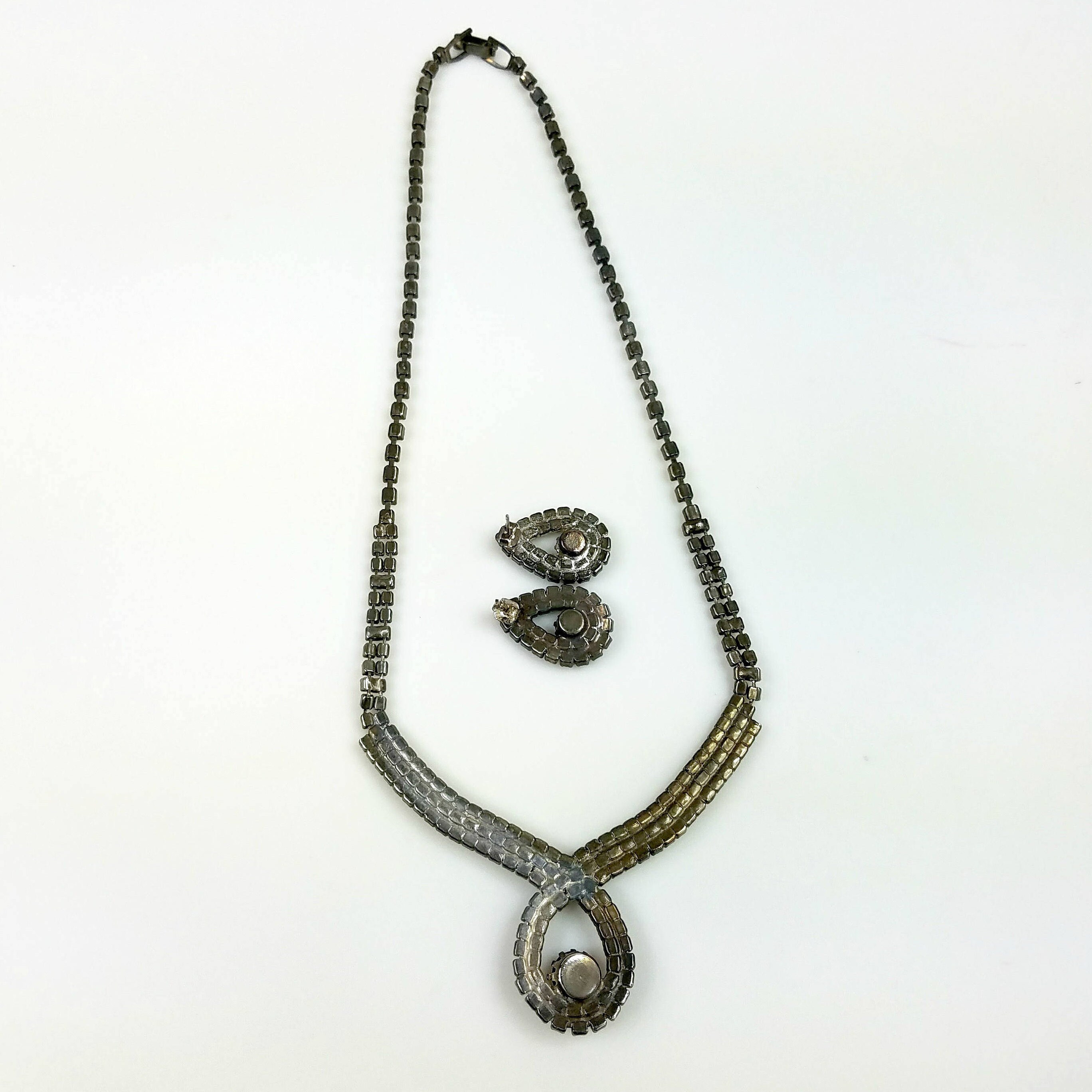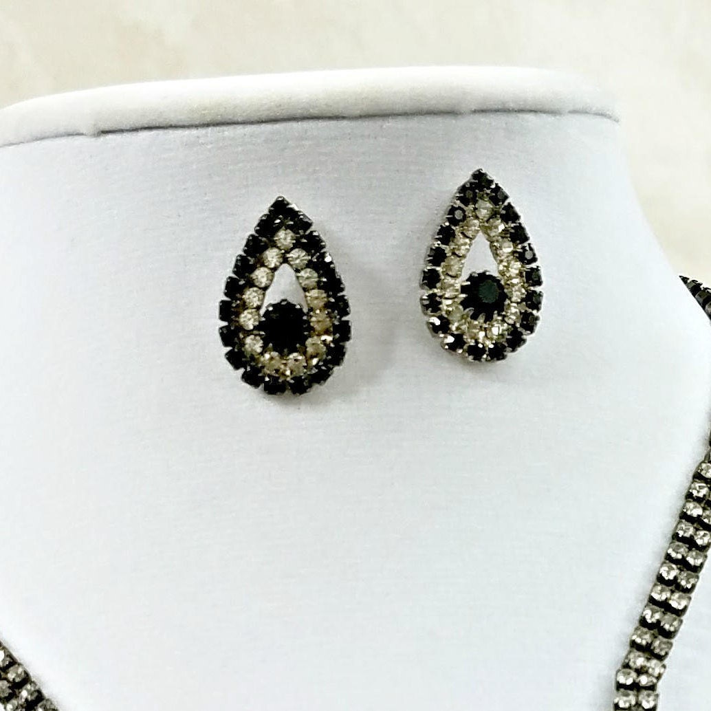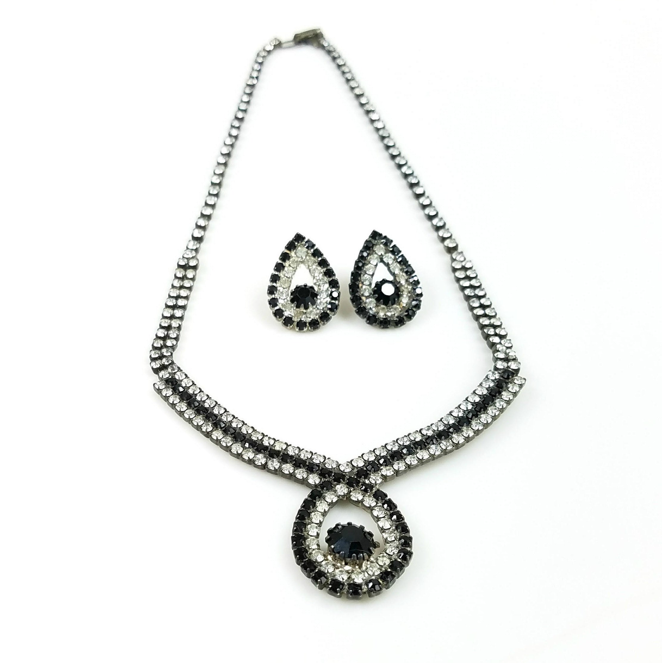 Glamorous vintage rhinestone jewelry set to match your black and white ensembles. This set has both a black and clear rhinestone necklace with one-inch drop and black and clear rhinestone earrings which are pierced earrings. An elegant wedding jewelry set, the drop necklace makes quite a statement. The stones are prong set.