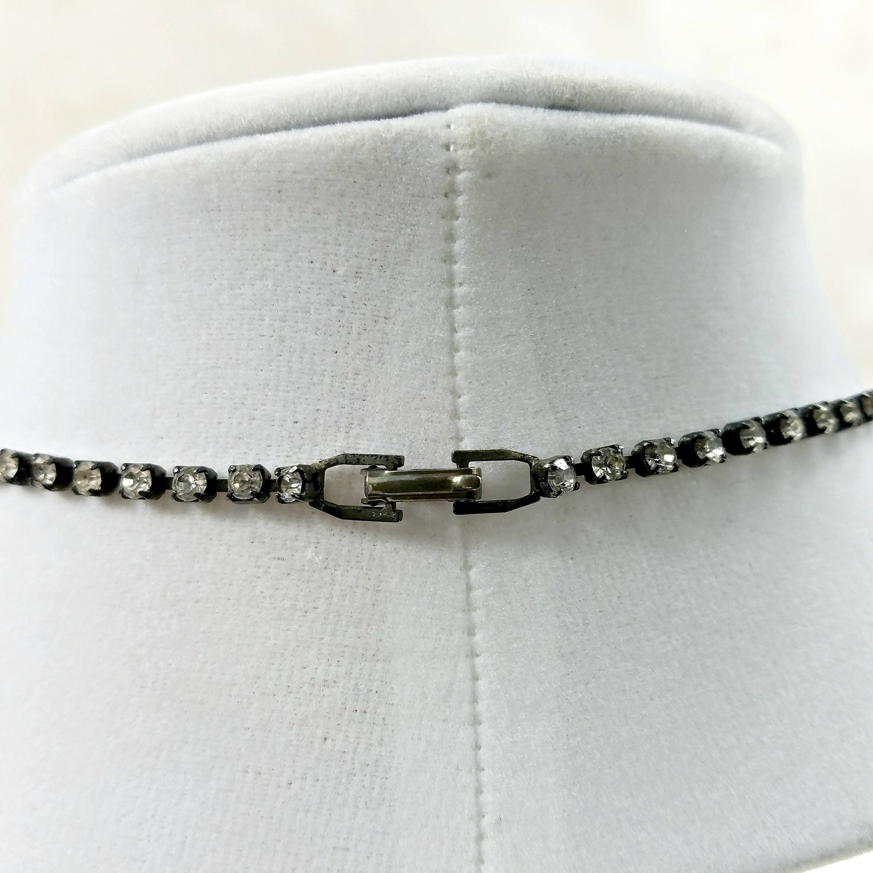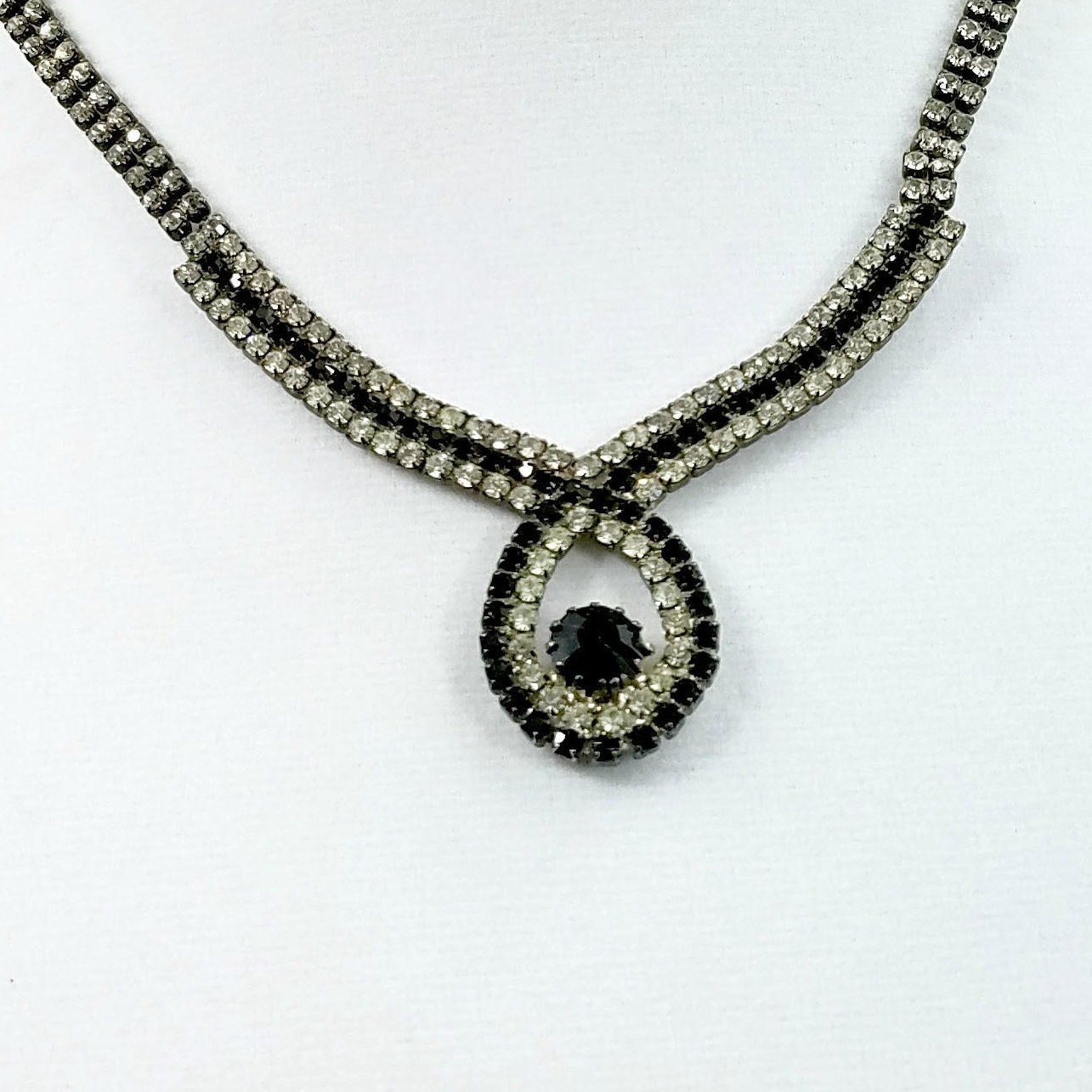 The lower section of the necklace is formed almost like a bib necklace, the lower portion of the black and clear rhinestones formed into one piece. The focal centerpiece being the 8mm center stone. The upper section of the necklace allows for movement. The necklace is 16" (40.5 cm) with a 1" (2.5 cm) drop.
