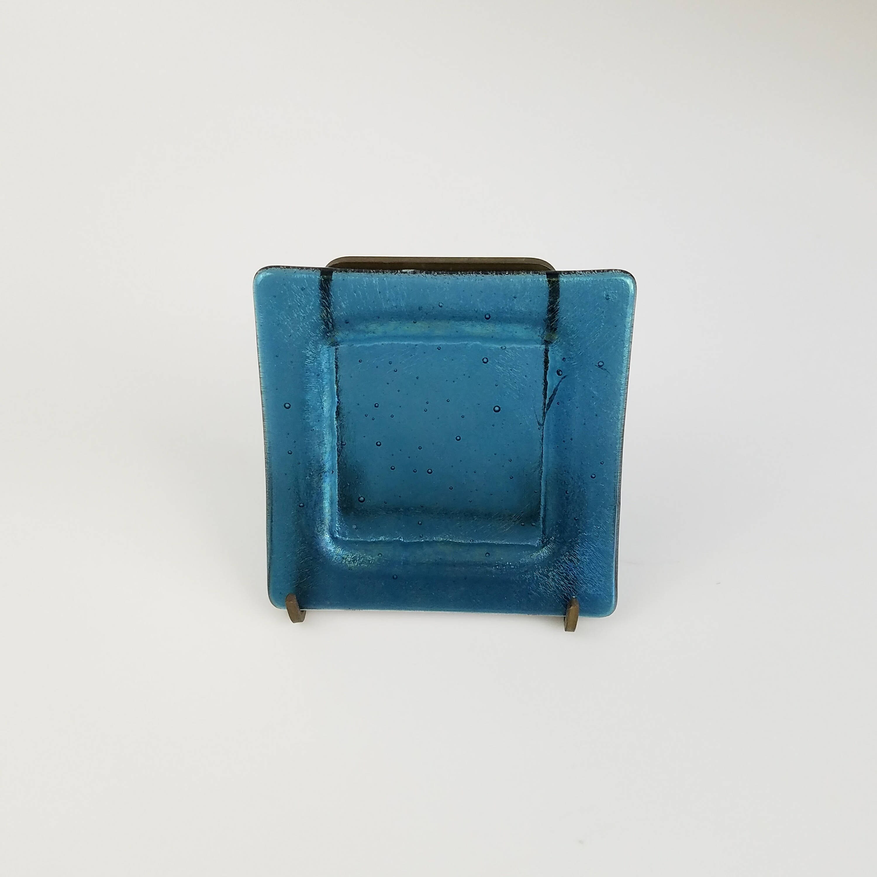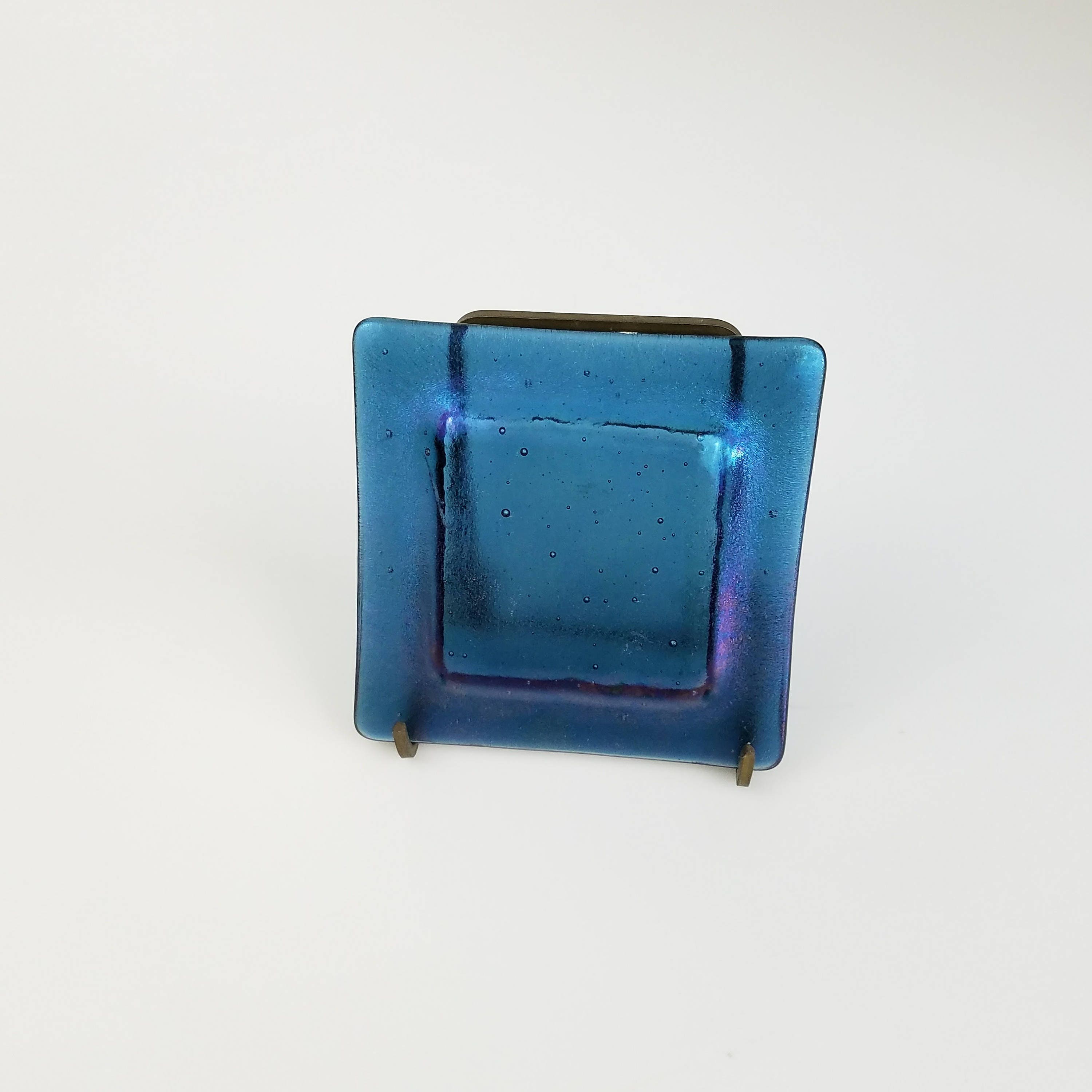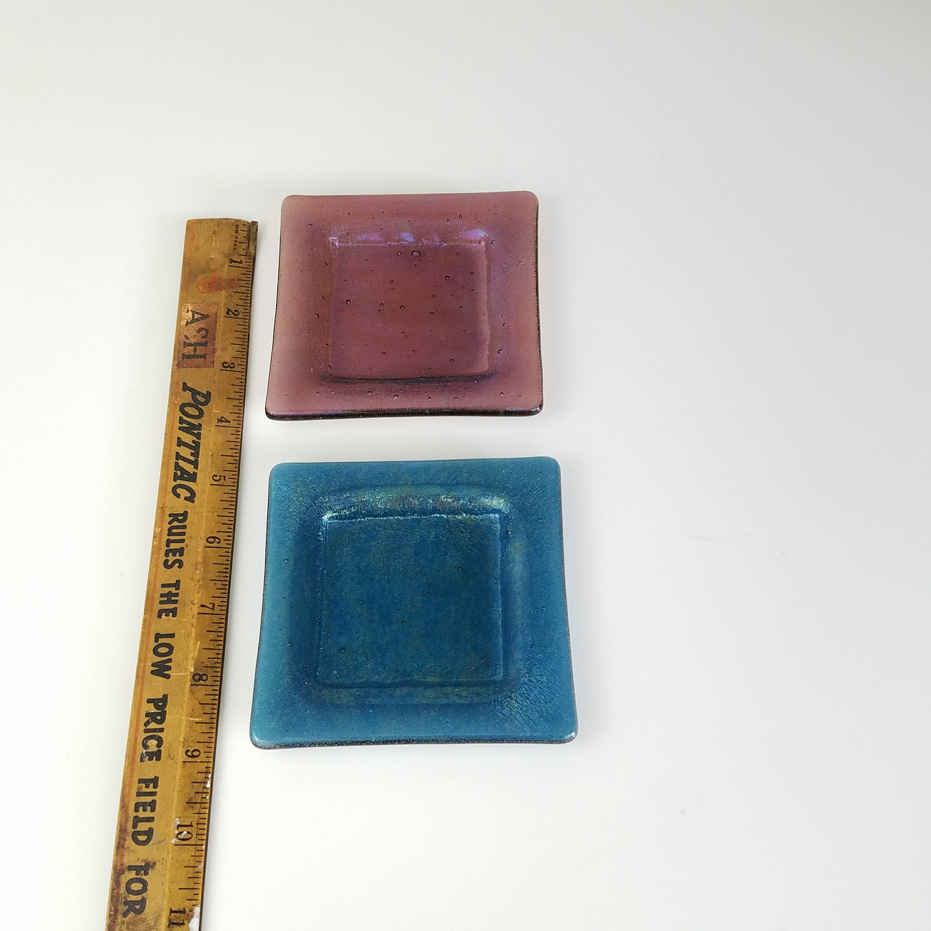 A wonderful way to add some color to your decor and include art glass in your collections. These small art glass plates are blue and pink fused glass square plates. They are handmade glass plates one in a gorgeous blue color and one in a lovely rose pink color.