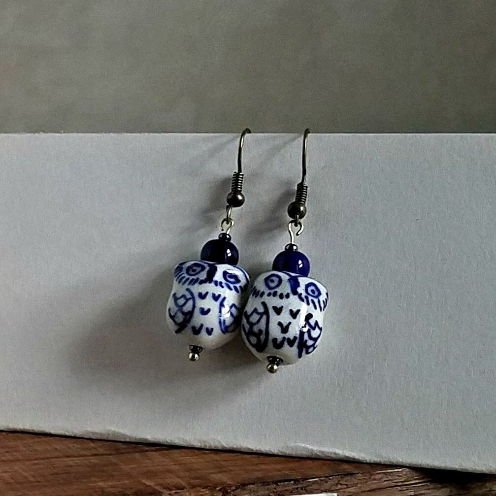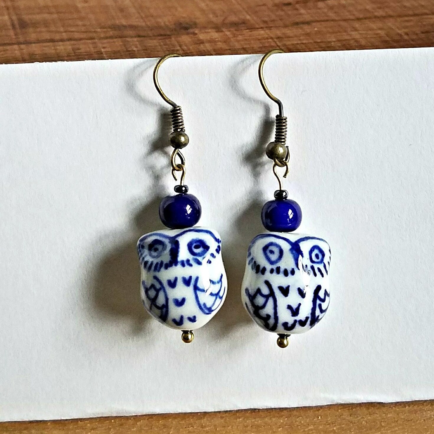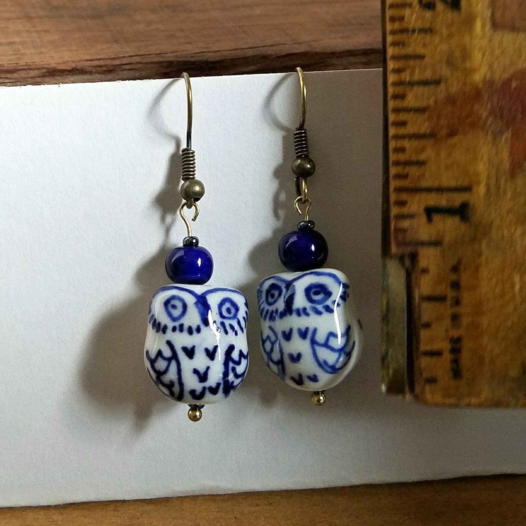 Adorable owl earrings - cute little porcelain owl earrings. The hand-painted earrings, blue owl earrings, make fabulous animal lovers gifts. Owl jewelry as a gift for her on her birthday, mothers day, or any holiday will put a smile on her face. The darling porcelain owls are blue and white, made in the delft blue style of painted porcelain. They dangle from brass ear wires to the length of 1.75" (4.5 cm).