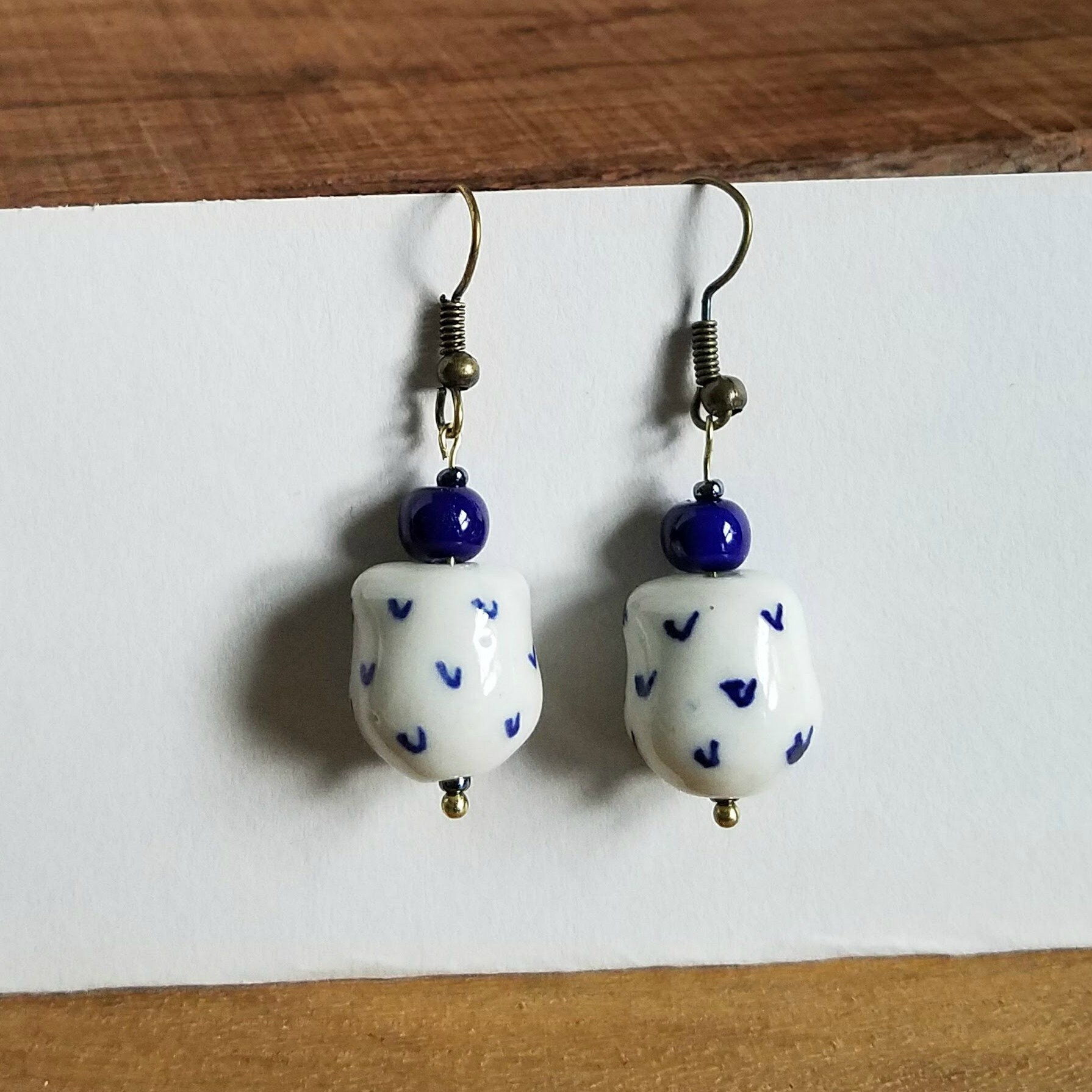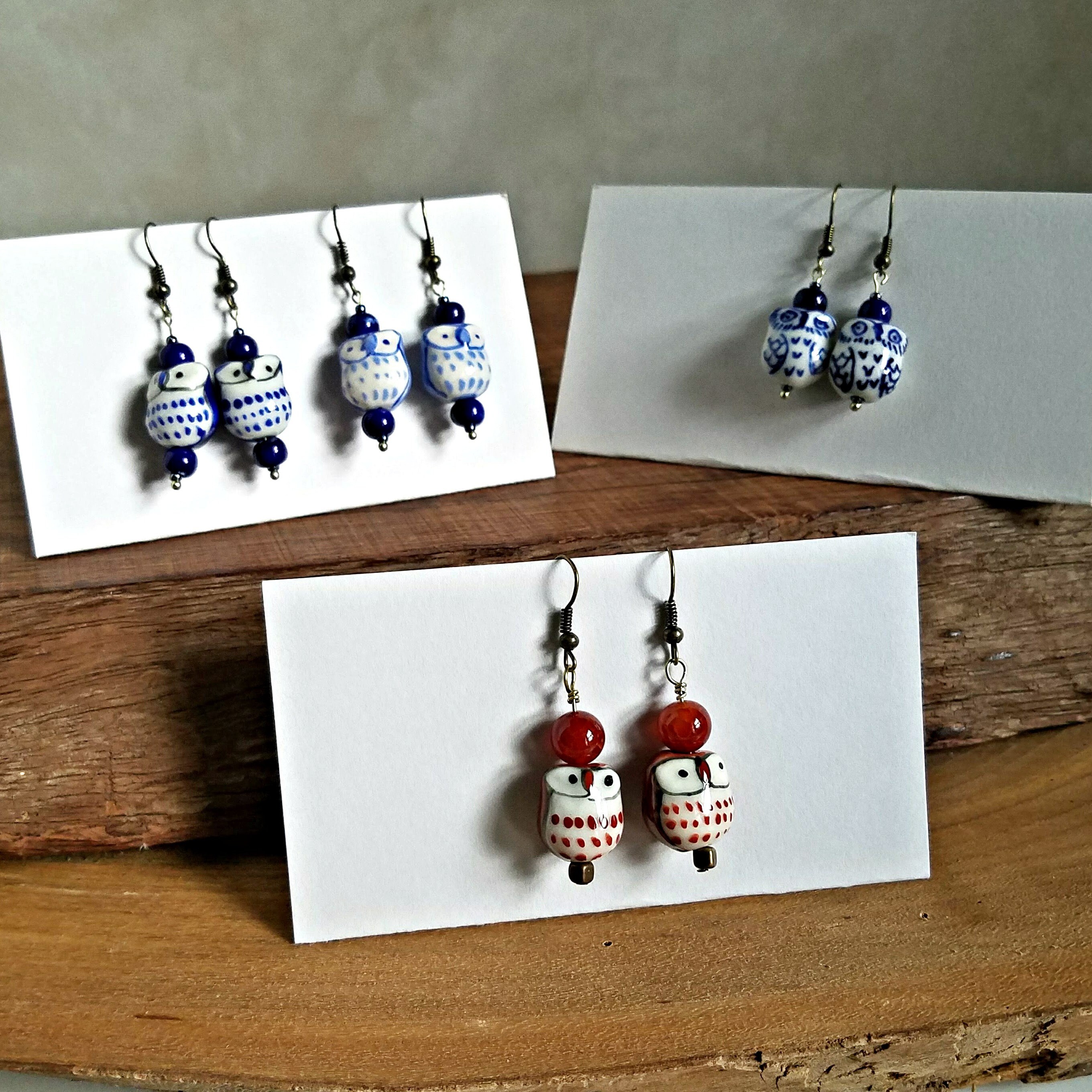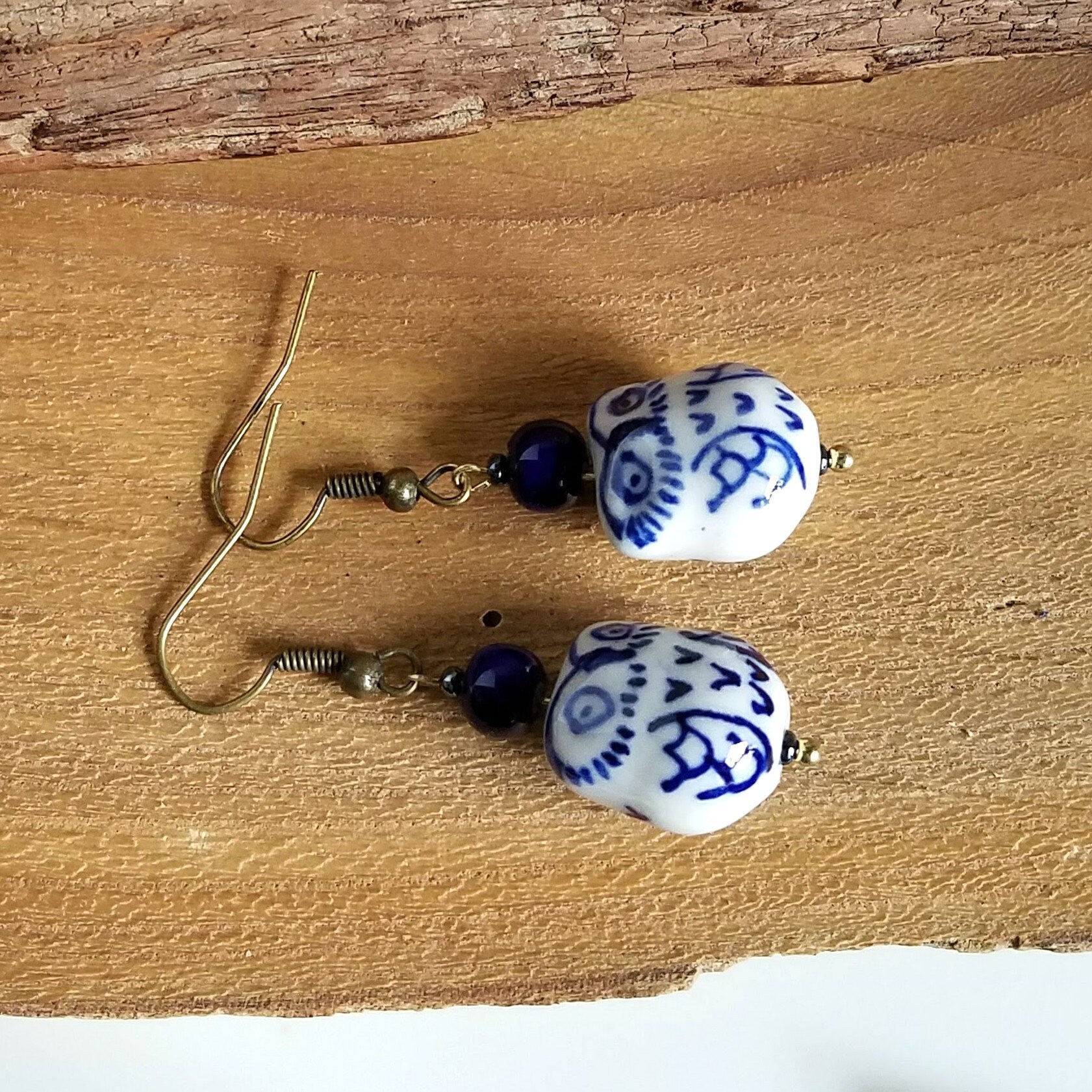 Adorable owl earrings - cute little porcelain owl earrings. The hand-painted earrings, blue owl earrings, make fabulous animal lovers gifts. Owl jewelry as a gift for her on her birthday, mothers day, or any holiday will put a smile on her face. The darling porcelain owls are blue and white, made in the delft blue style of painted porcelain. They dangle from brass ear wires to the length of 1.75" (4.5 cm).