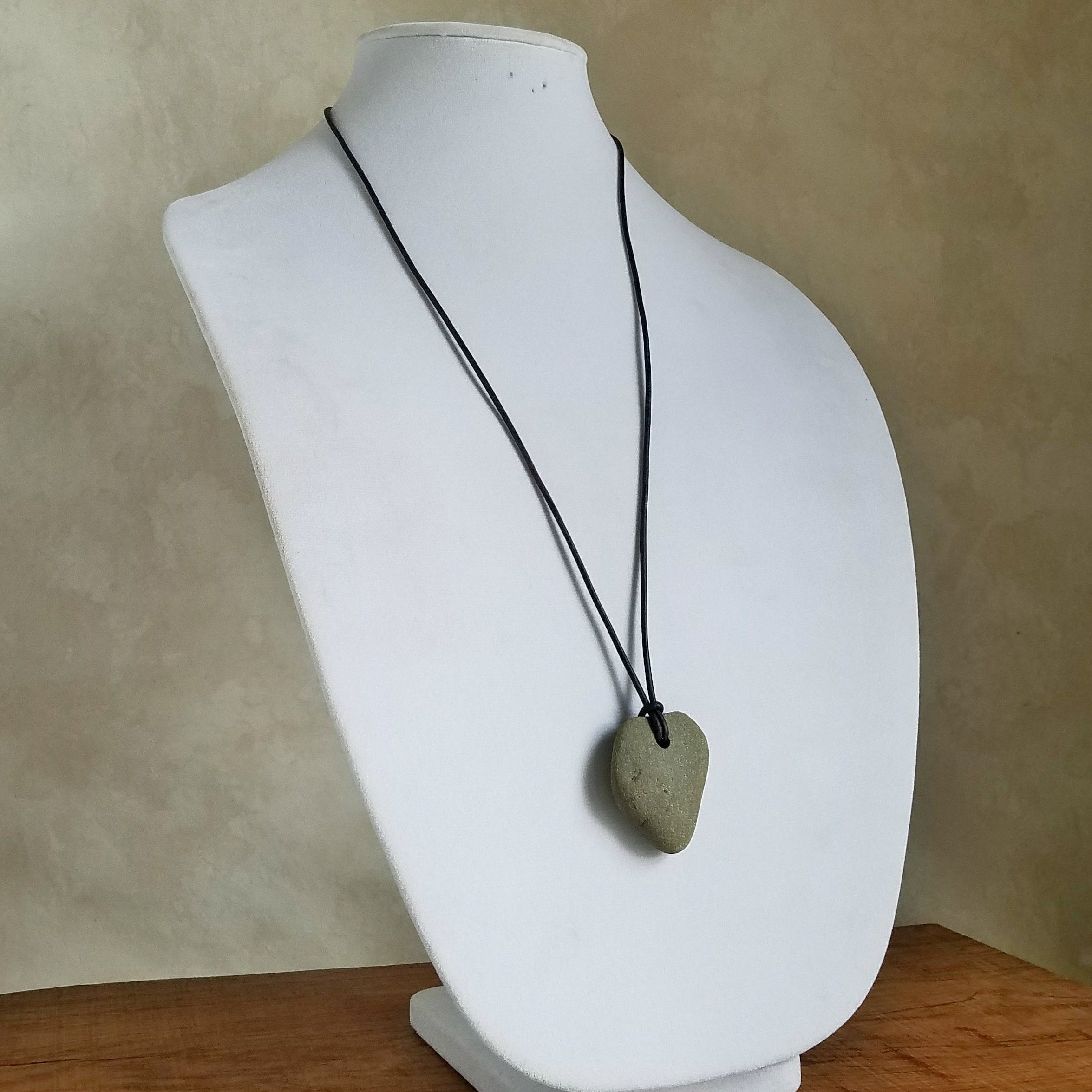 This unique rock necklace is made with pacific blue leather cord and hand-gathered and drilled stone pendant. The stone is naturally shaped like a heart making this unique piece of river rock jewelry a wonderful gift for someone you love. The heart river stone necklace is a natural necklace, a hypoallergenic long adjustable necklace made with no metal.