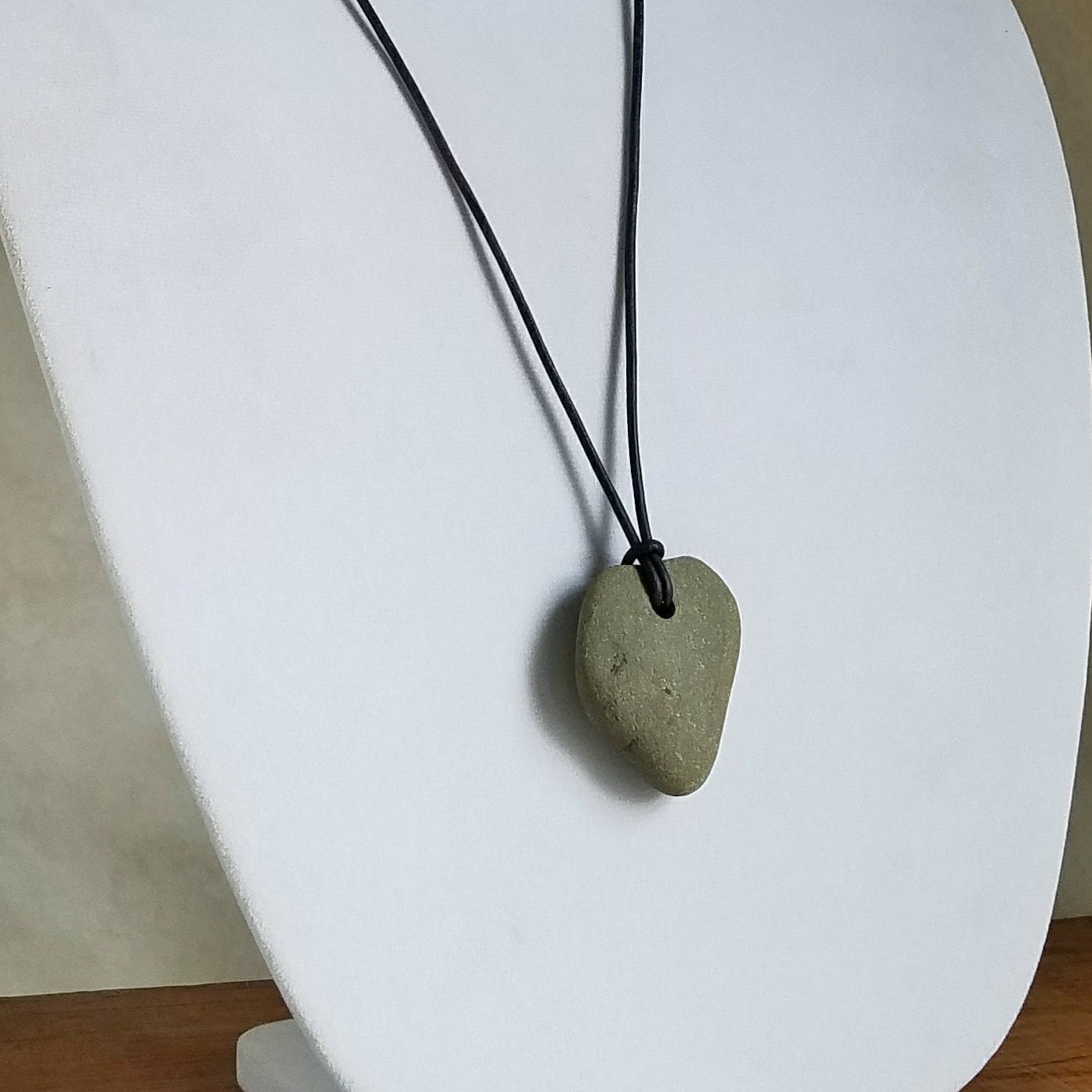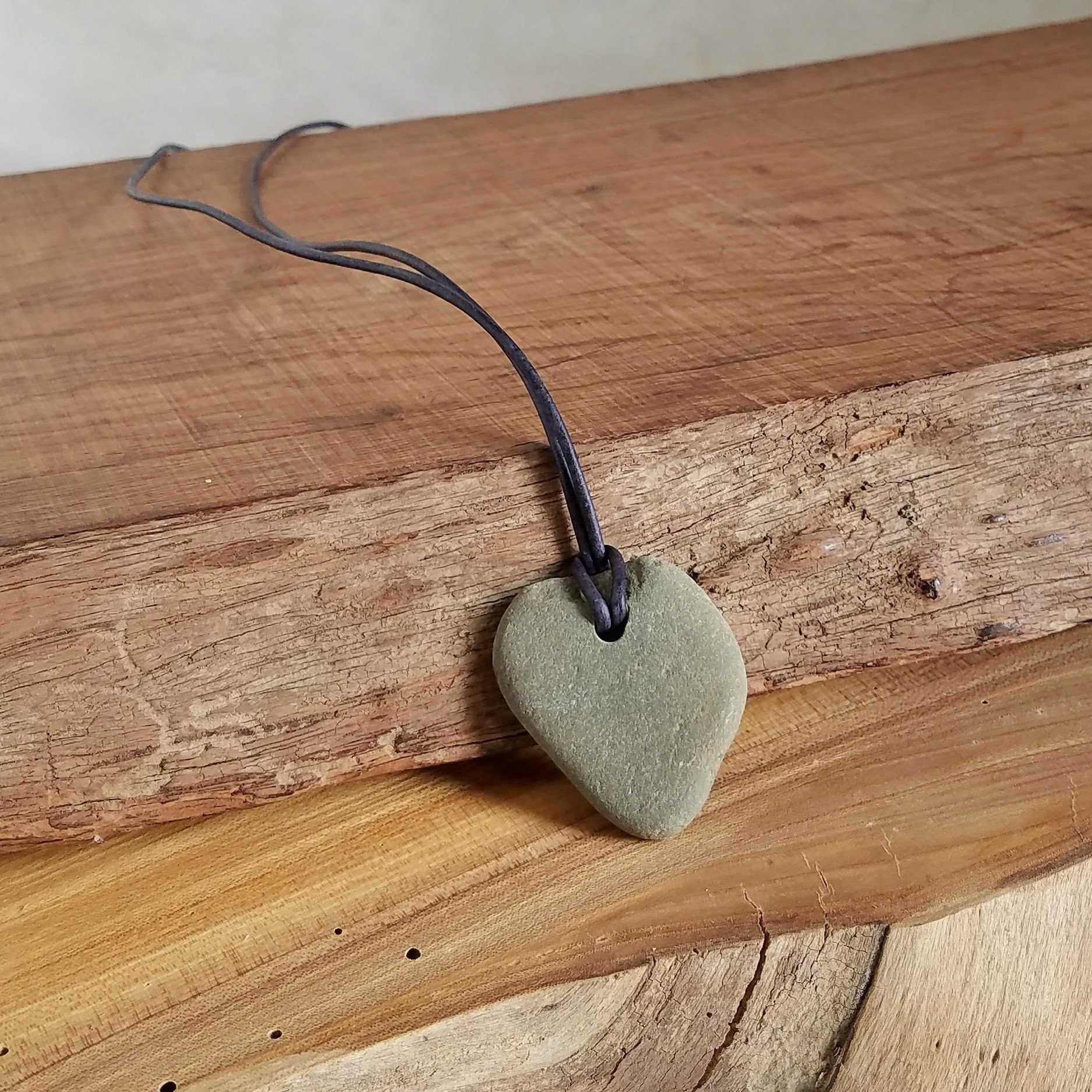 The stone was hand-chosen by me from a river, washed and drilled, then the premium leather cord was added, tied to be adjustable from 30" (76 cm). The combination makes an OOAK boho necklace, rustic unisex jewelry in a long pendant. The stone measures 1.75" (44 mm) x 1.5" (39mm).