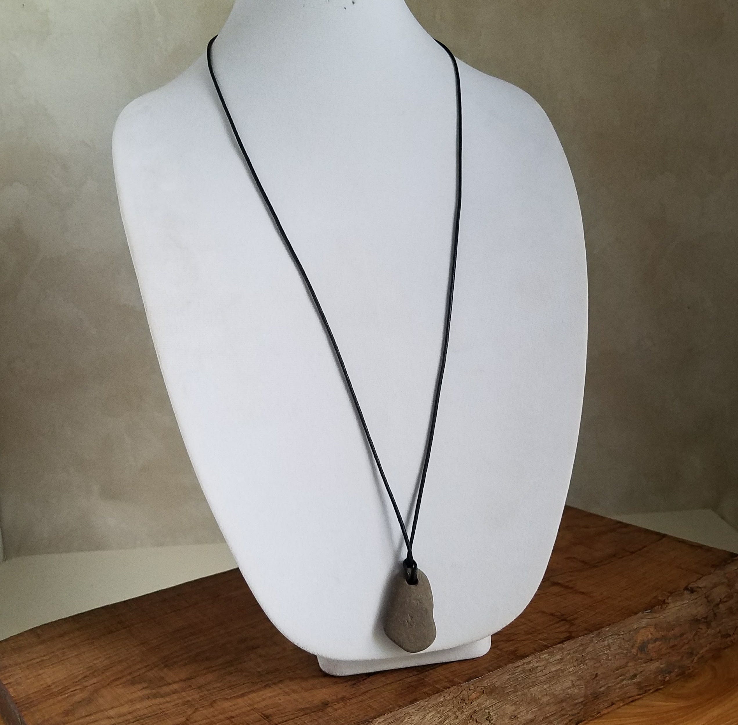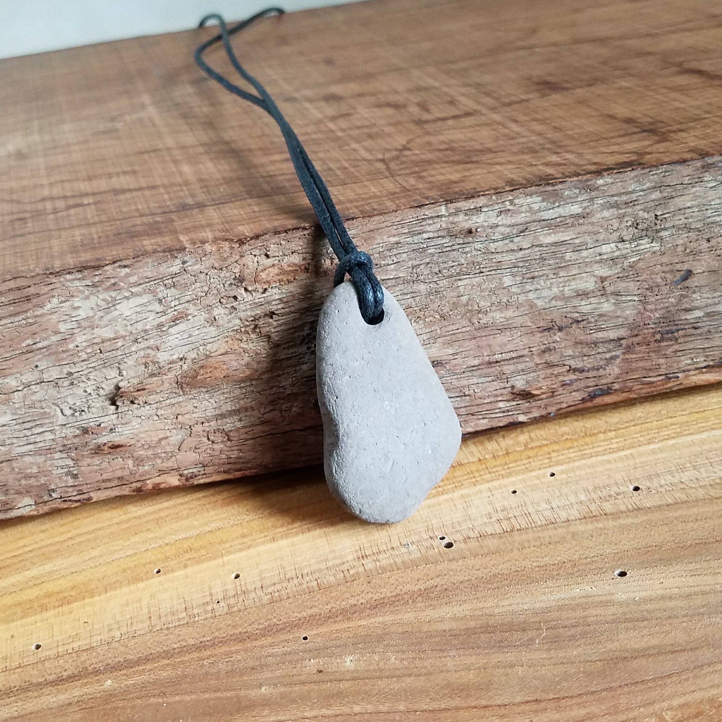 A unique hand gathered and drilled gray river rock pendant. The natural stone hangs from an adjustable waxed cotton cord measuring 33" at its longest length. It is a long vegan necklace with a natural river stone pendant. An OOAK piece of hypoallergenic river stone jewelry has a gray river rock measuring 1.75" x 1.2" (45mm x 28mm). This yoga rock necklace is on a 33" (84cm) adjustable black vegan waxed cotton cord.