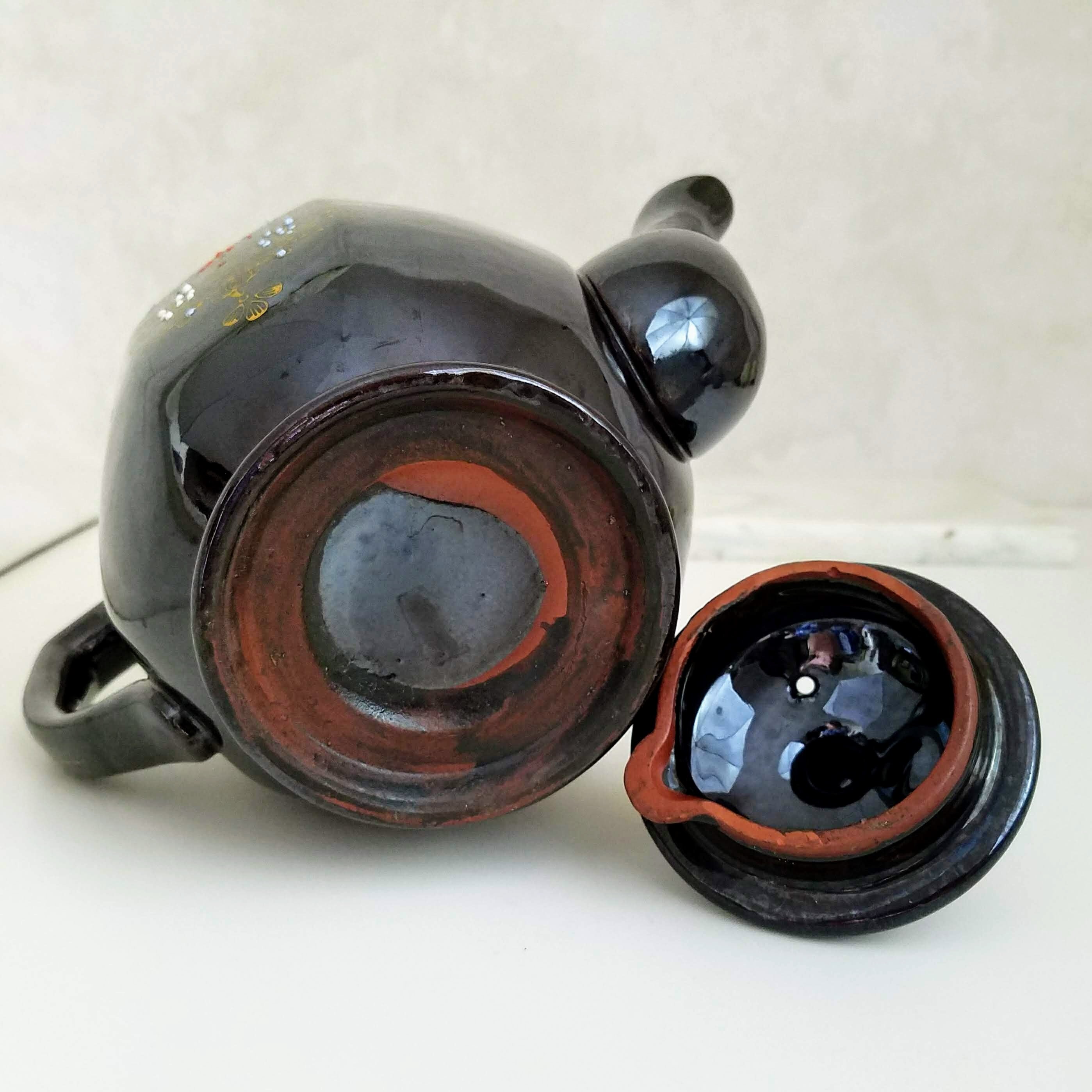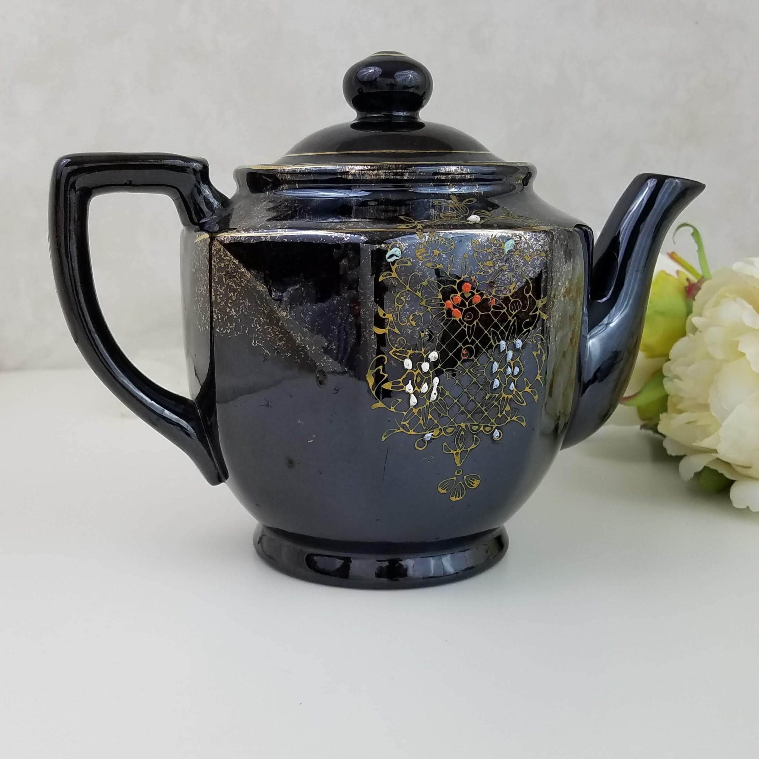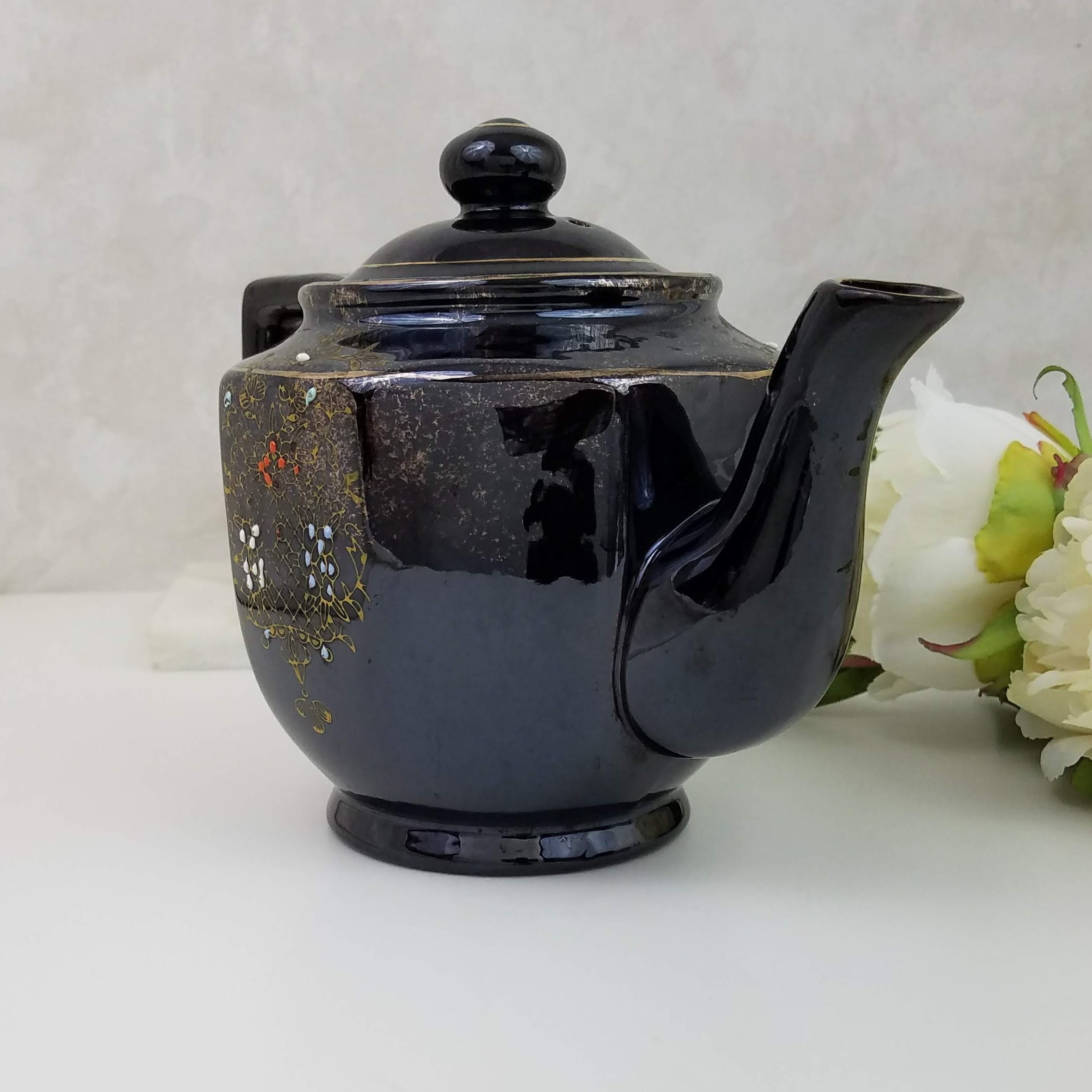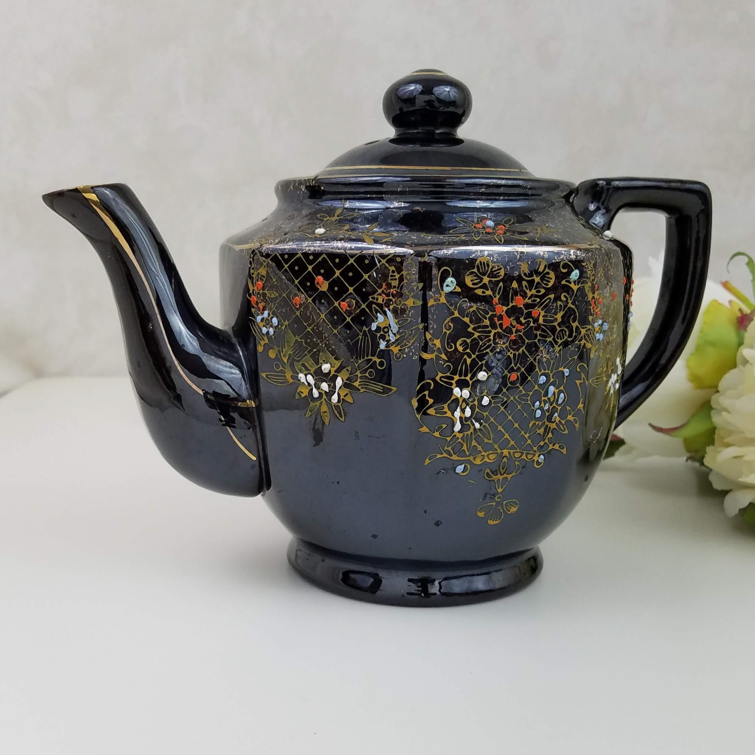 A fabulous vintage teapot, this brown betty hand painted teapot with 8 sides is painted with a gold design and red white and blue highlights. The vintage red clay black 4 cup teapot has no makers marks. It will make a wonderful addition to your vintage farmhouse kitchen decor. This vintage Japanese teapot measures 9.75" x 5.25" x 6.5" (22.5 cm x13.5 cm 16.5 cm).