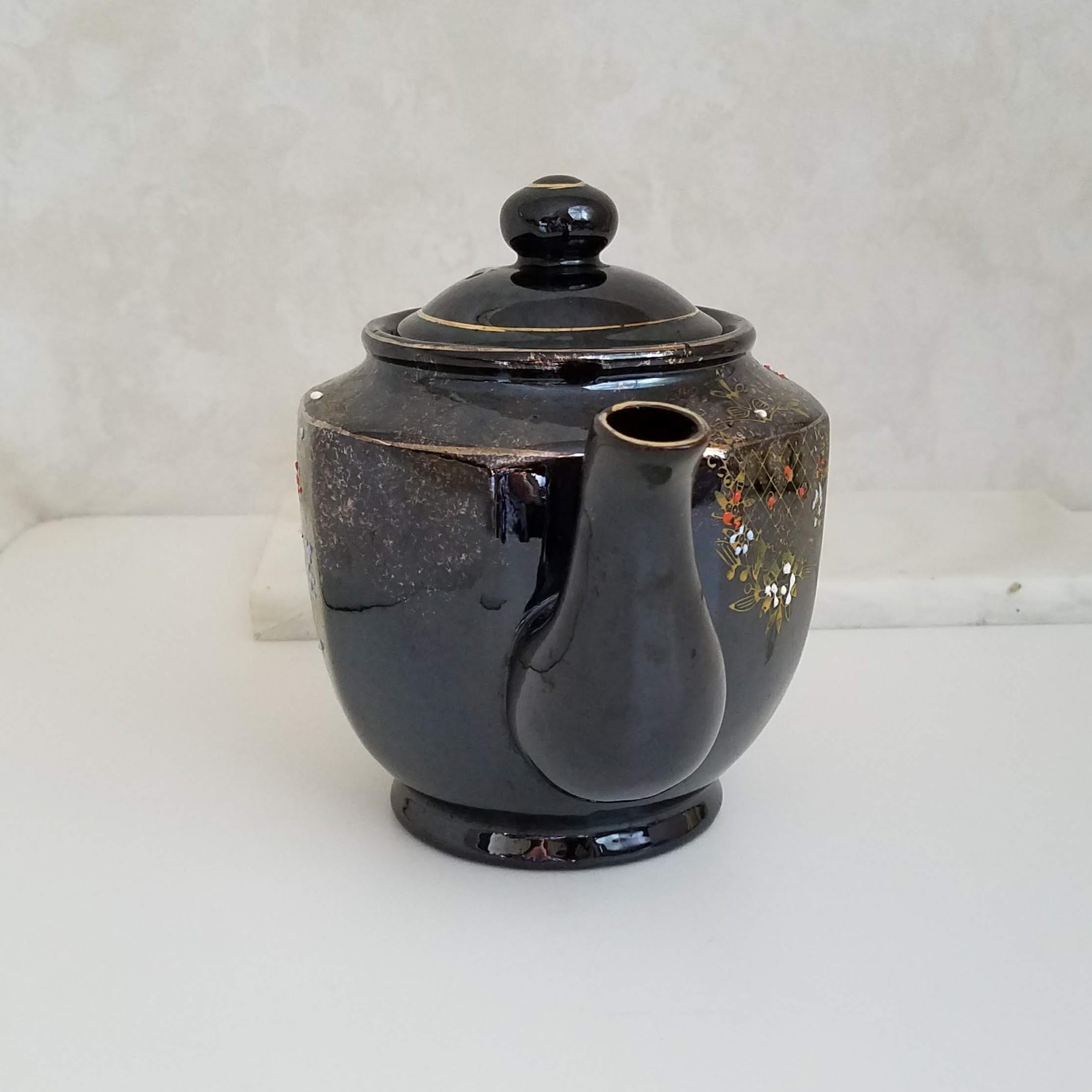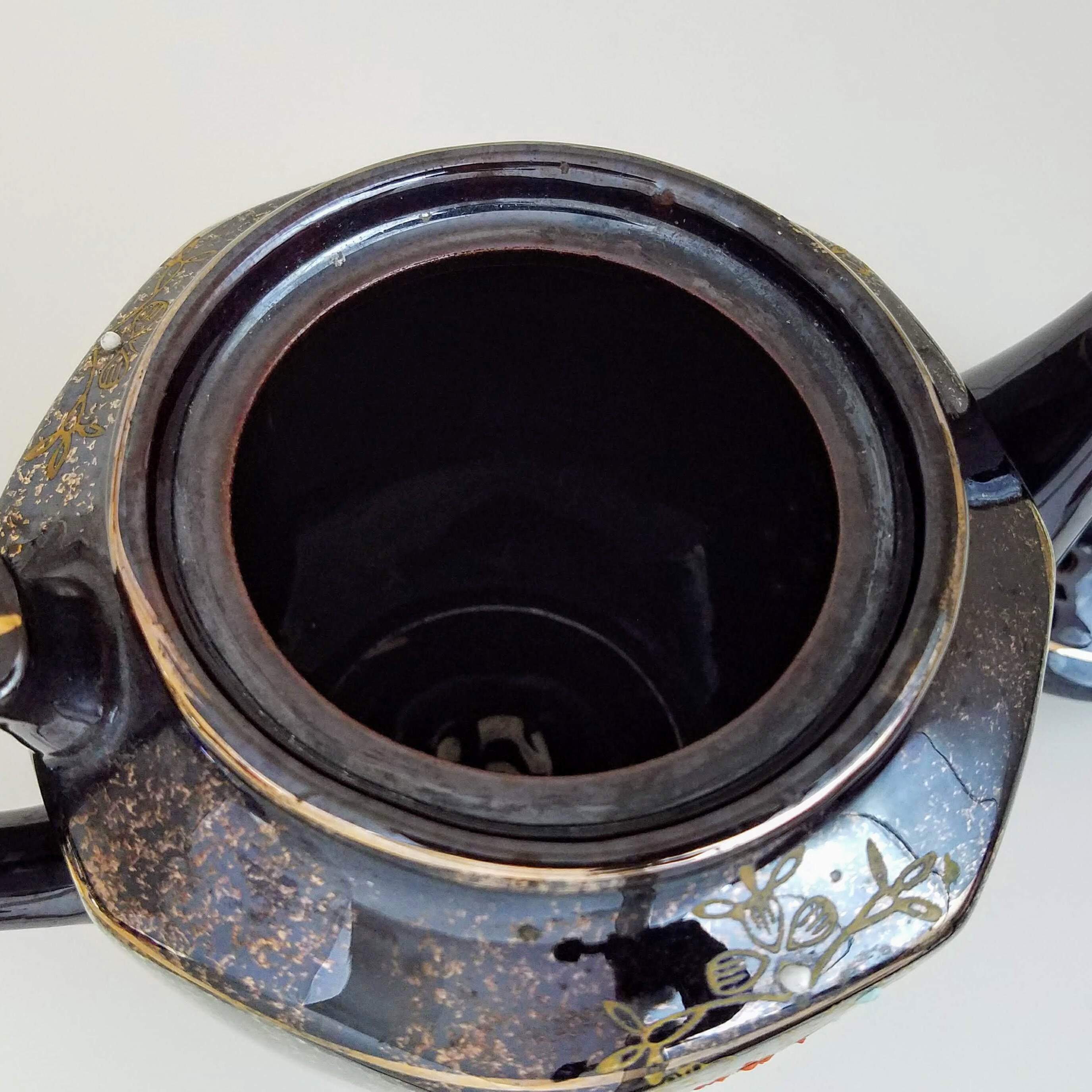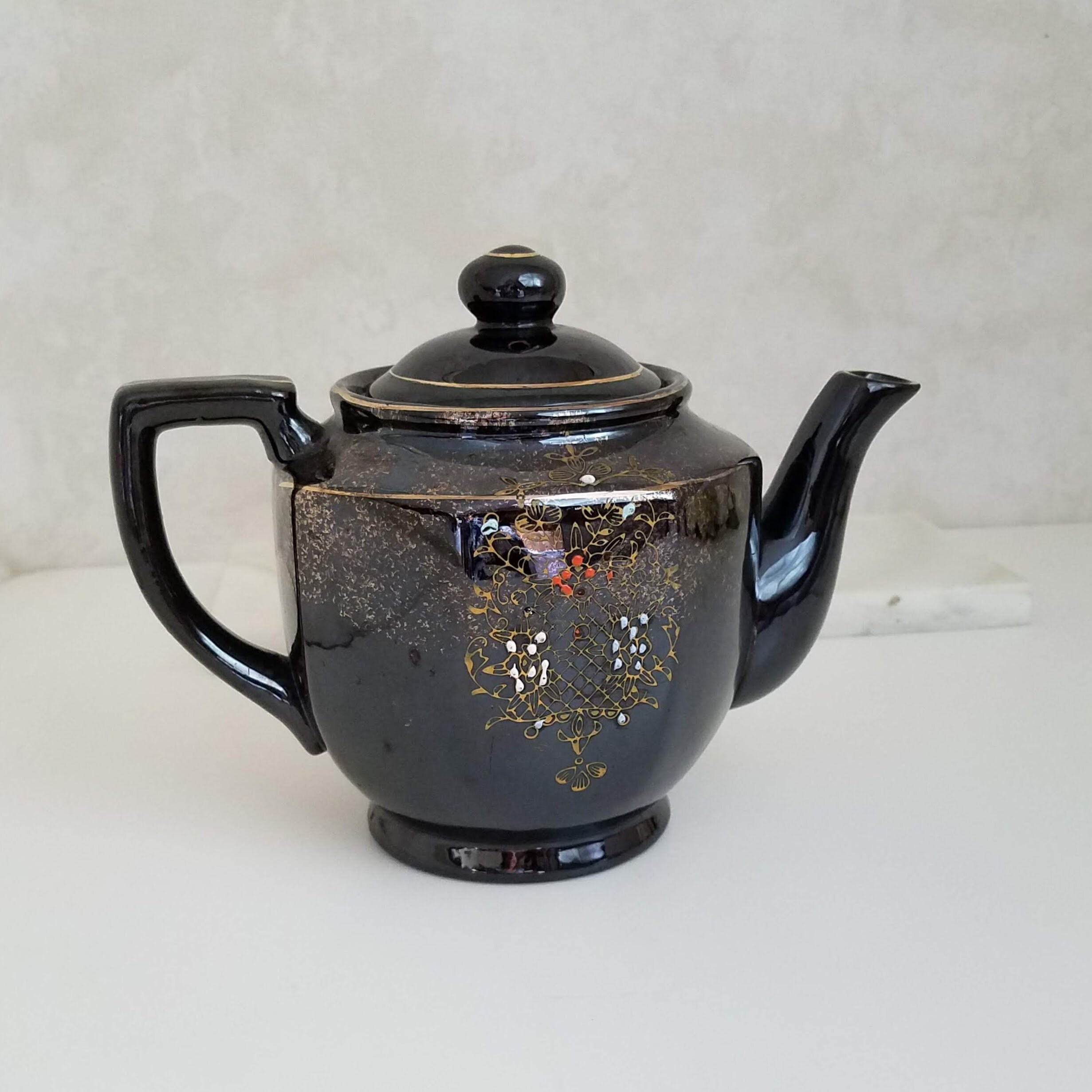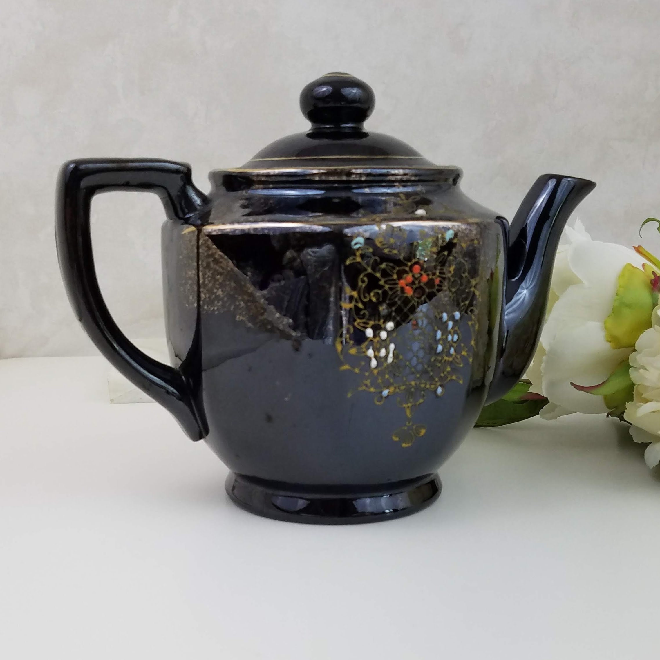 A fabulous vintage teapot, this brown betty hand painted teapot with 8 sides is painted with a gold design and red white and blue highlights. The vintage red clay black 4 cup teapot has no makers marks. It will make a wonderful addition to your vintage farmhouse kitchen decor. This vintage Japanese teapot measures 9.75" x 5.25" x 6.5" (22.5 cm x13.5 cm 16.5 cm).