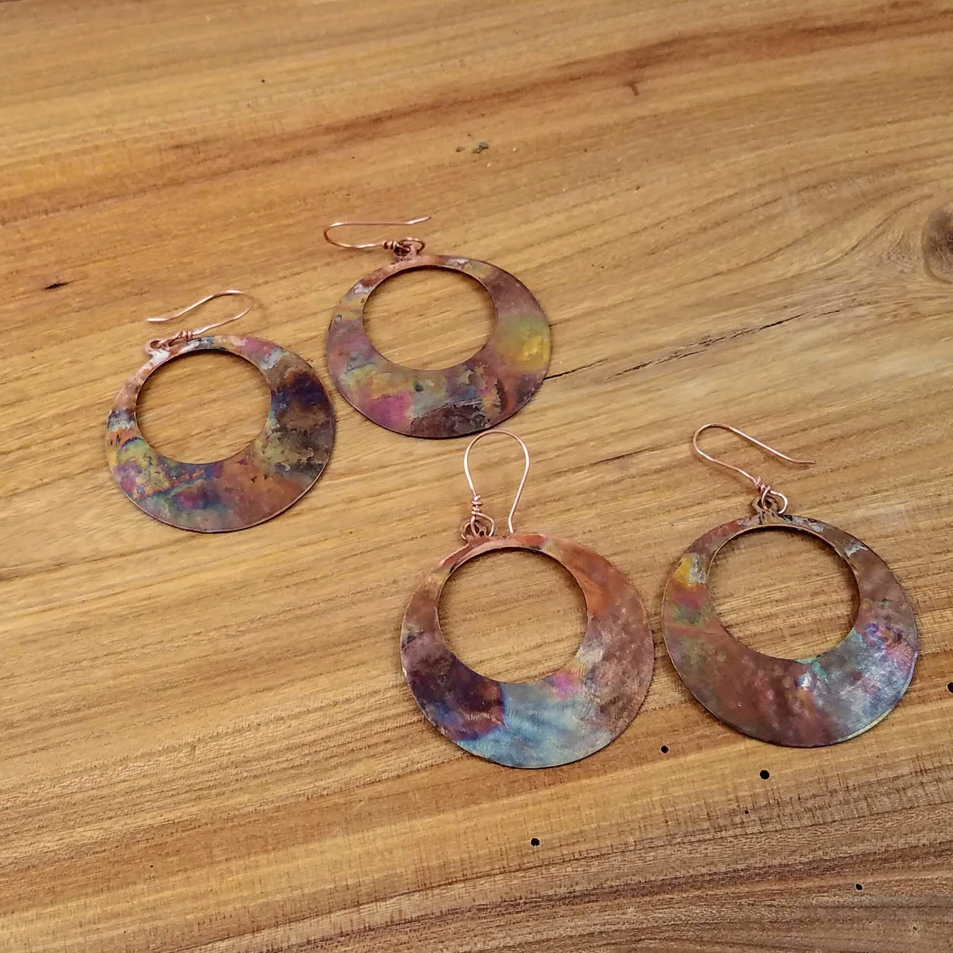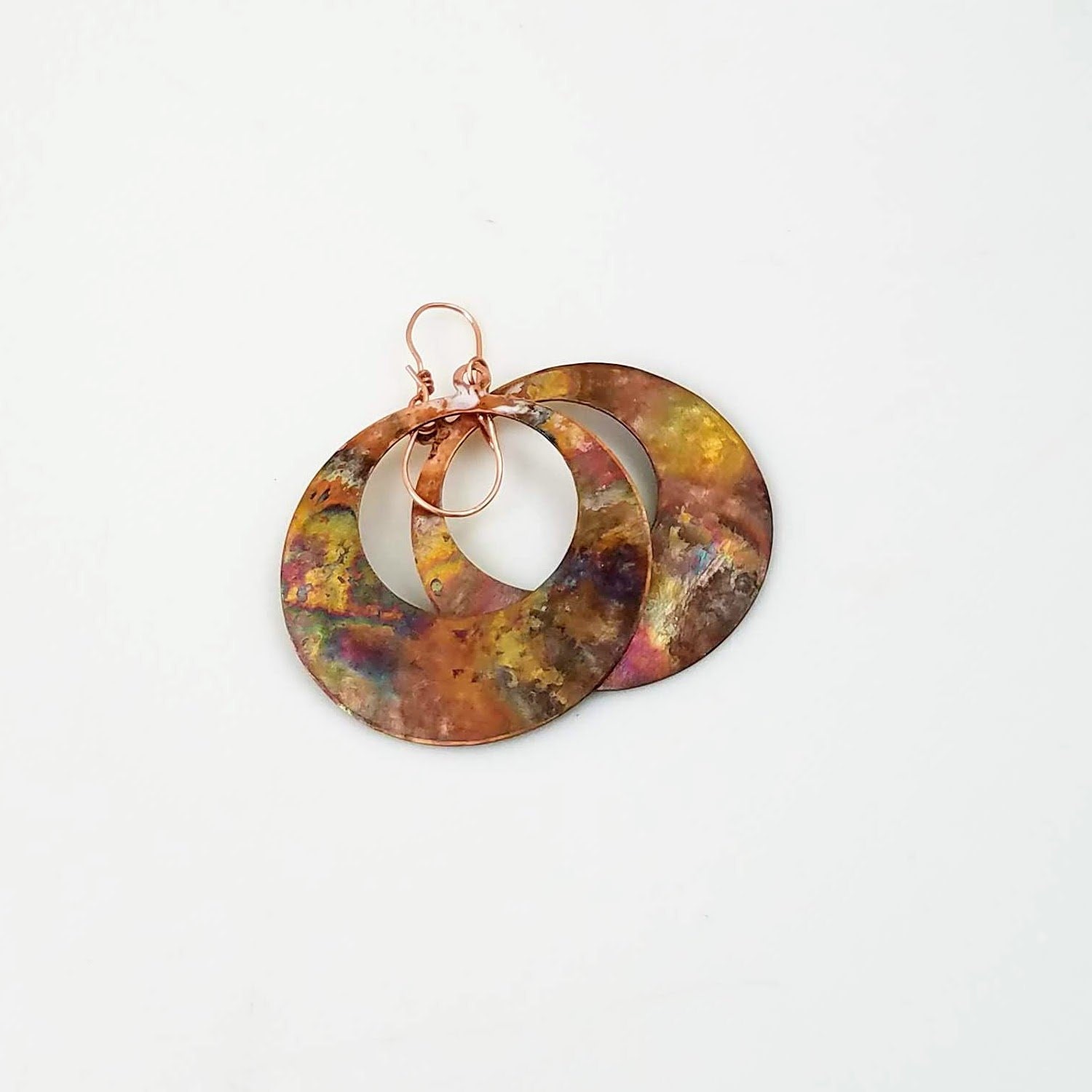 Gorgeous copper statement earrings, bohemian sunset earrings. These are hand forged, hammered, textured, flame painted copper earrings. Each copper disk measures 1 5/8" (40mm) and dangle 2 1/4" (58mm) in length. Each colorful earring is reflective of the colors of a sunset. The warm glow of the copper enhanced by flame painting. Each earring was hand polished with renaissance wax to help preserve the colors.