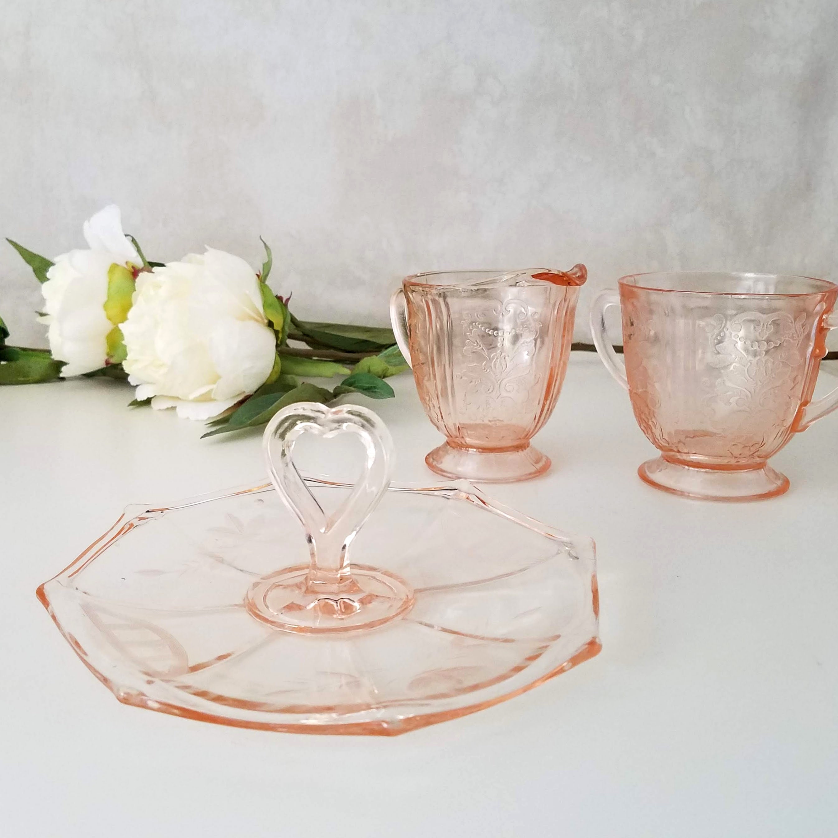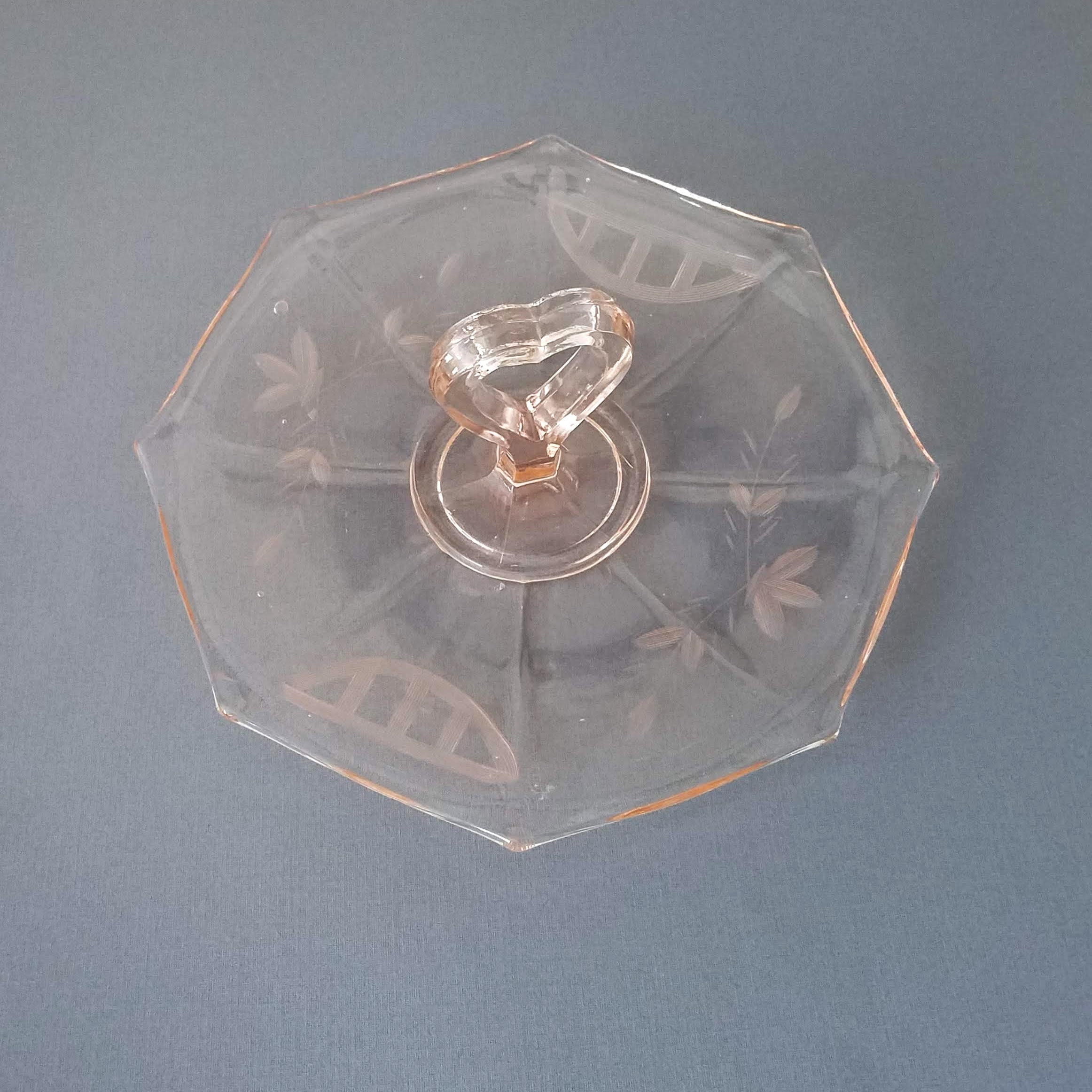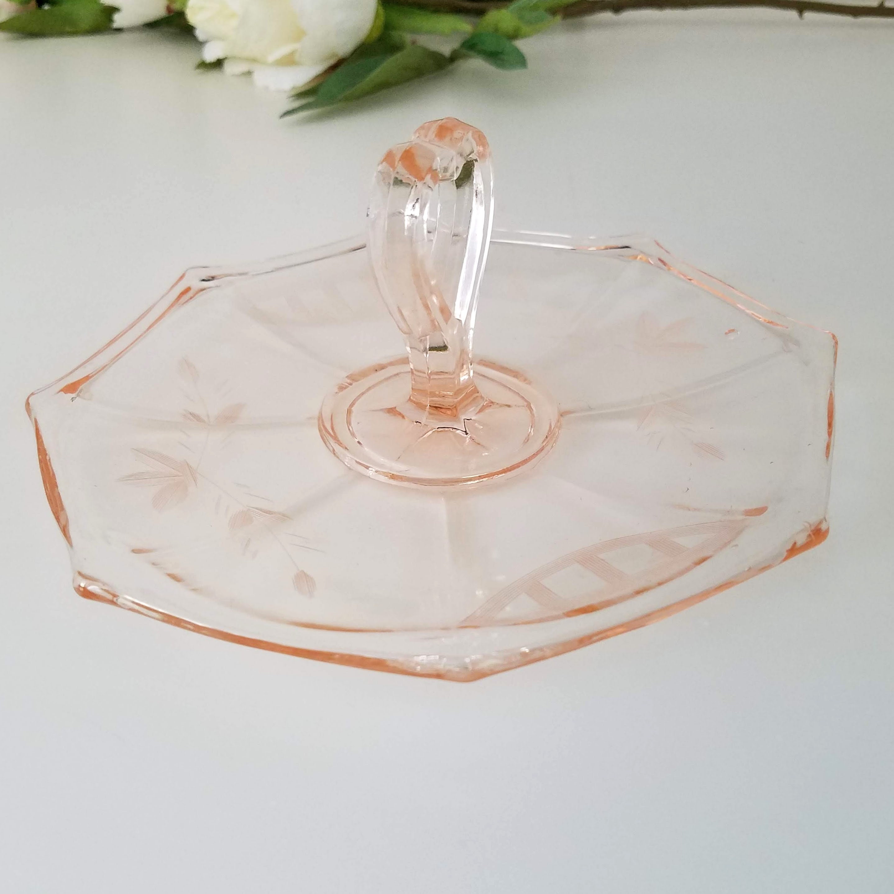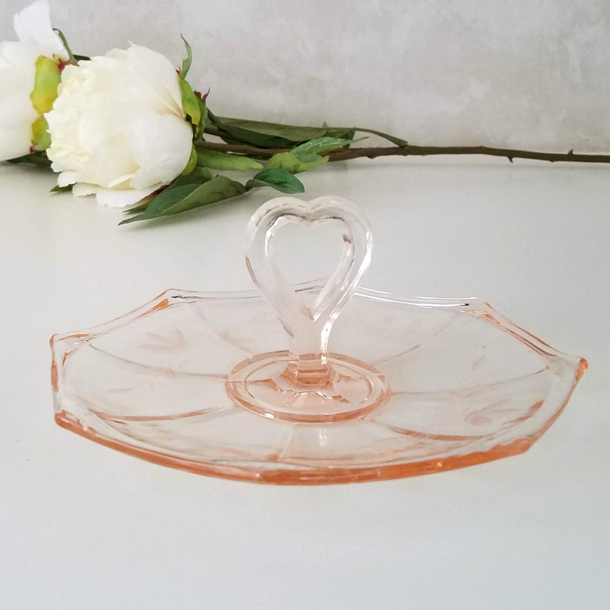 Pink Depression Glass plate: Pressed glass plate with a heart shaped handle and etched design of leaves and bridges. Vintage cottage chic decor, a light pink candy or pastry tray and lovely piece for a bridal shower or mothers day gift. This tray measures 6.25" wide (16 cm) and 2.75" tall (7 cm). There is one scratch on the underside of a corner. Air bubbles are original to the piece.