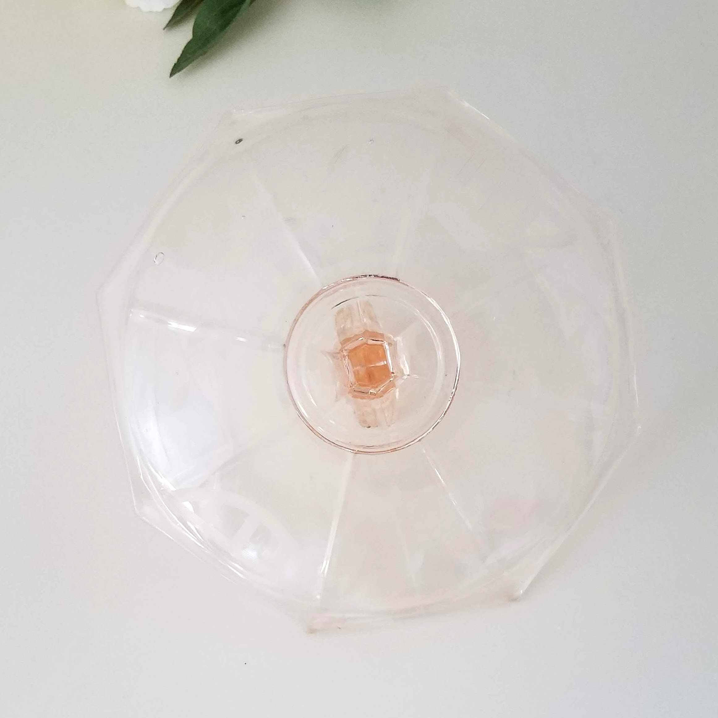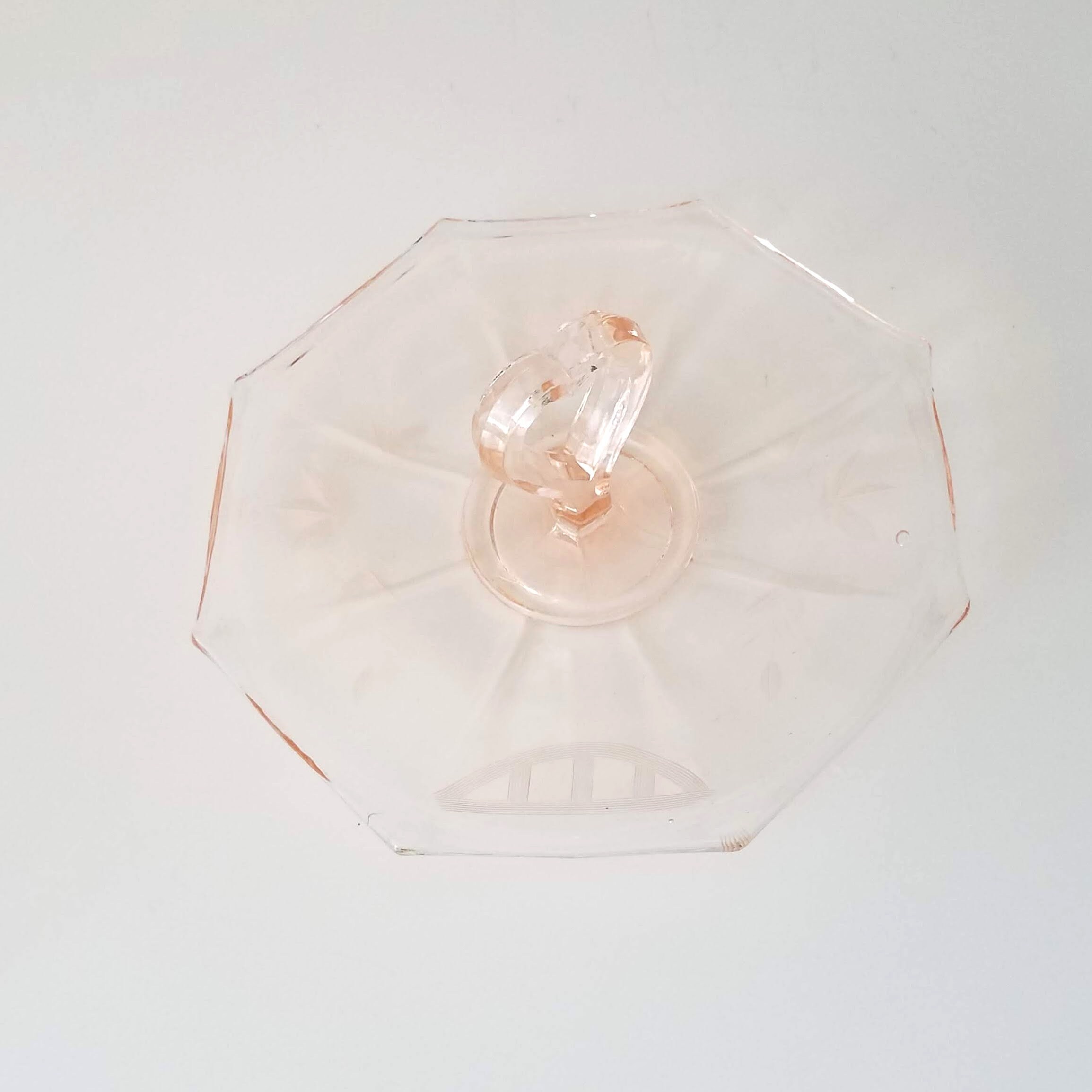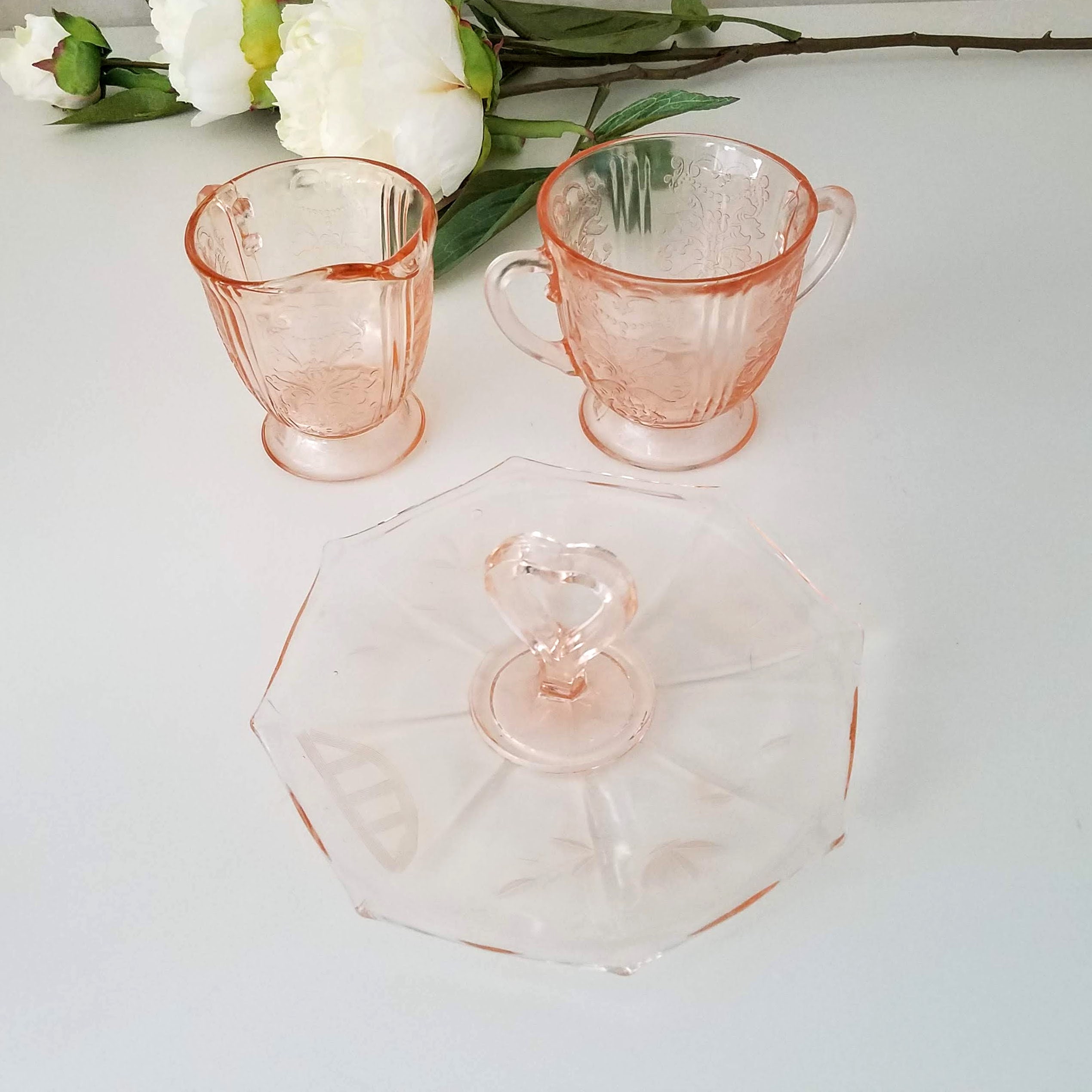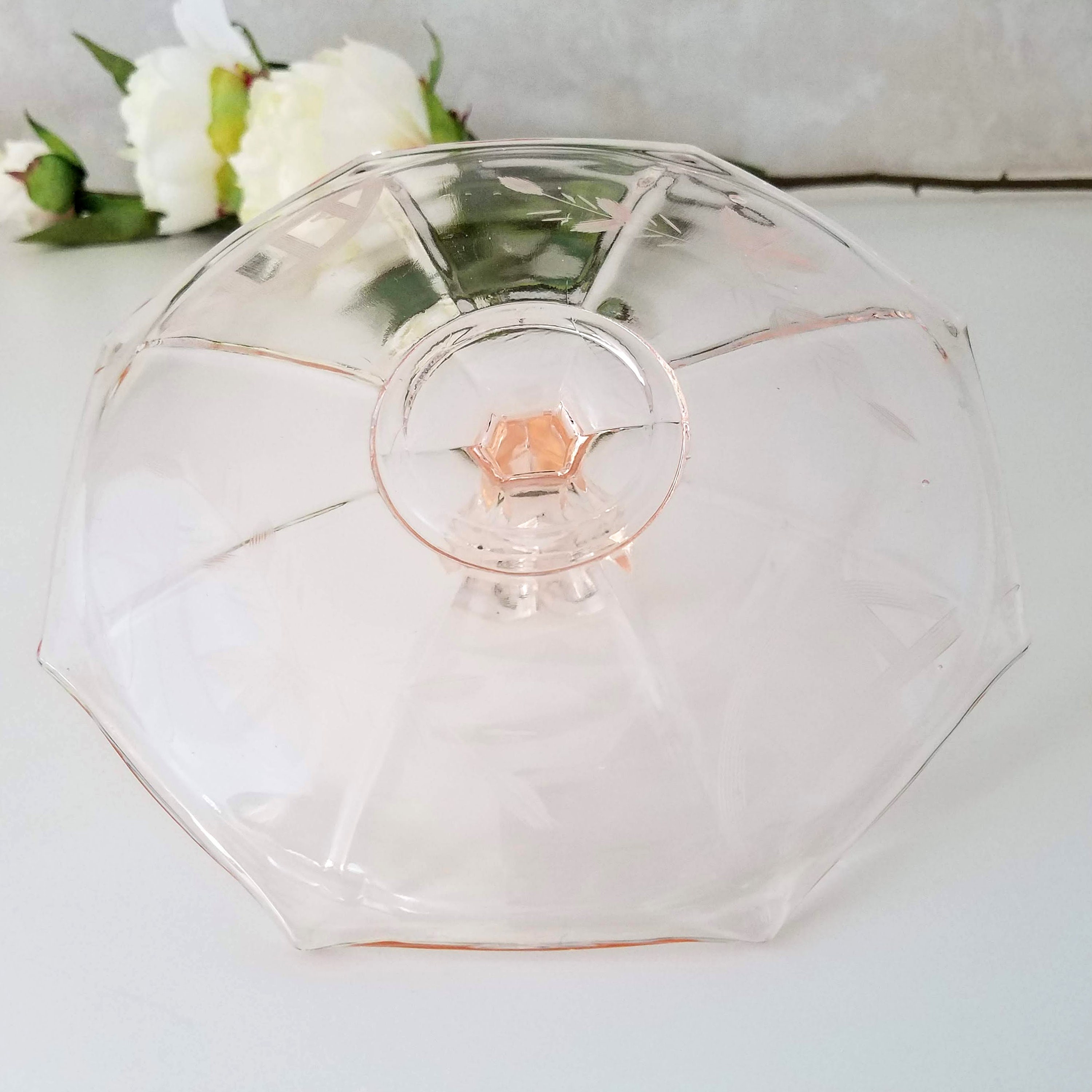 Pink Depression Glass plate: Pressed glass plate with a heart shaped handle and etched design of leaves and bridges. Vintage cottage chic decor, a light pink candy or pastry tray and lovely piece for a bridal shower or mothers day gift. This tray measures 6.25" wide (16 cm) and 2.75" tall (7 cm). There is one scratch on the underside of a corner. Air bubbles are original to the piece.