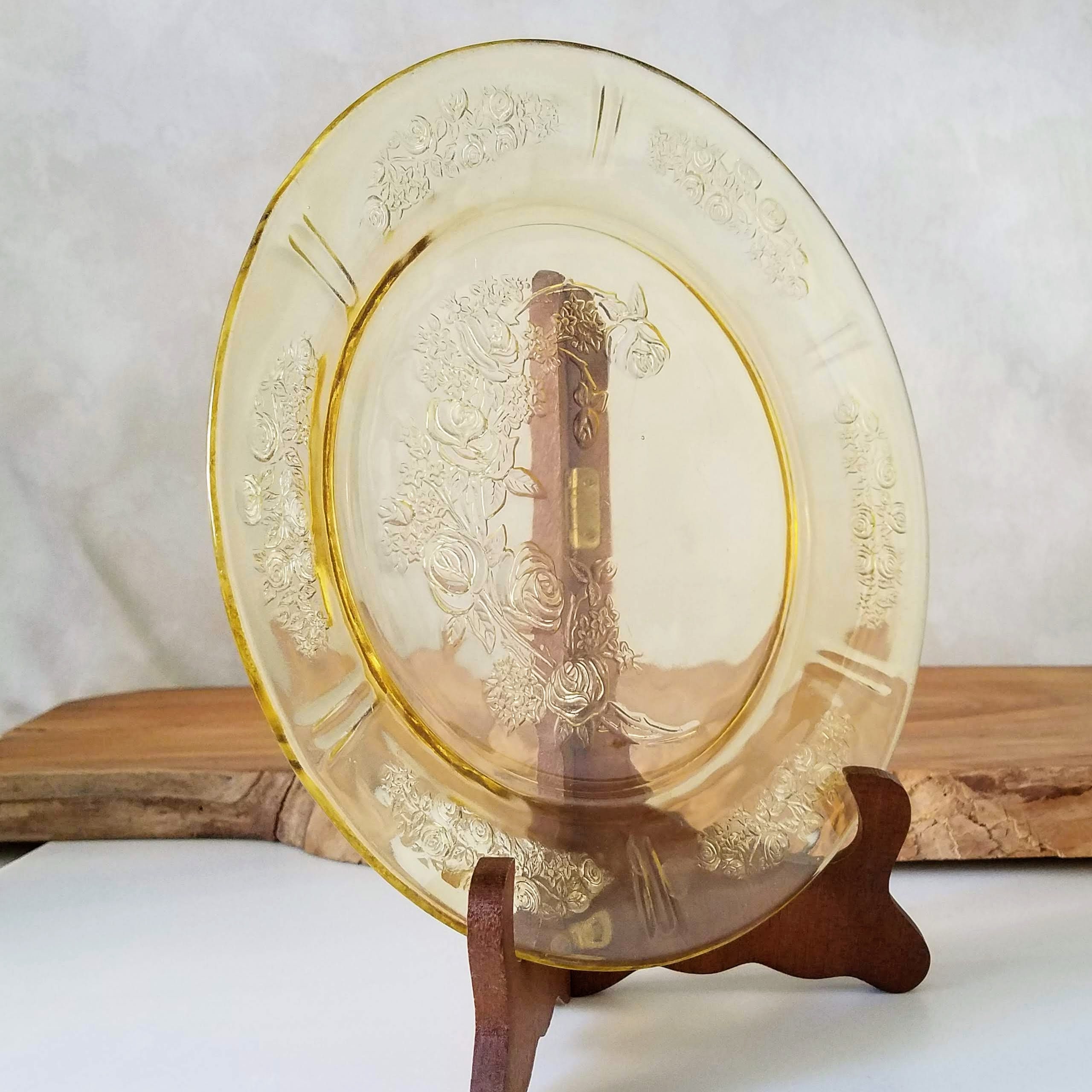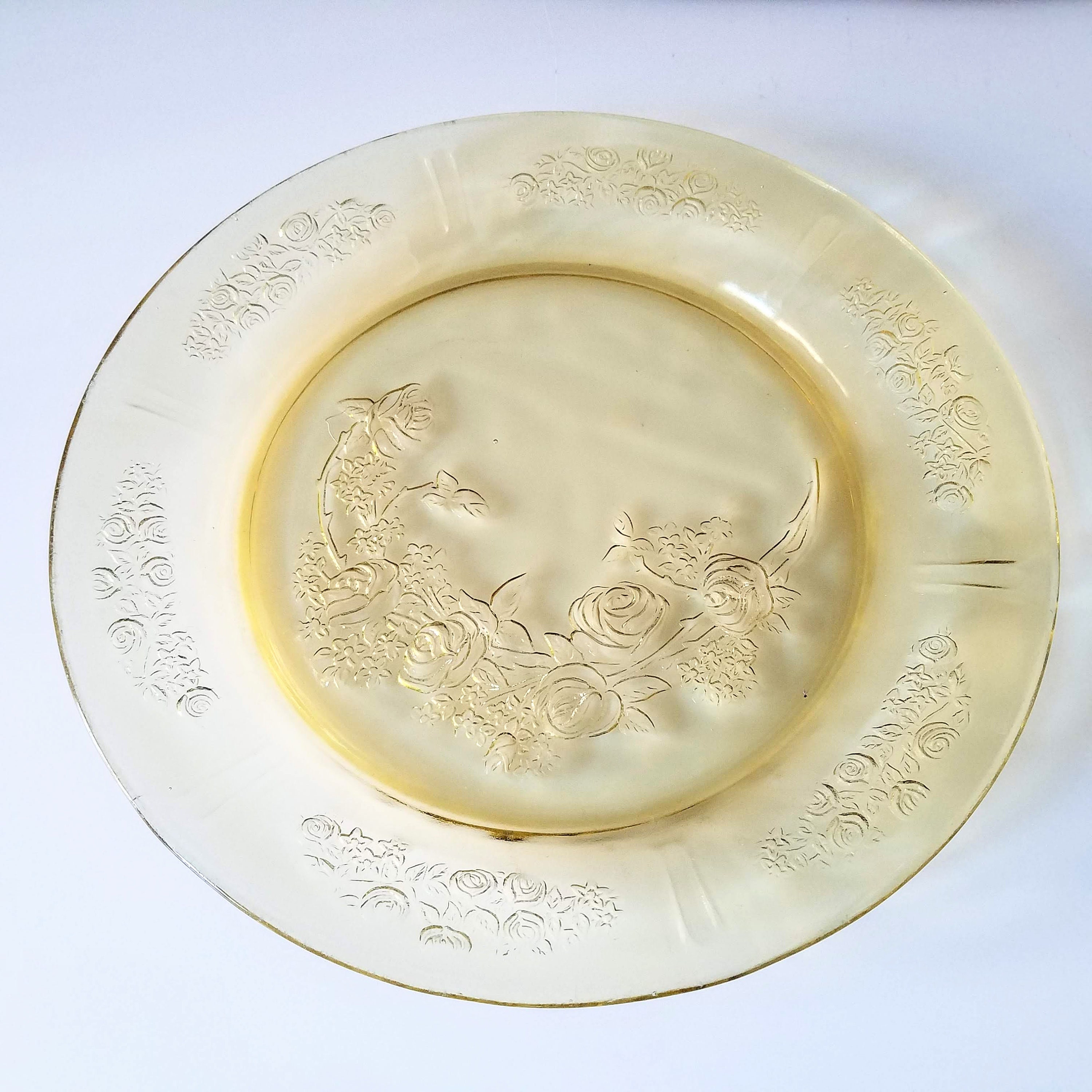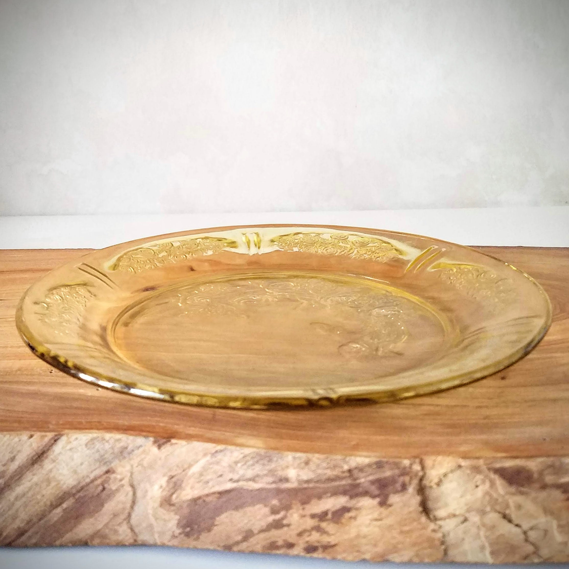 A lovely piece of yellow Depression glassware, this Federal Glass amber plate is a 1930s Rose of Sharon plate. The yellow depression glass plate measures 9.25" (23.5 cm) x 1" (2.5 cm) and will make a fabulous addition to your depression glass collection, and a great replacement for a broken dish. This piece has some minor wear marks on the base, no cracks or chips. This collectible plate is the perfect addition to your farmhouse decor.