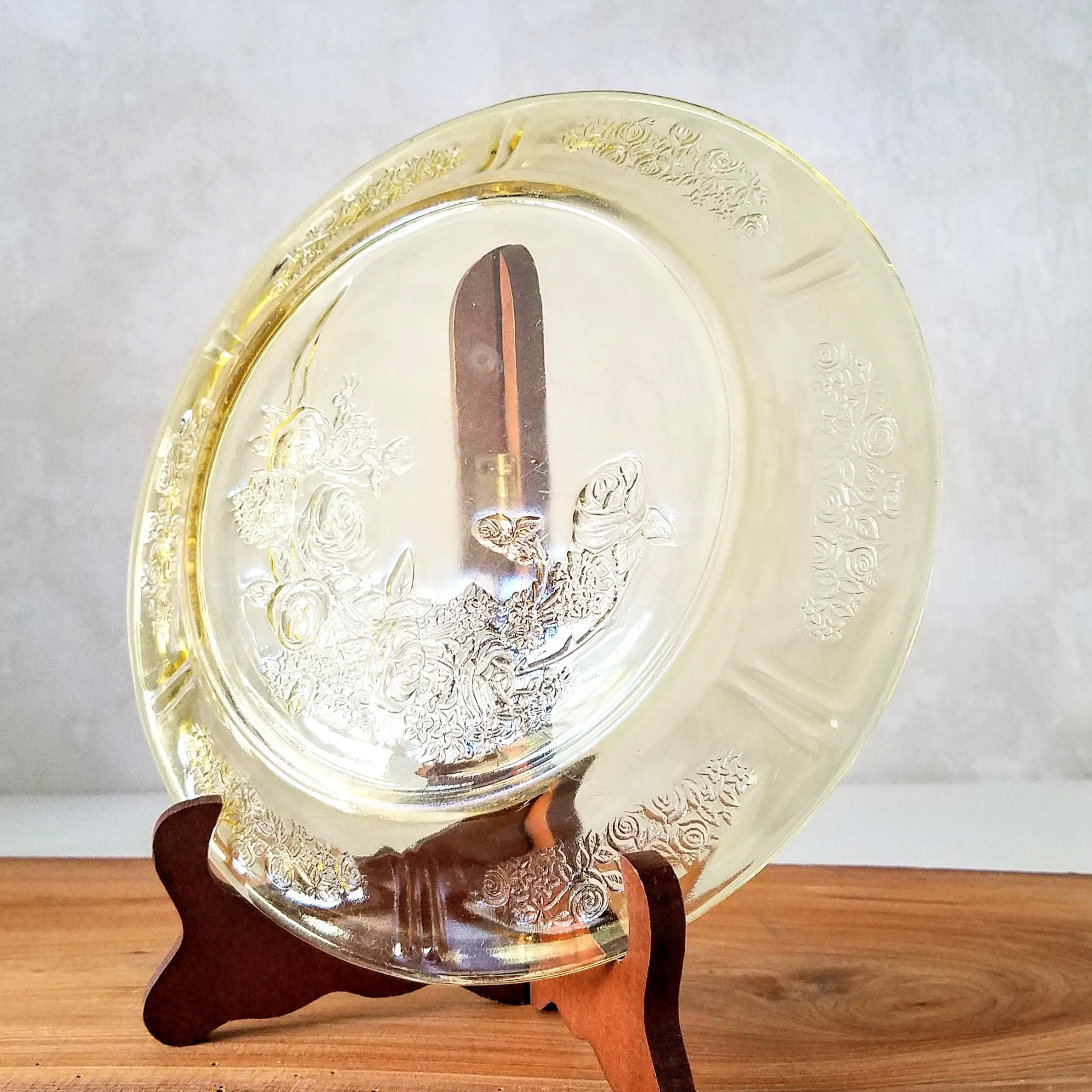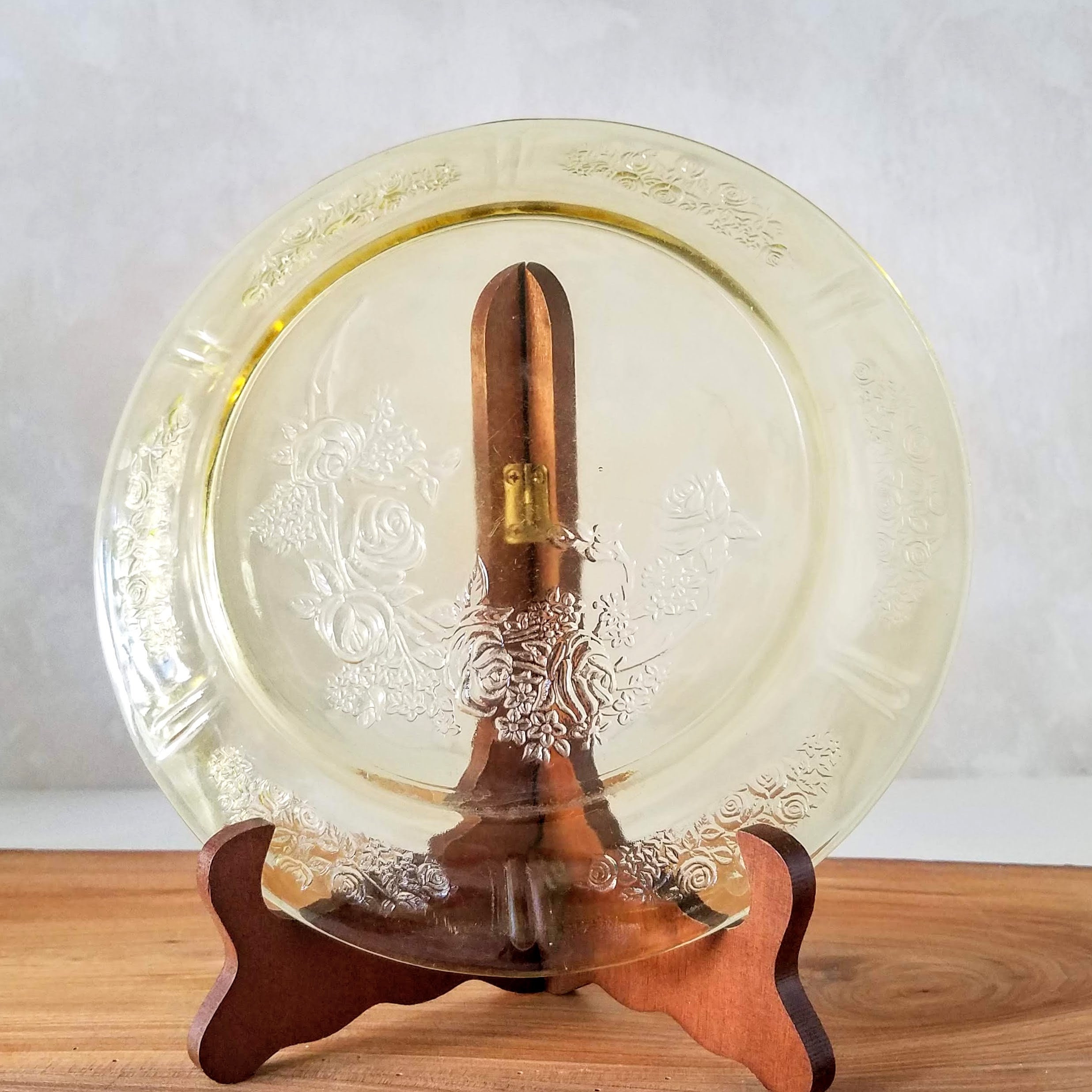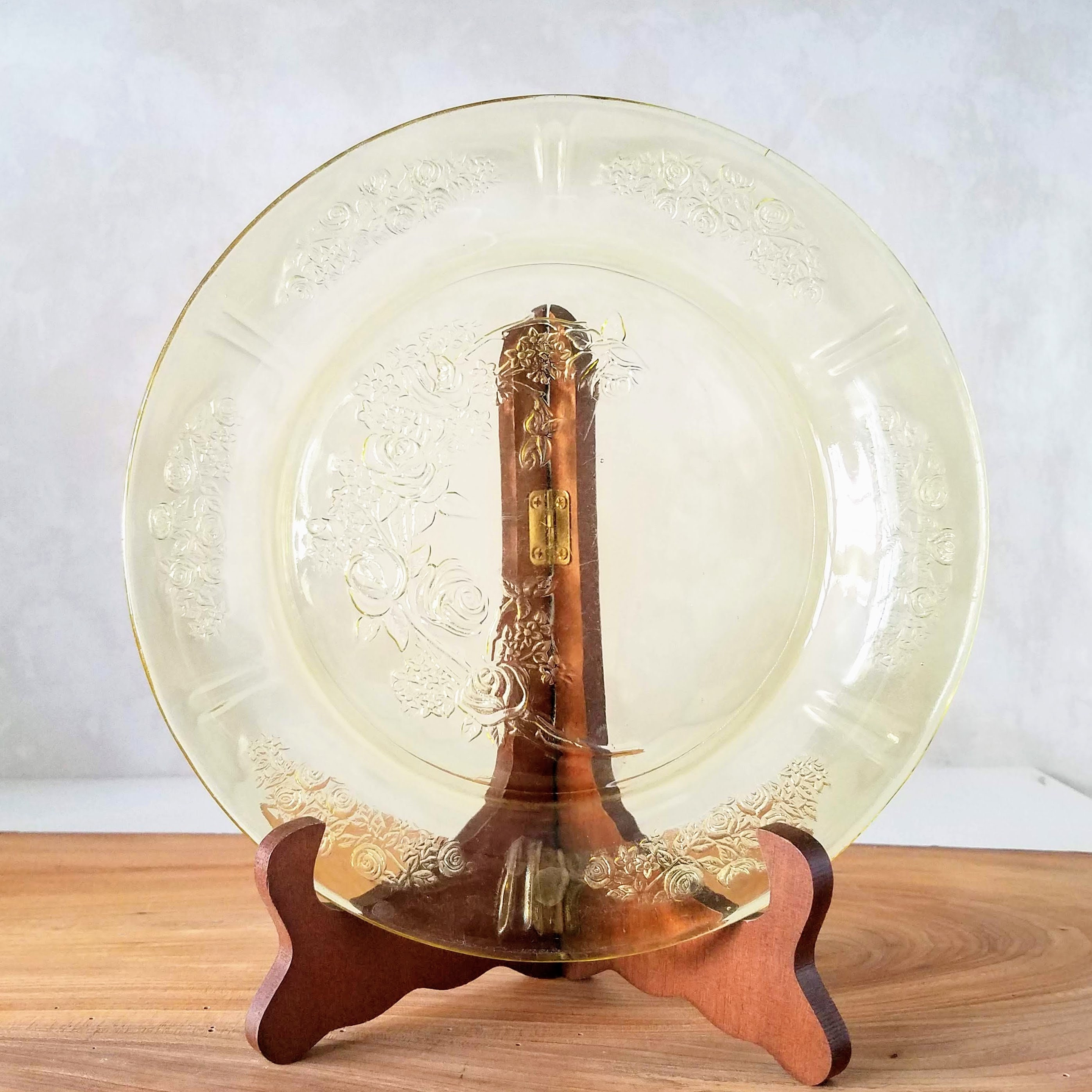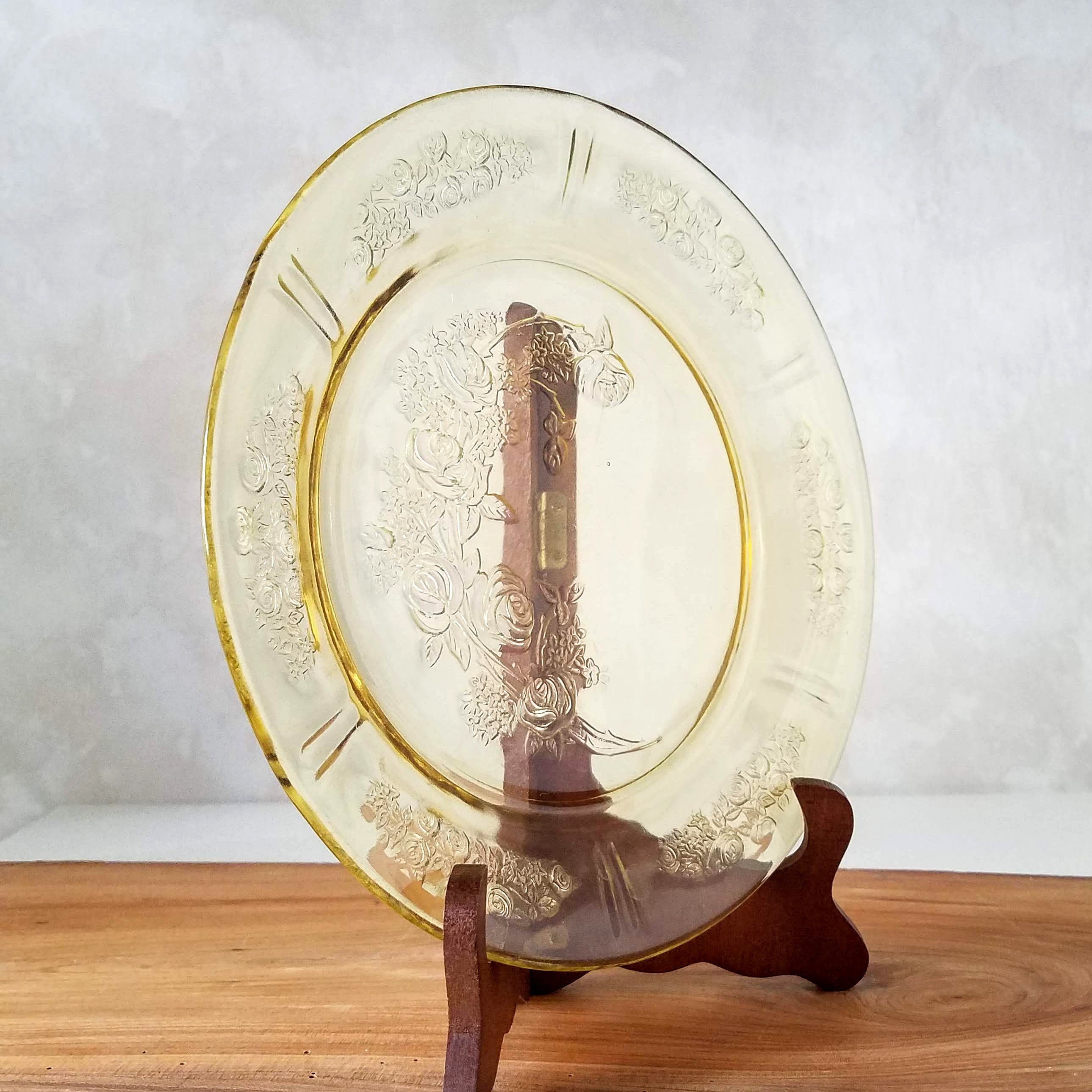 A lovely piece of yellow Depression glassware, this Federal Glass amber plate is a 1930s Rose of Sharon plate. The yellow depression glass plate measures 9.25" (23.5 cm) x 1" (2.5 cm) and will make a fabulous addition to your depression glass collection, and a great replacement for a broken dish. This piece has some minor wear marks on the base, no cracks or chips. This collectible plate is the perfect addition to your farmhouse decor.
