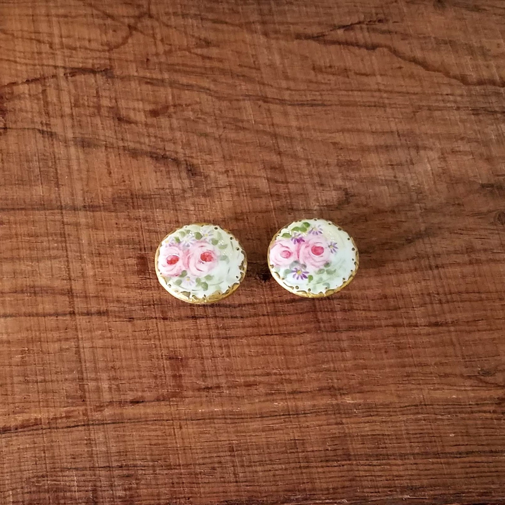Antique buttons: Victorian hand painted porcelain buttons. A set of two matching women's collar stud buttons painted with pink roses and gold edging. Each button measures 1.2" (28 mm). This set of large stud buttons will make a lovely addition to your project of button collection.