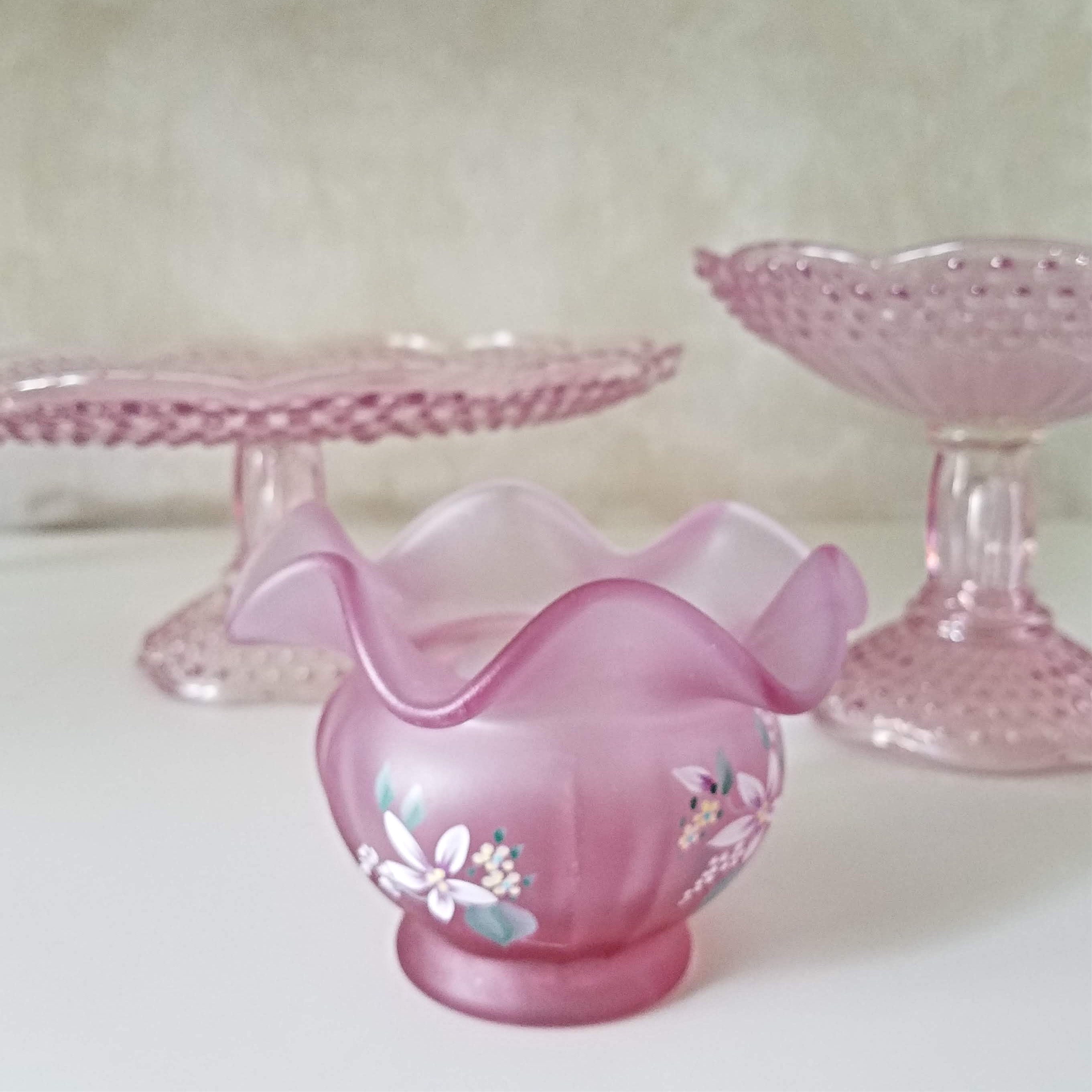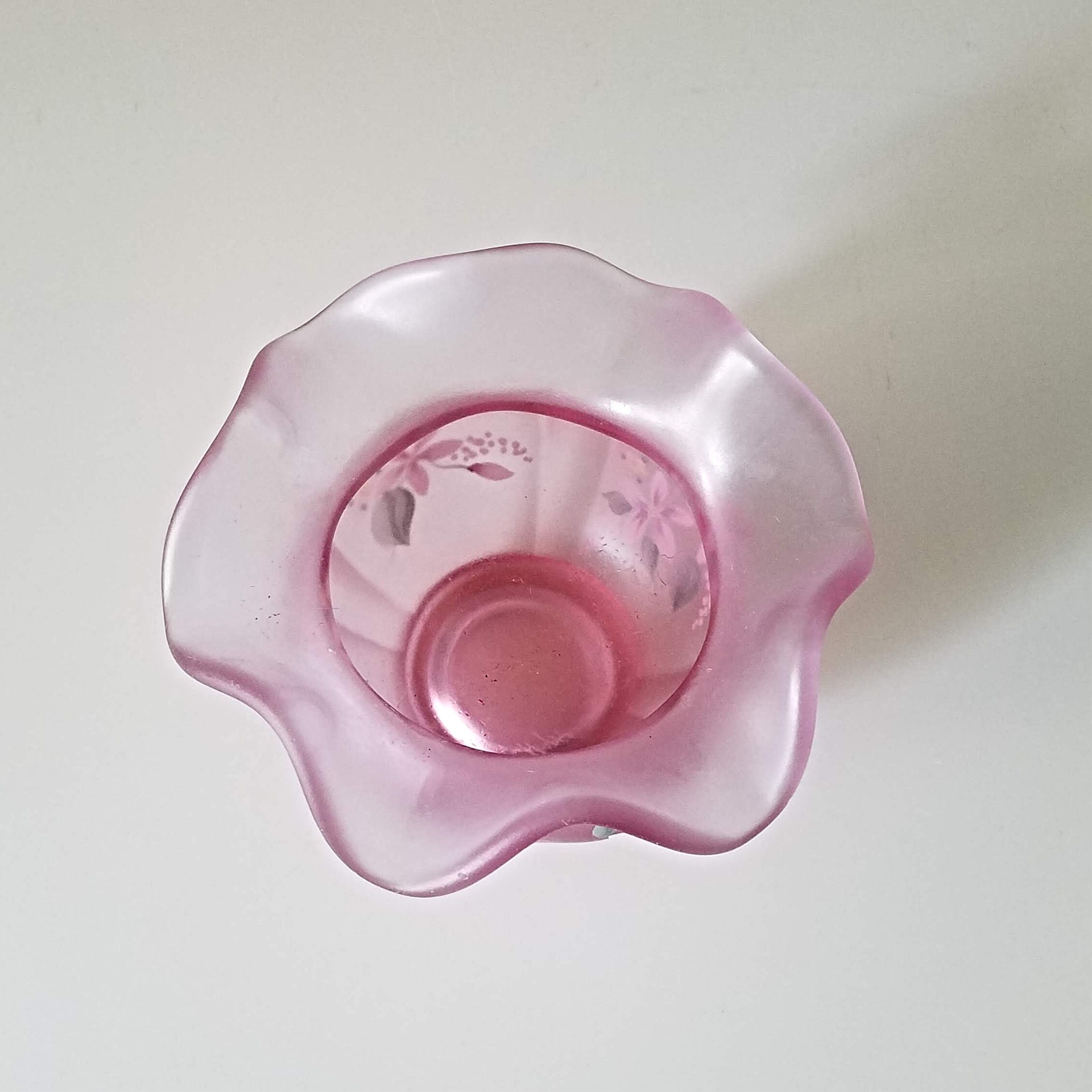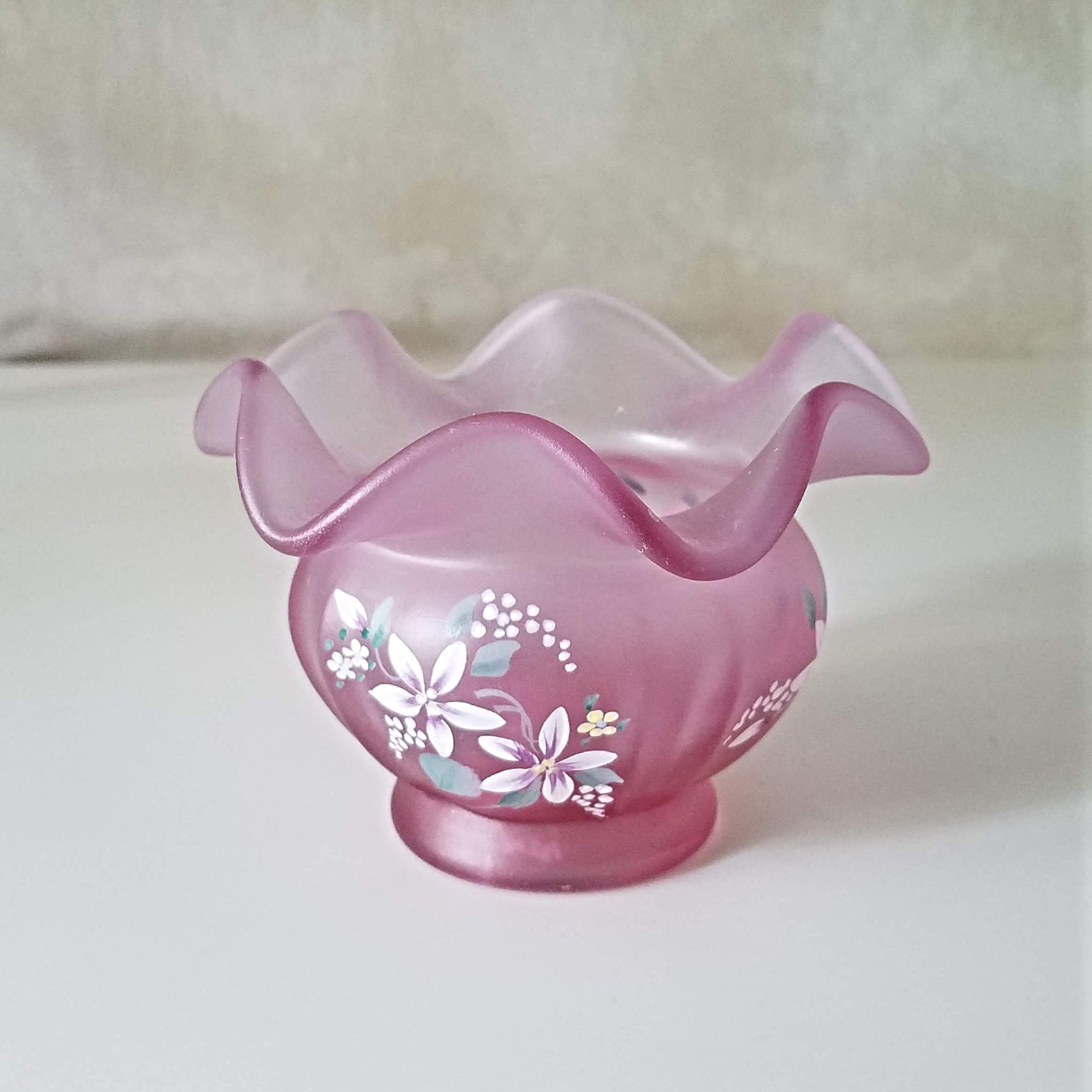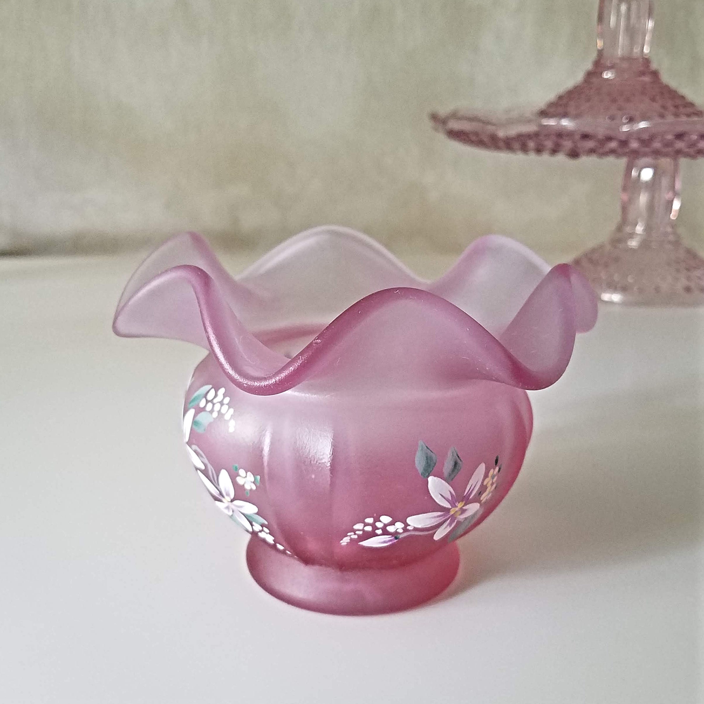 Vintage hand-painted Fenton glass vase: Collectible pink opalescent satin glass ruffle top vase signed G Huffman. The beautiful pink vase measures 3.75" (9.5 cm) tall and 5" (12.5 cm) wide. This vase is in very good shape with no chips or cracks. There is a little wear to the bottom, and a little texturing on the inside of the base.