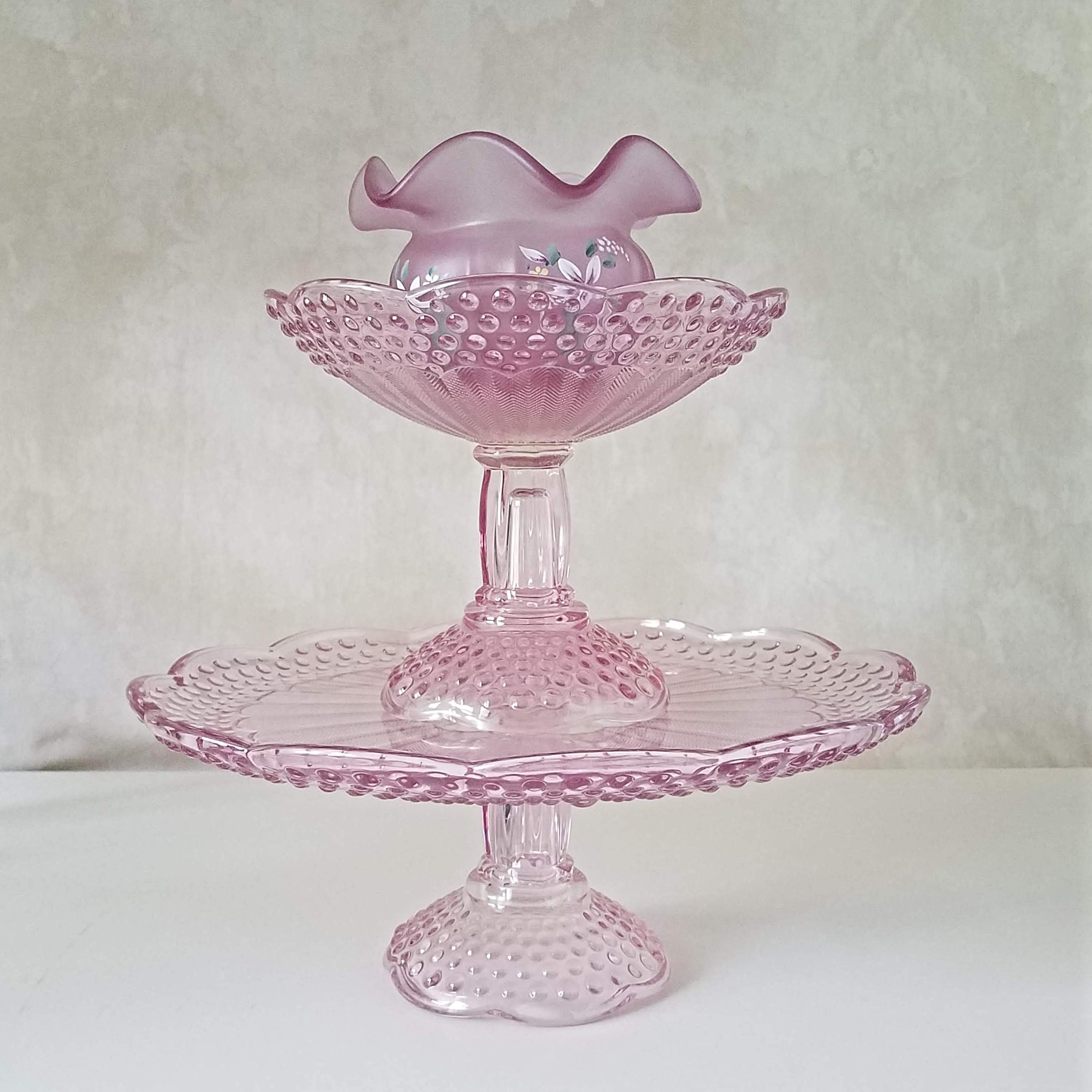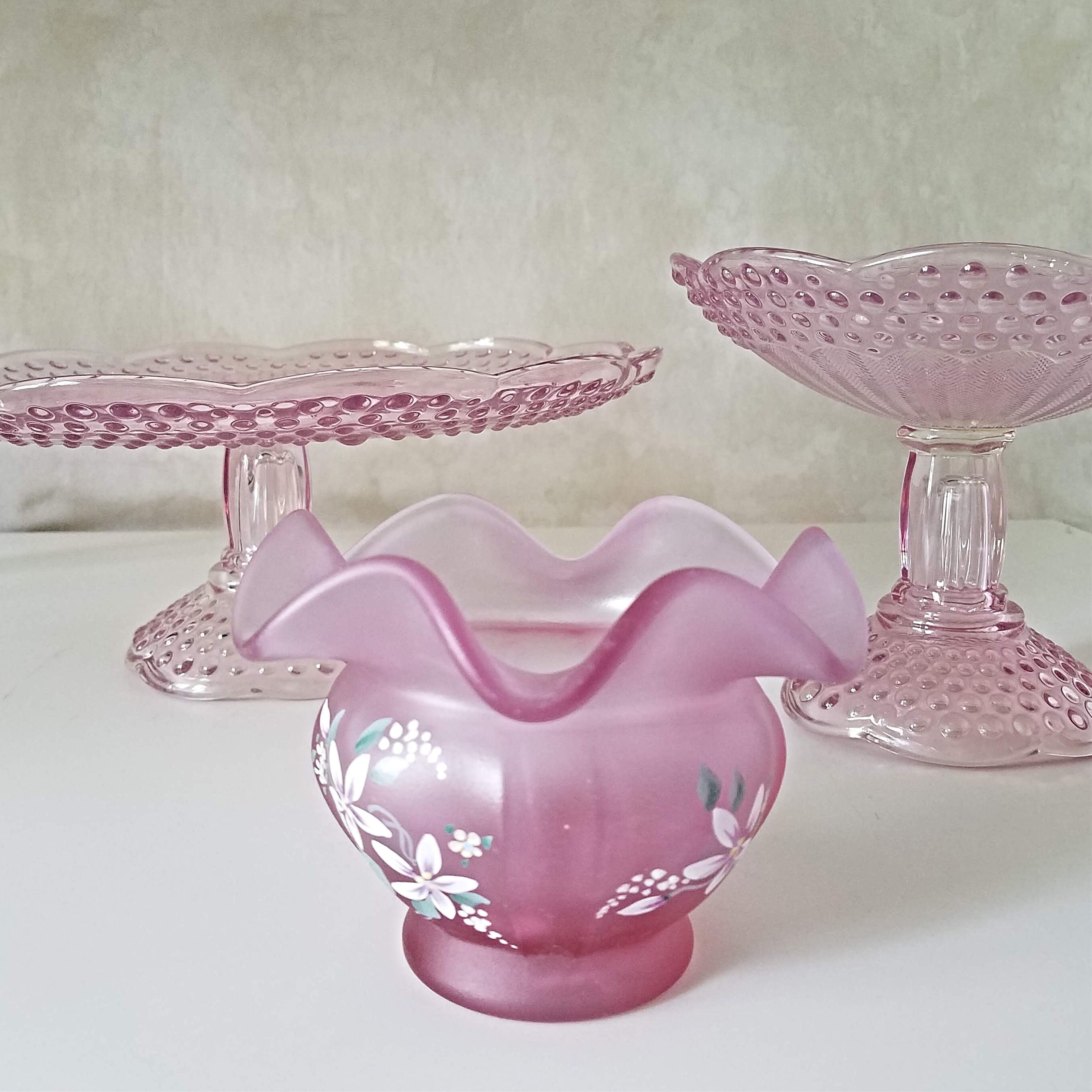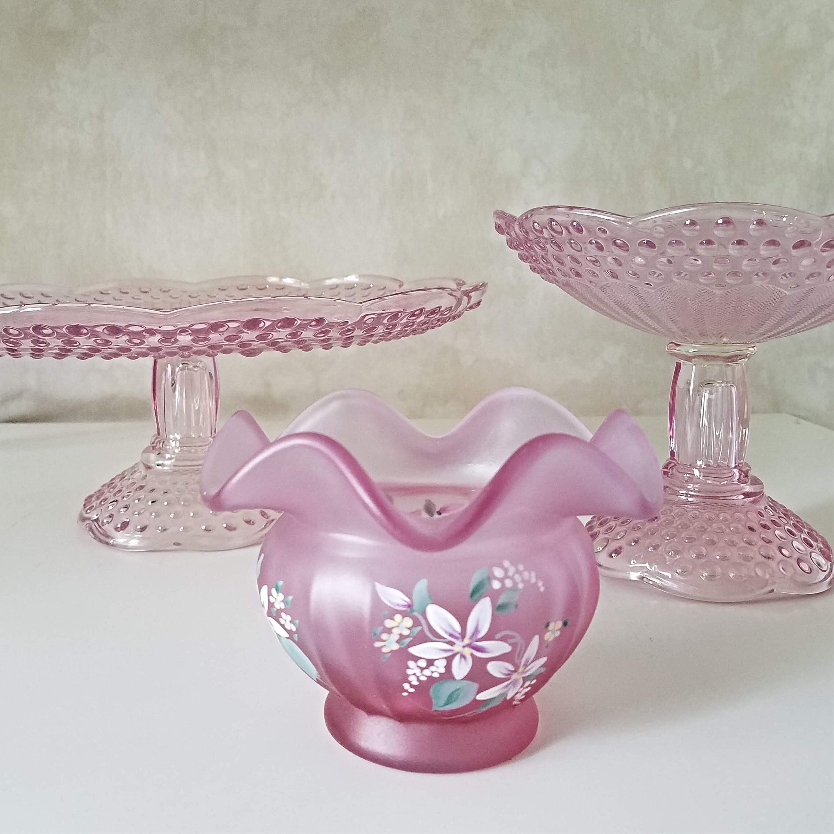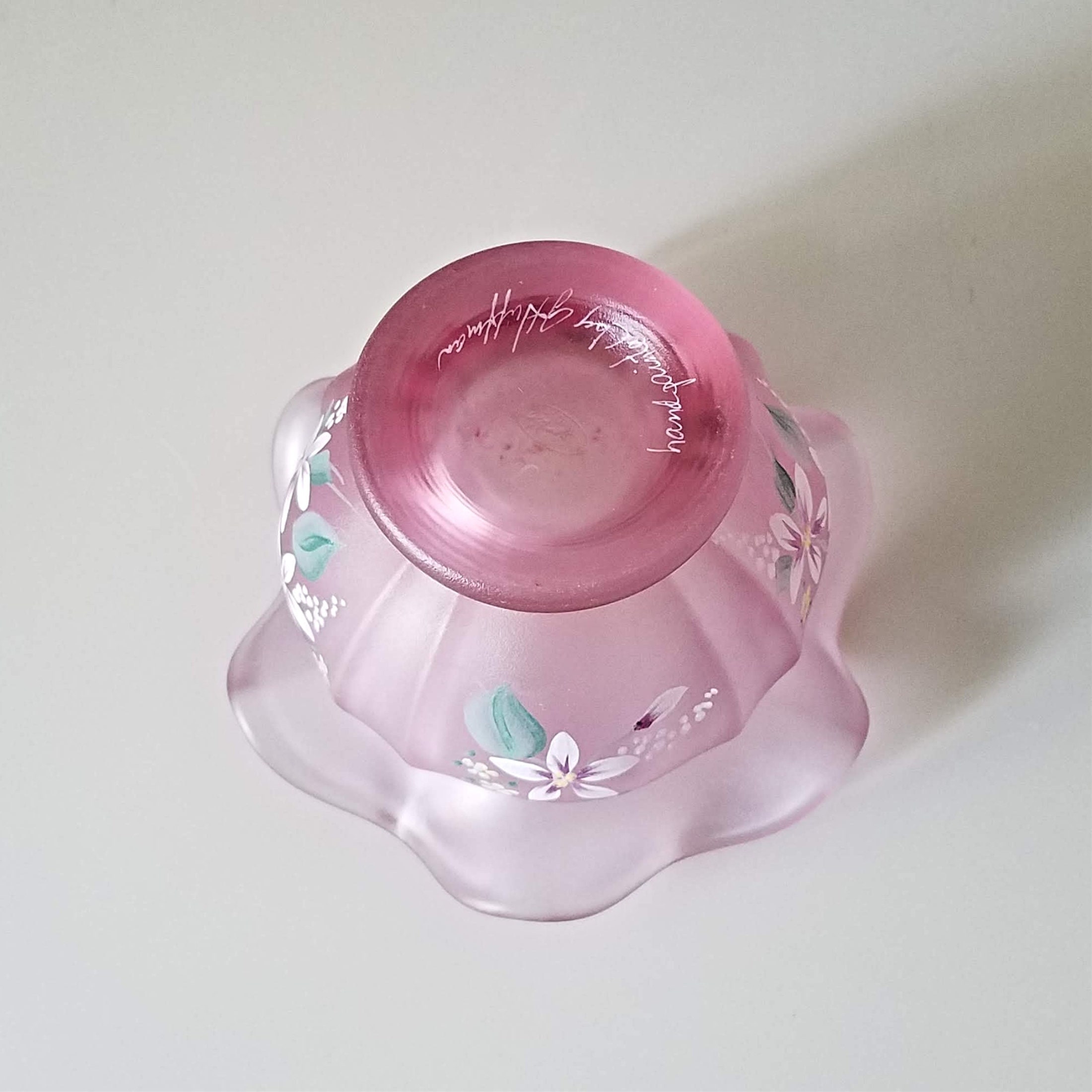 Vintage hand-painted Fenton glass vase: Collectible pink opalescent satin glass ruffle top vase signed G Huffman. The beautiful pink vase measures 3.75" (9.5 cm) tall and 5" (12.5 cm) wide. This vase is in very good shape with no chips or cracks. There is a little wear to the bottom, and a little texturing on the inside of the base.