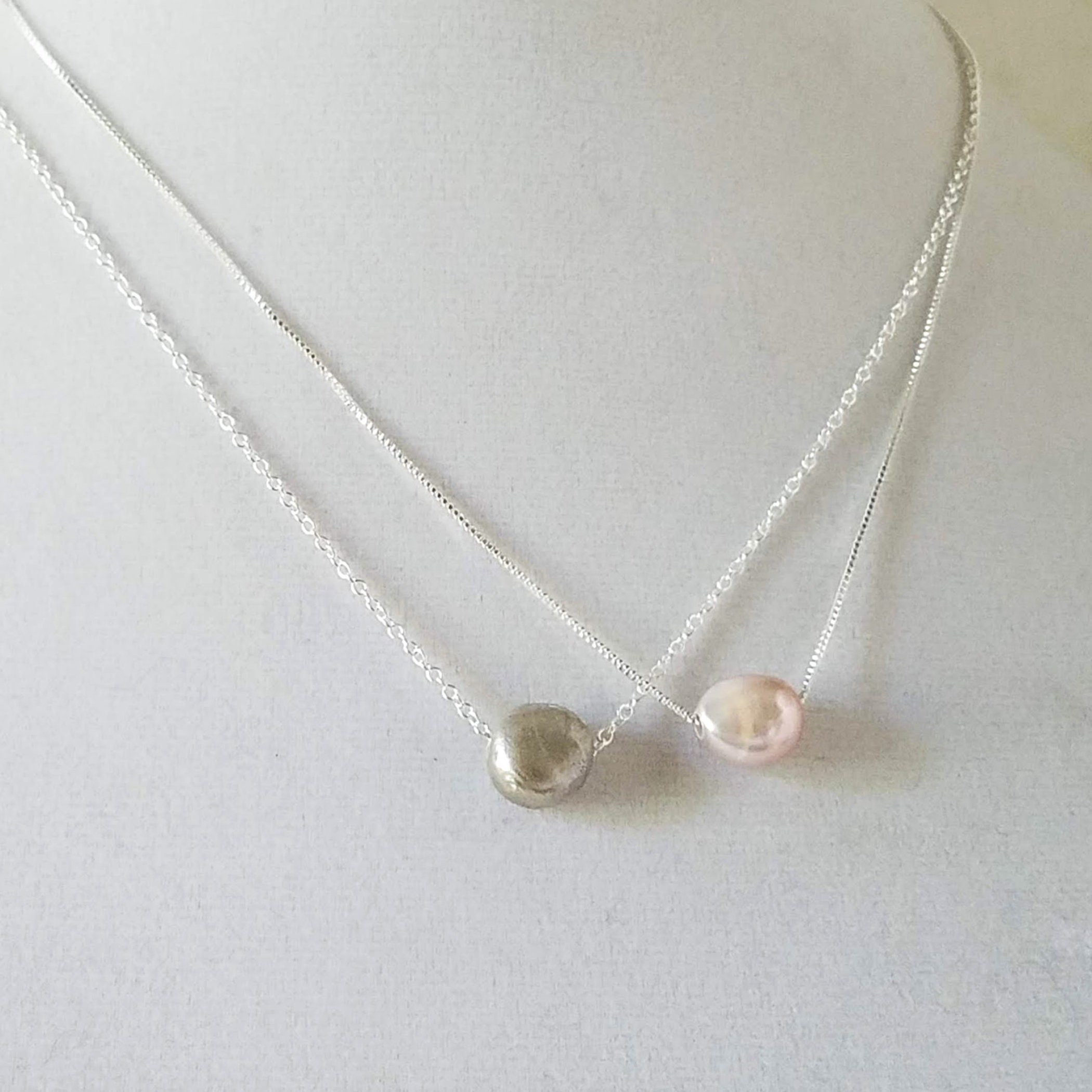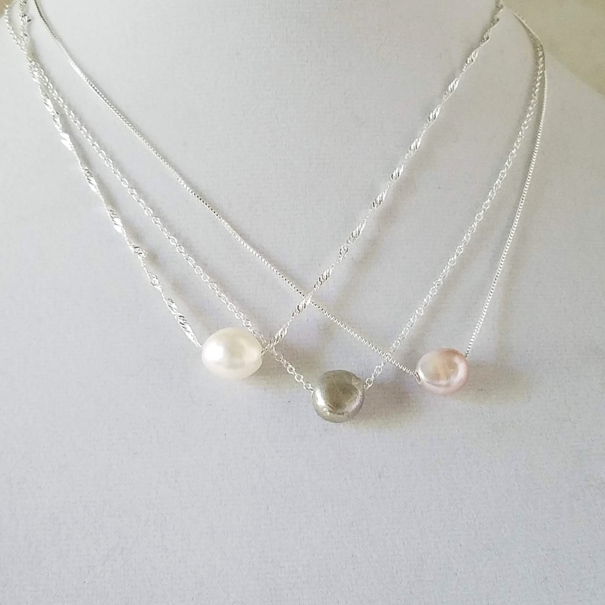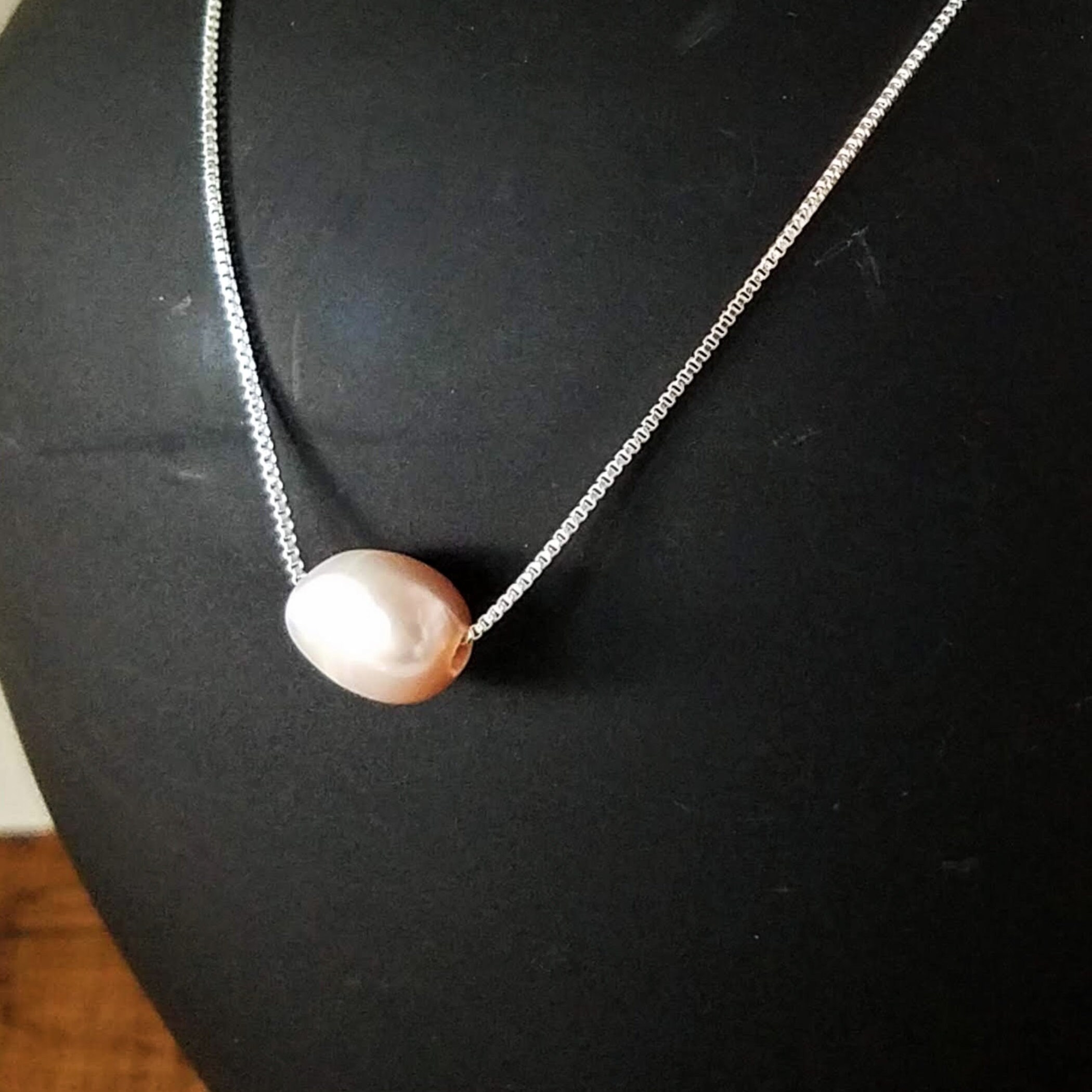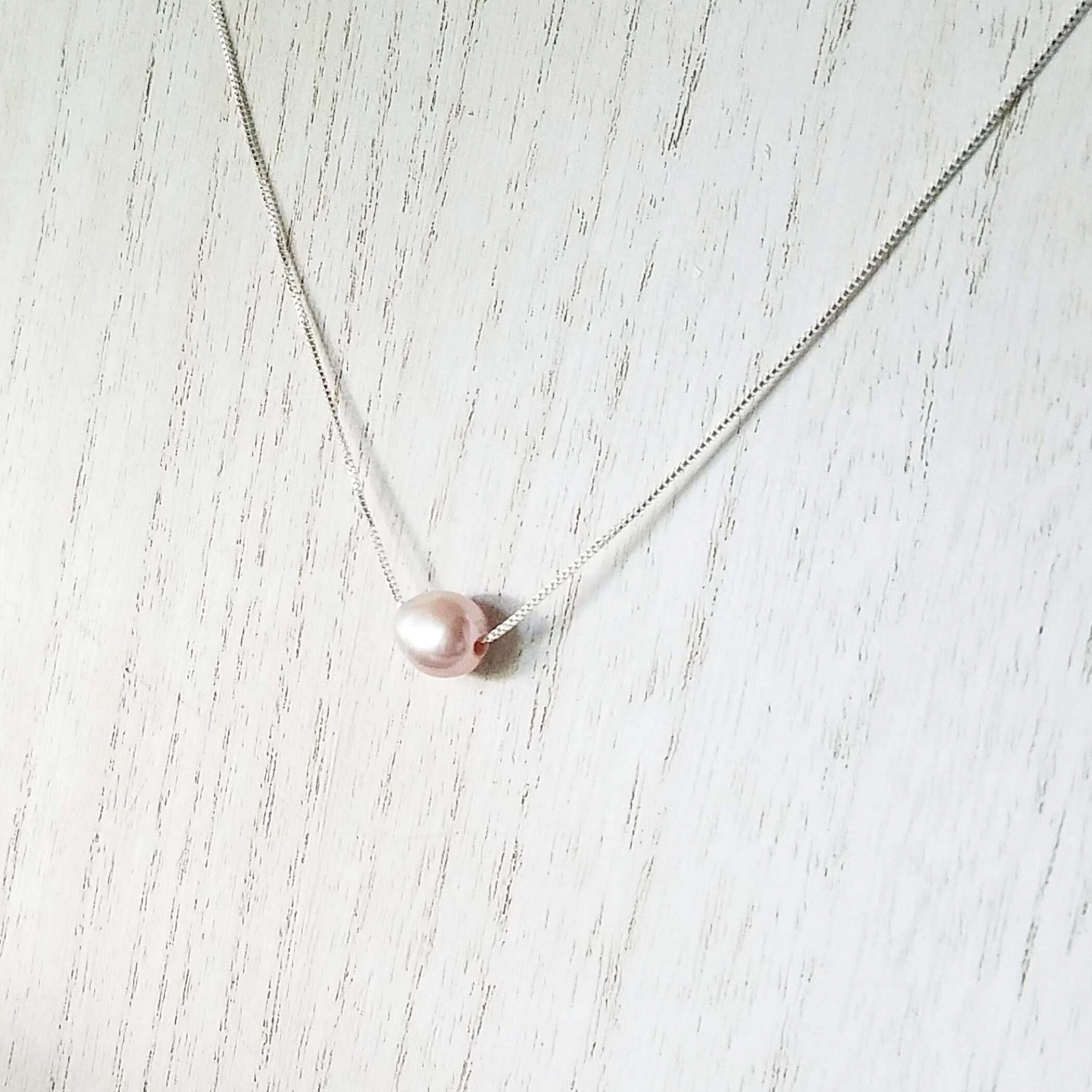 Pearl necklace: Real freshwater pearl sterling silver necklace chain. The 17" sterling silver necklace is a pink pearl floating necklace. This dainty necklace features a pink 11 mm freshwater pearl floating on a sterling silver necklace chain. A delicate, simple necklace, perfect for a wedding, bridesmaids, or layering necklace.