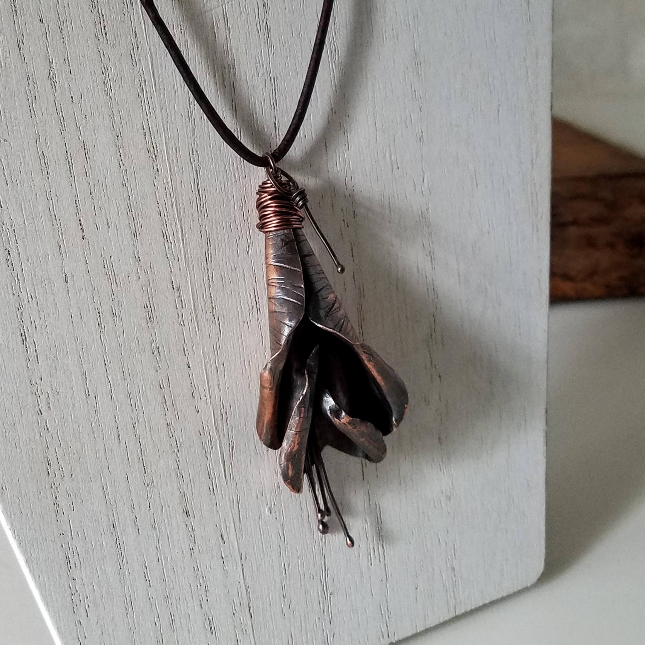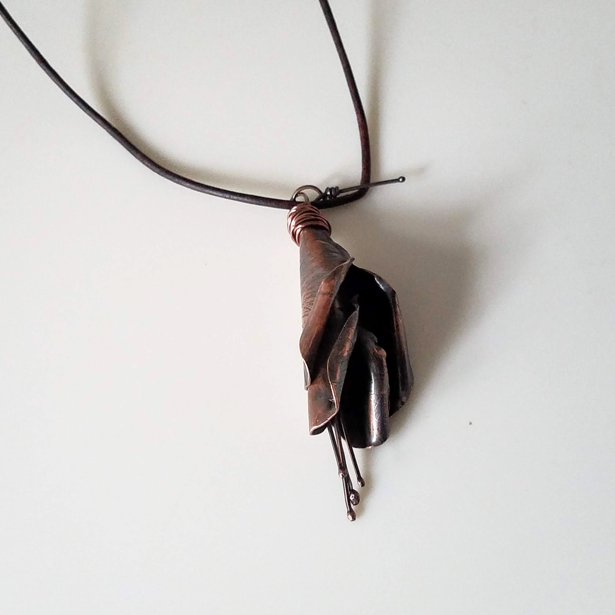 Hand forged copper flower pendant necklace: Artisan copper pendant on adjustable dark brown leather cord. A unique avant garde bohemian jewelry gift for someone special. This gorgeous pendant is made with two layers of copper flower petals with dangling copper stamen. The dark colors were created using a patina. The entire pendant has been polished with Rennaisance wax. This fabulous piece measures 3.25" (8.25 cm) long and 1.2" (3 cm) wide. It was designed to have movement. The premium dark brown leather cord is tied to be adjustable and measures 26".