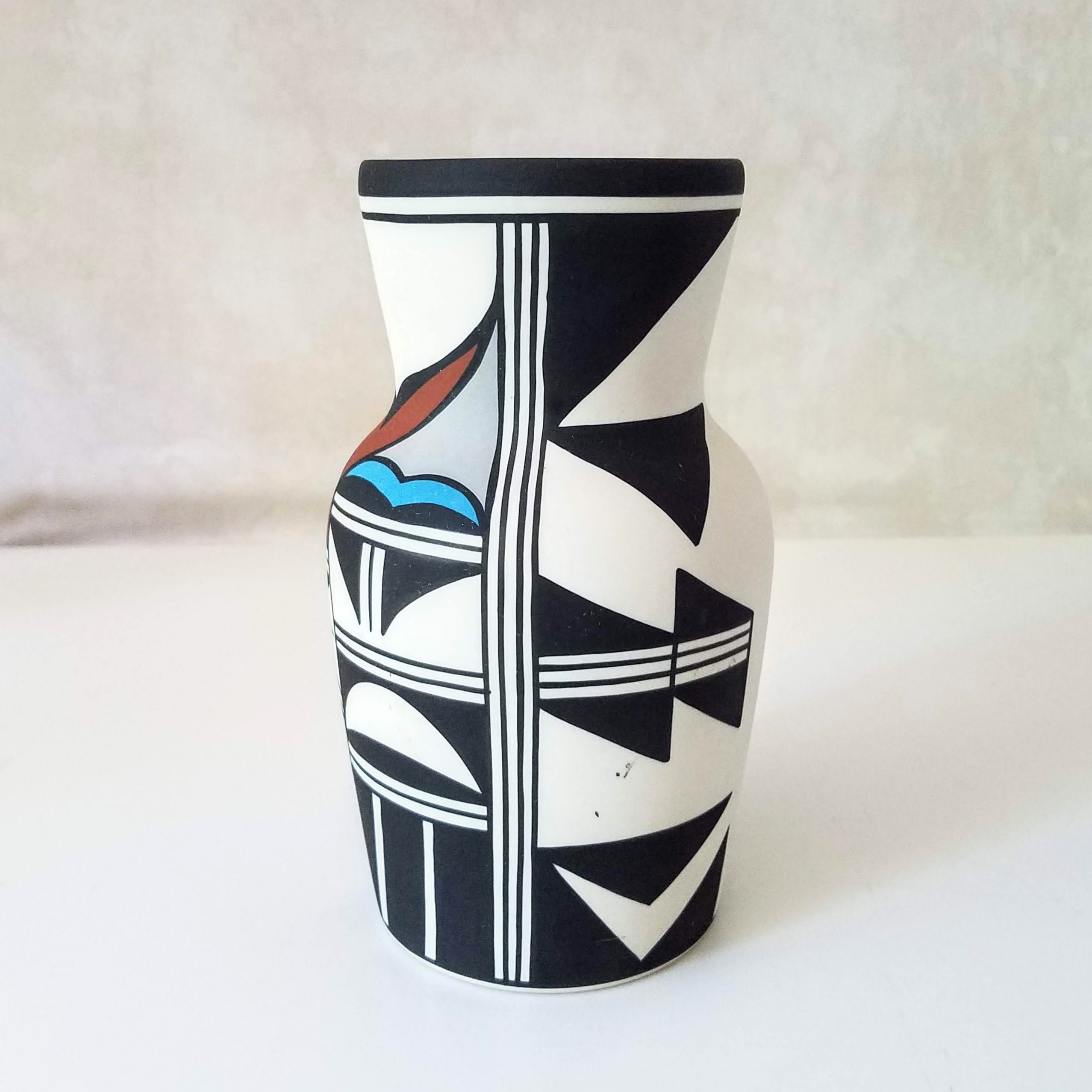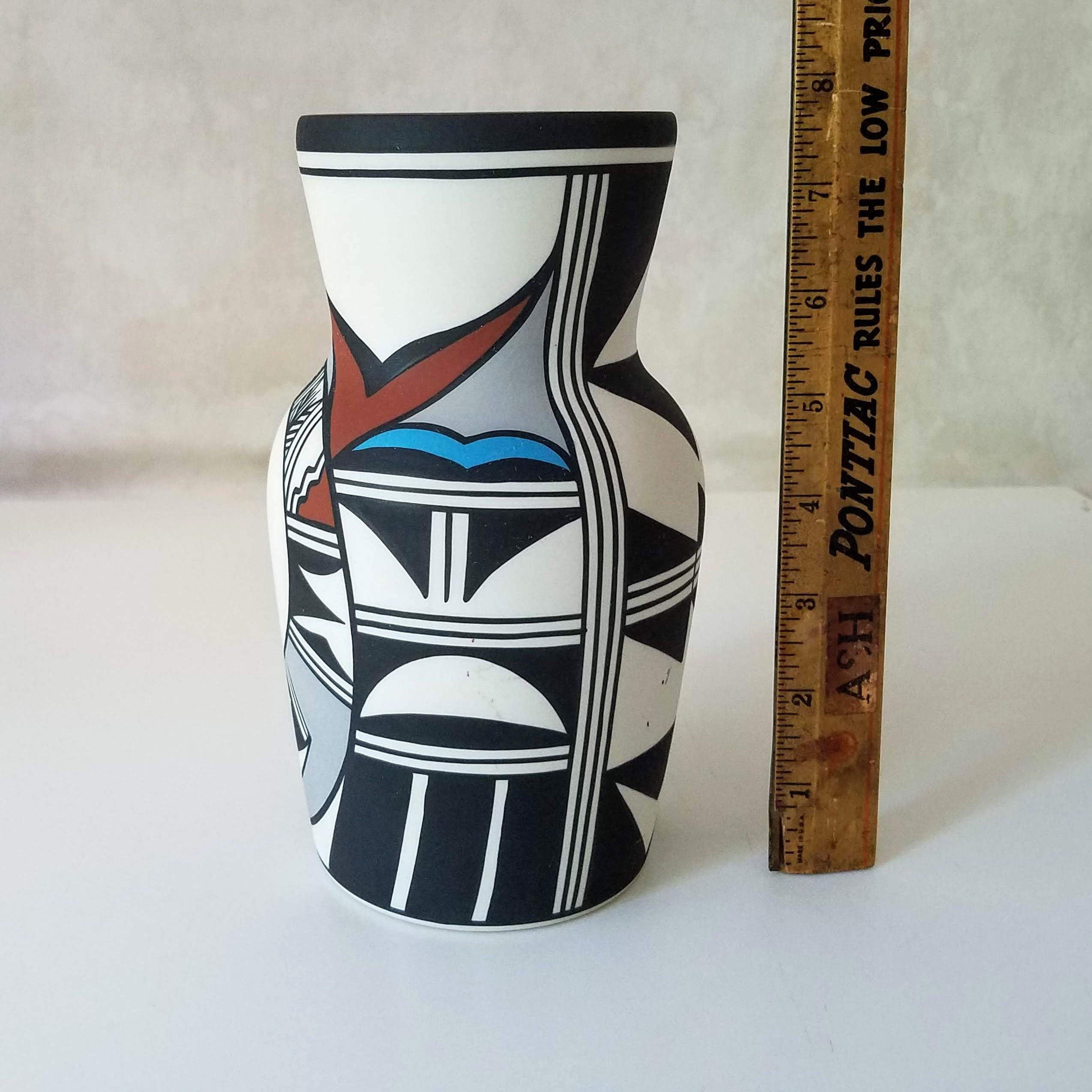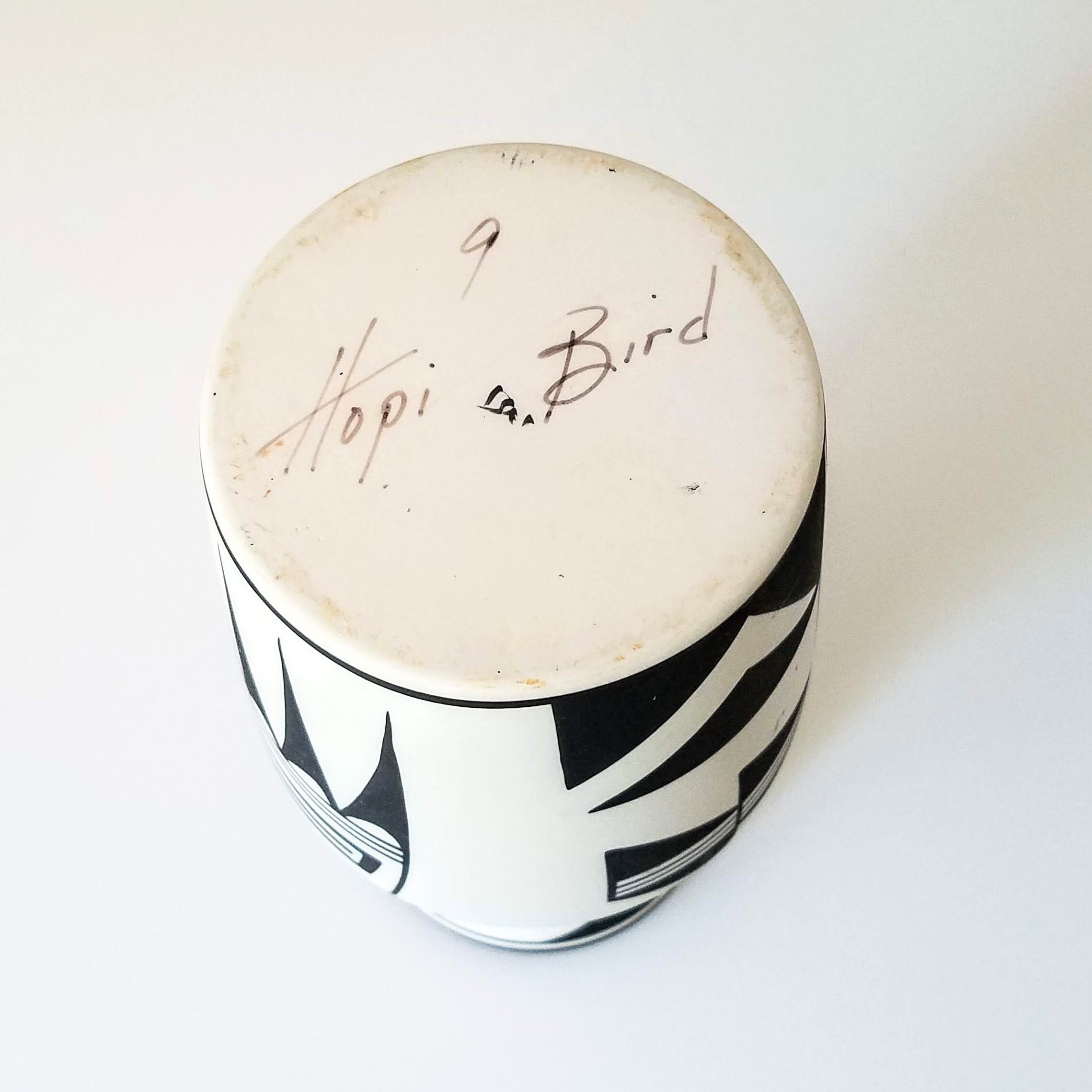 Vintage Hopi Bird cylinder vase: Polychrome handpainted bird design southwestern pottery. This fabulous piece of southwestern pottery has the words Hop Bird, the number 9, another faint marking or initials, and a special marking in the center. The 'signed' pottery will make a very special wedding gift, anniversary gift, or birthday gift. This cylinder vase measures 8" tall and 4.5" wide.
