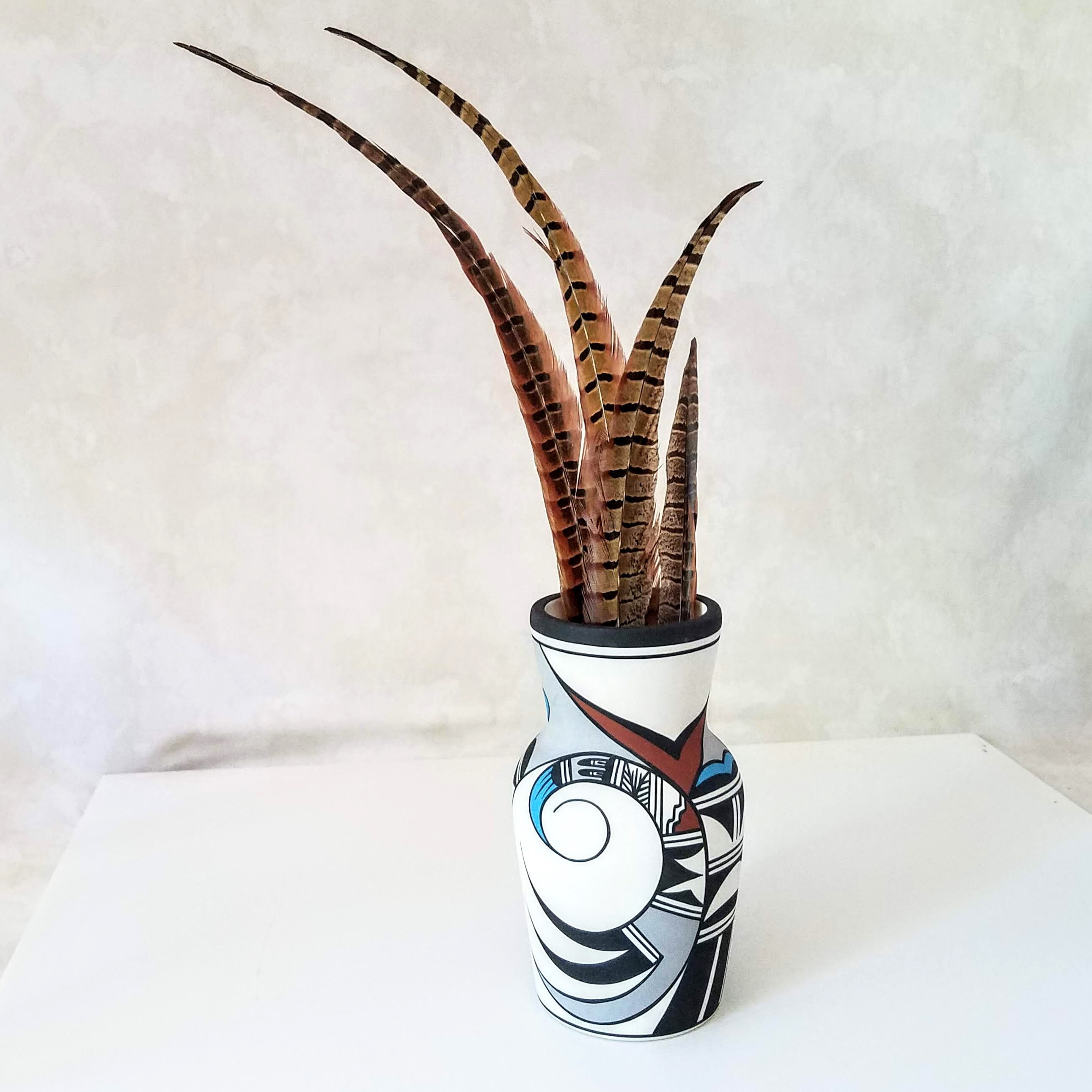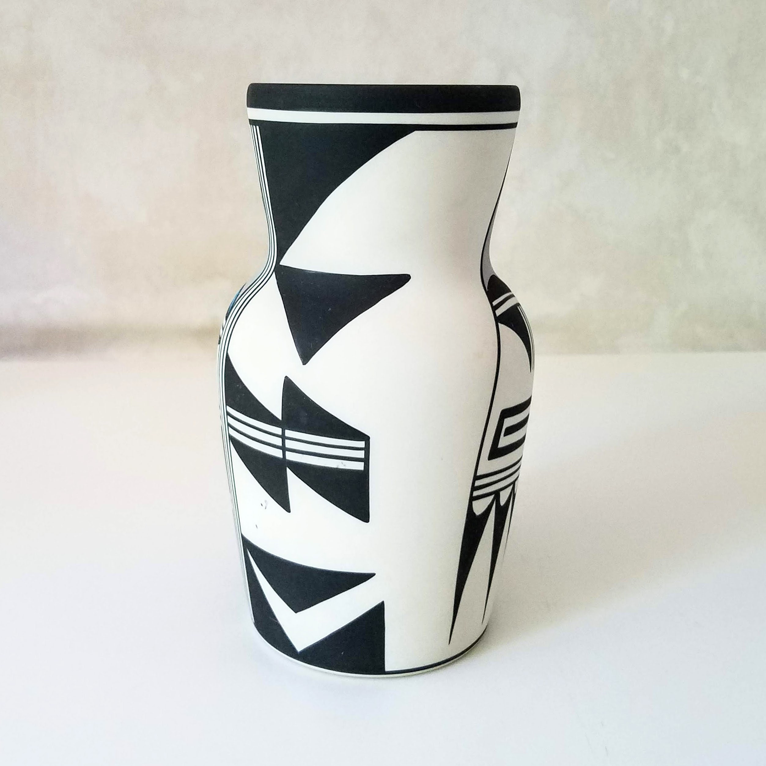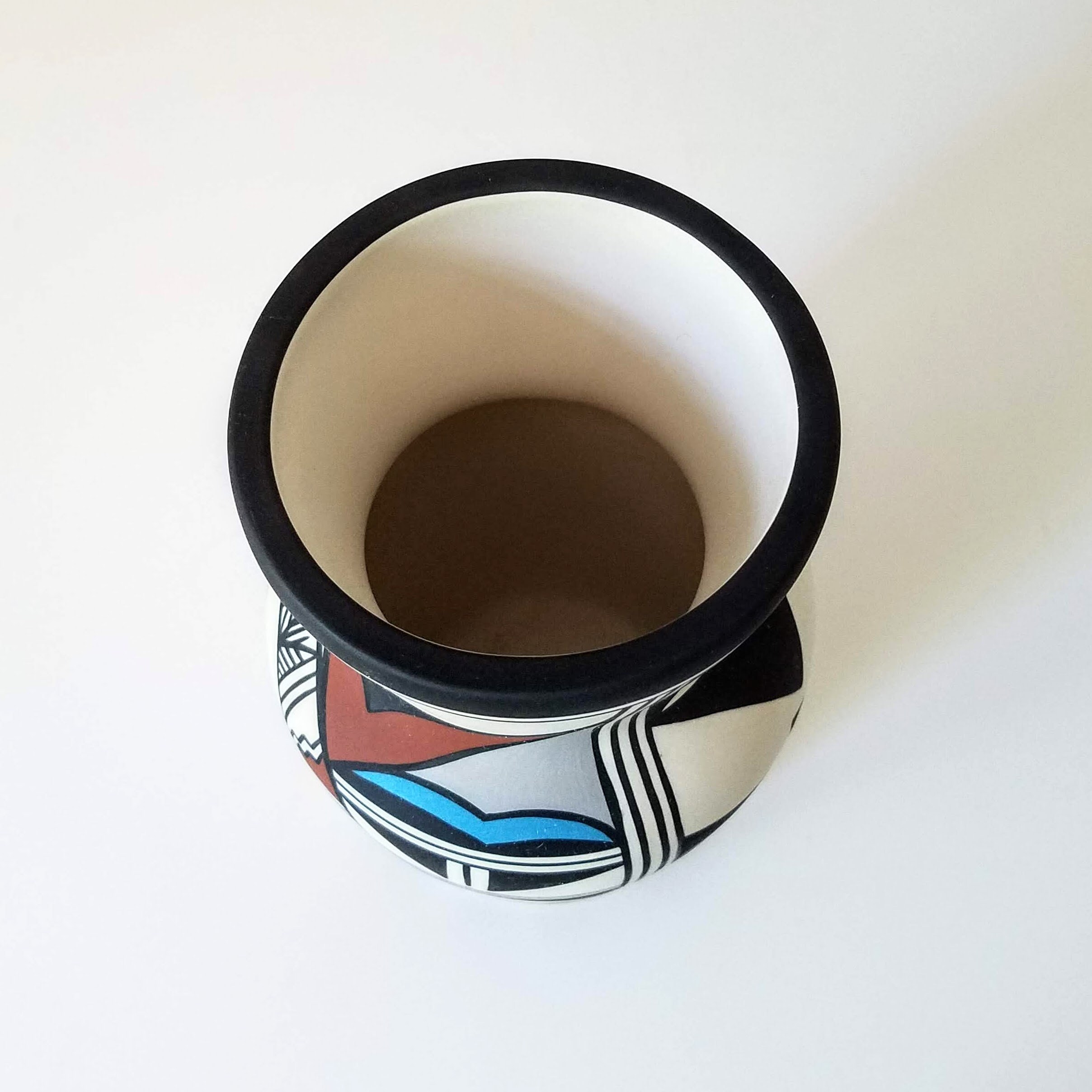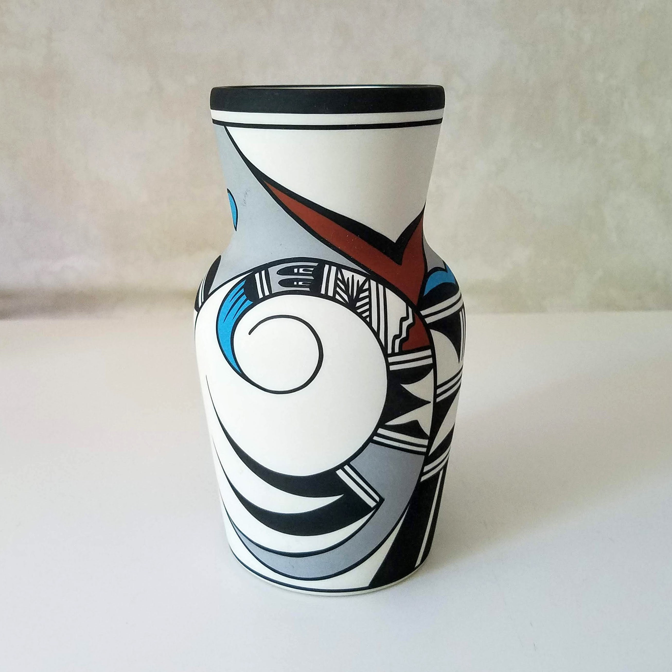Vintage Hopi Bird cylinder vase: Polychrome handpainted bird design southwestern pottery. This fabulous piece of southwestern pottery has the words Hop Bird, the number 9, another faint marking or initials, and a special marking in the center. The 'signed' pottery will make a very special wedding gift, anniversary gift, or birthday gift. This cylinder vase measures 8" tall and 4.5" wide.