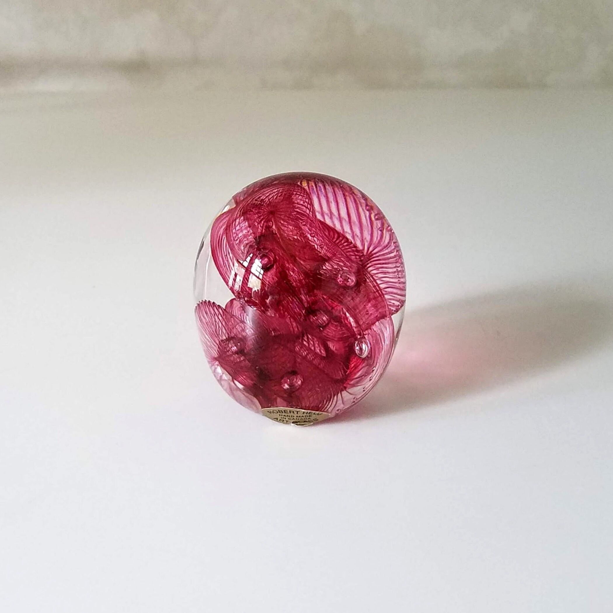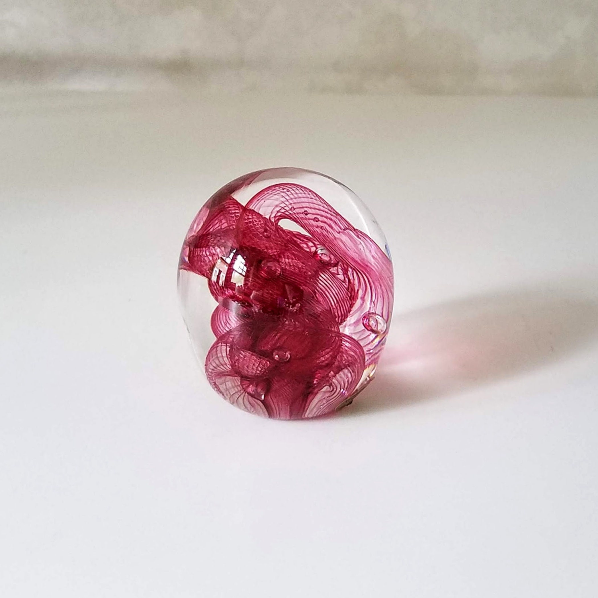 Robert Held art glass paperweight: Signed vintage handmade burgundy red ribbon glass paperweight. Handmade in Canada, this beautiful glass paperweight will make a unique gift for someone special. This is the shorter of the two paperweights in photos 8 and 9. This one of a kind piece of art measures 2.25" (5.5 cm) wide and 2.5" (6.2 cm) tall. Shipping is free in the domestic USA.