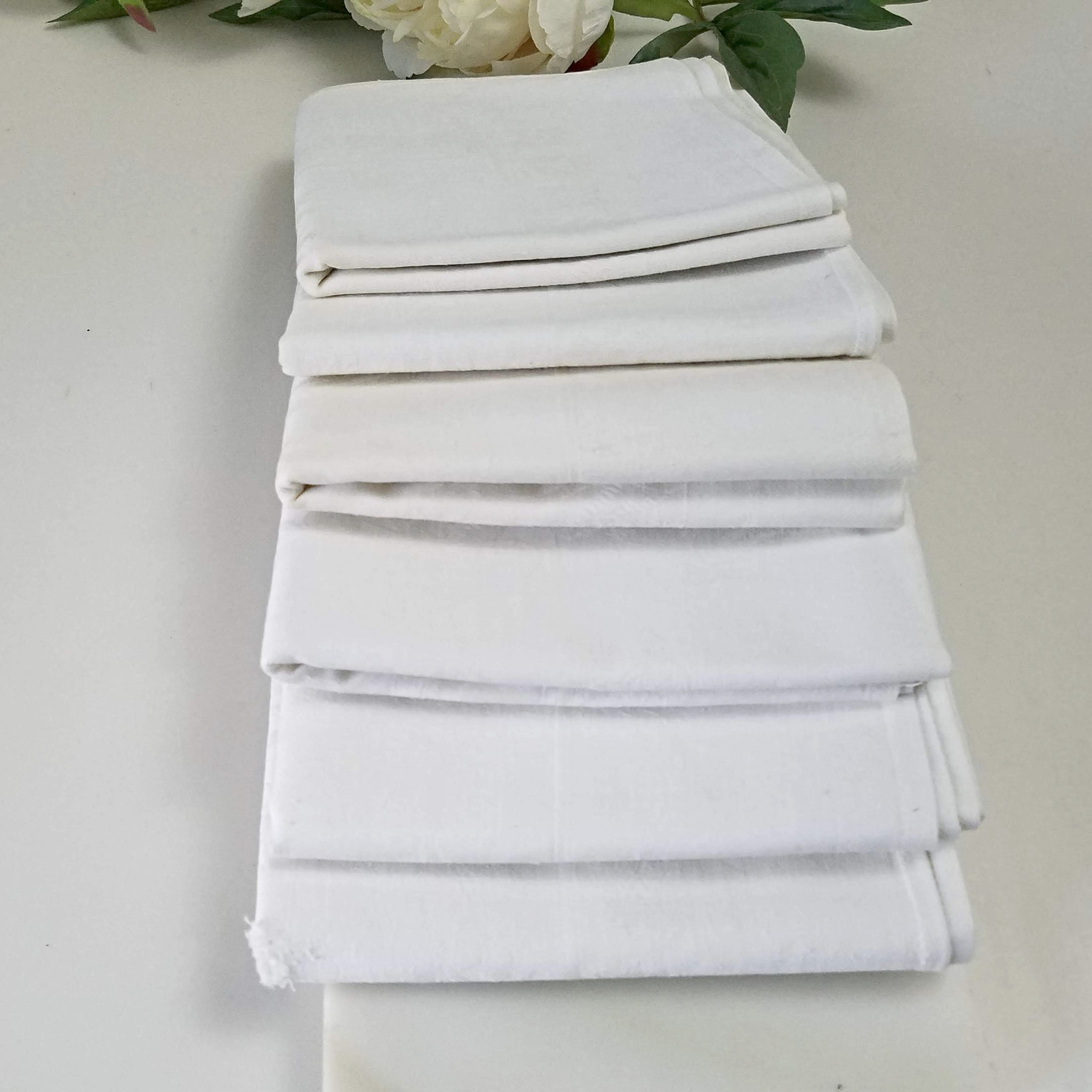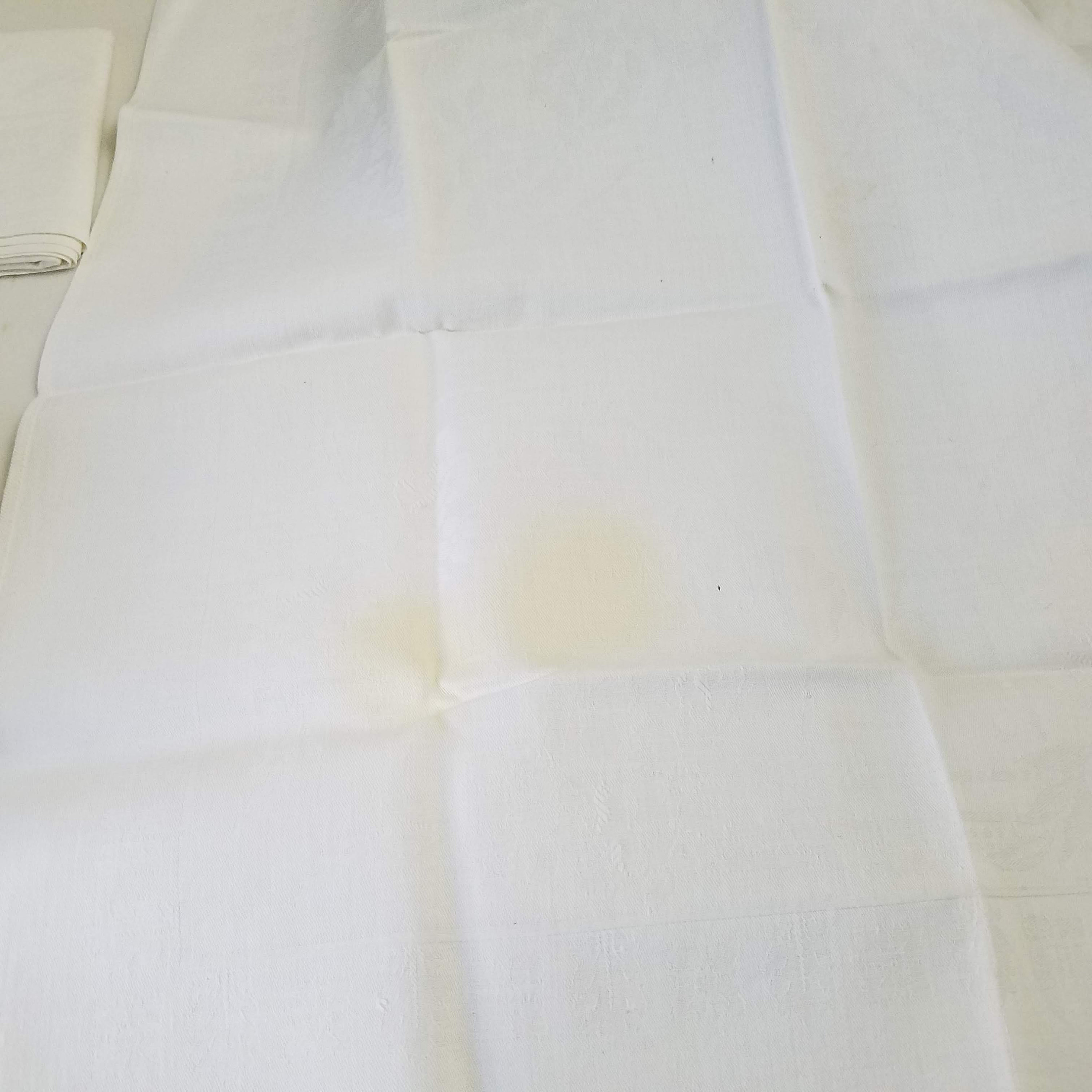 Vintage linen napkins: Linen damask fabric napkins. Set of 6 white napkins from the 1930s, two with holes, four with stains and discoloration. Square napkins measuring 22" (56 cm) square. A unique addition to your vintage sewing and craft supplies to make vintage decor for your home. Please look at the photos for condition and contact me with any questions you may have. To see more vintage and handmade gifts, collectibles, and jewelry visit https://RibbonsandGlass.com. Domestic shipping is included.