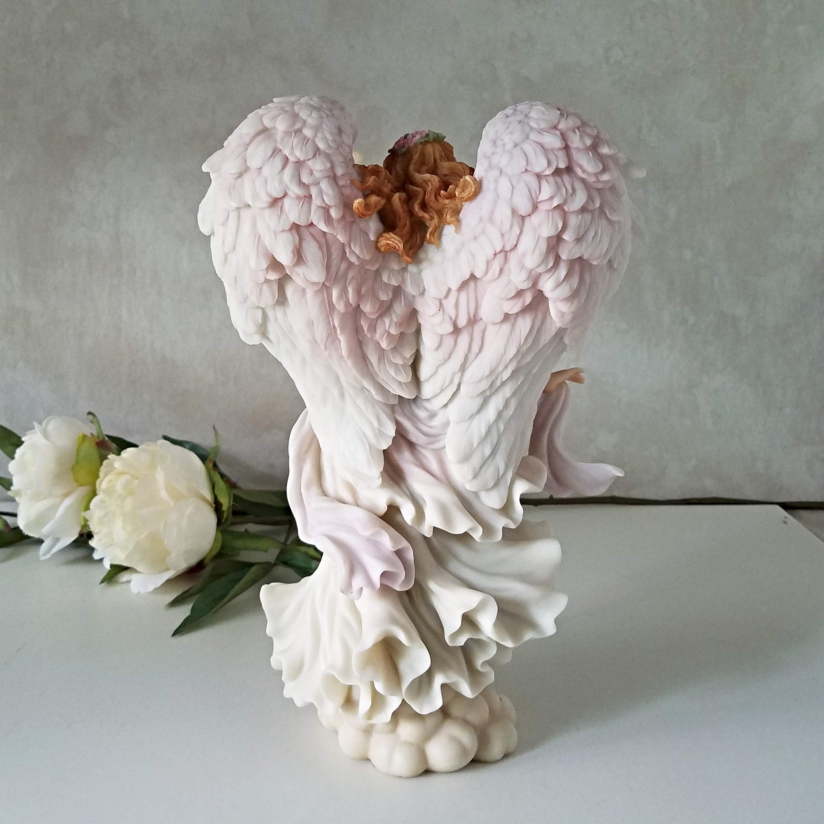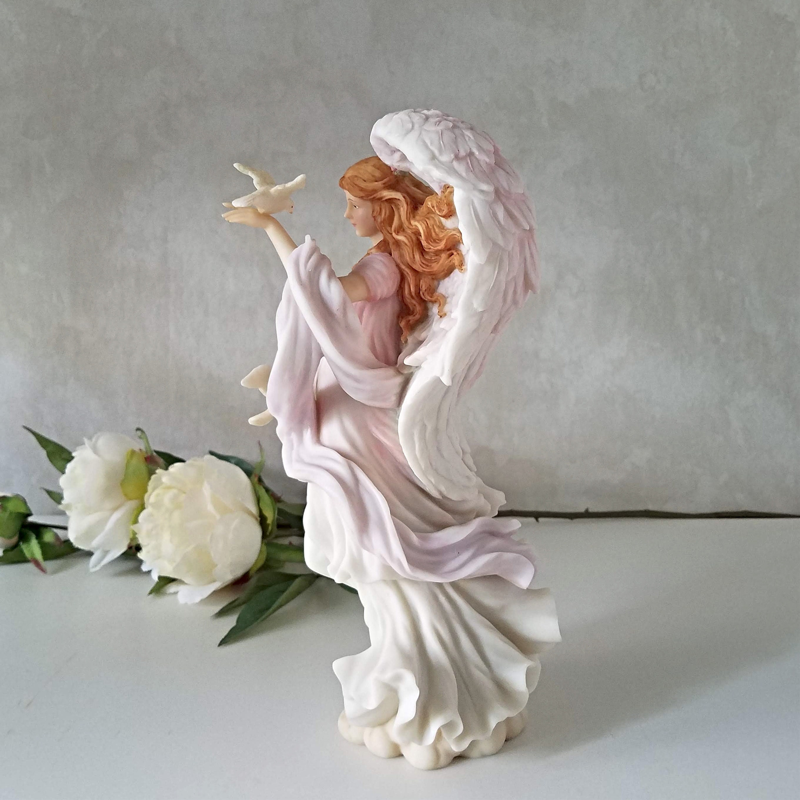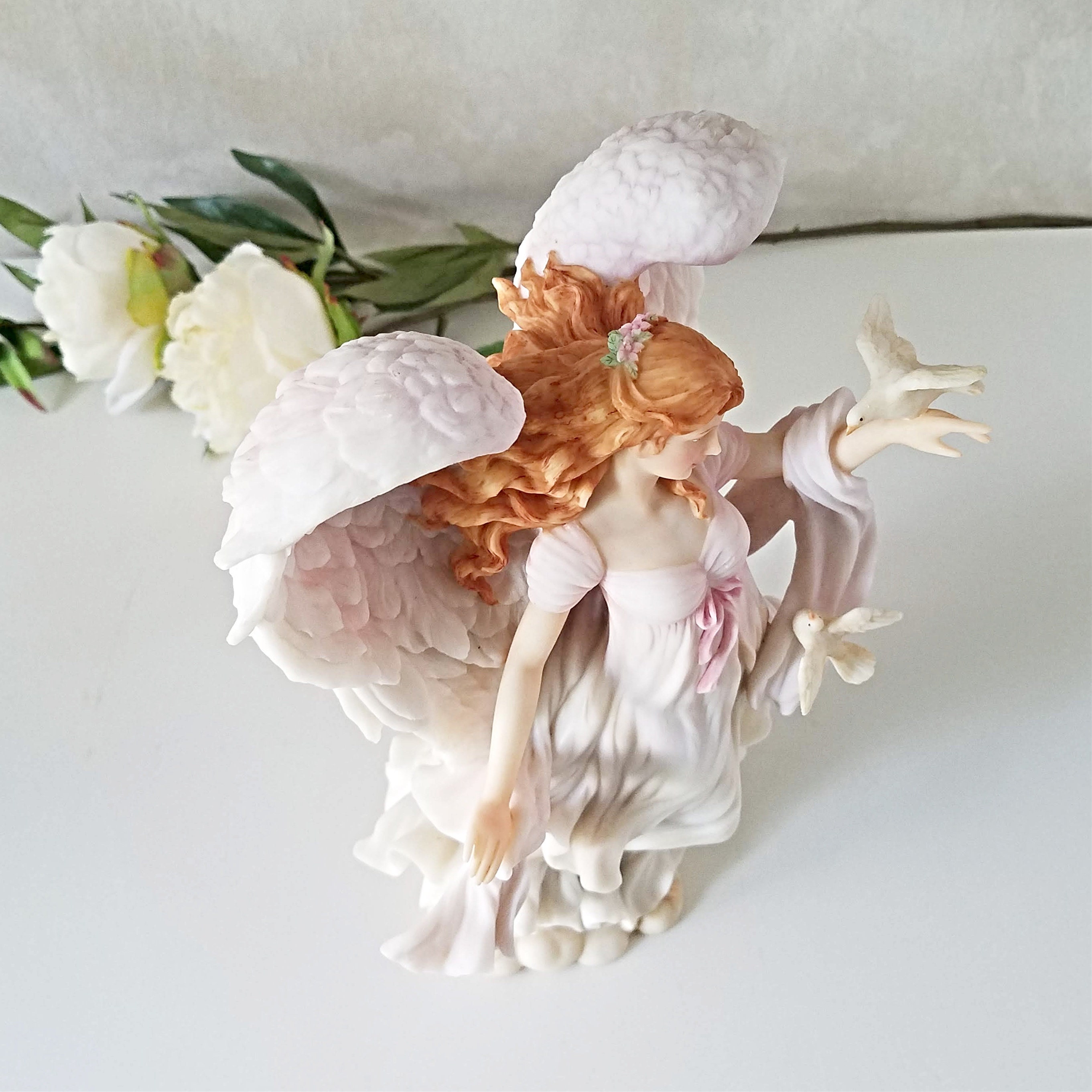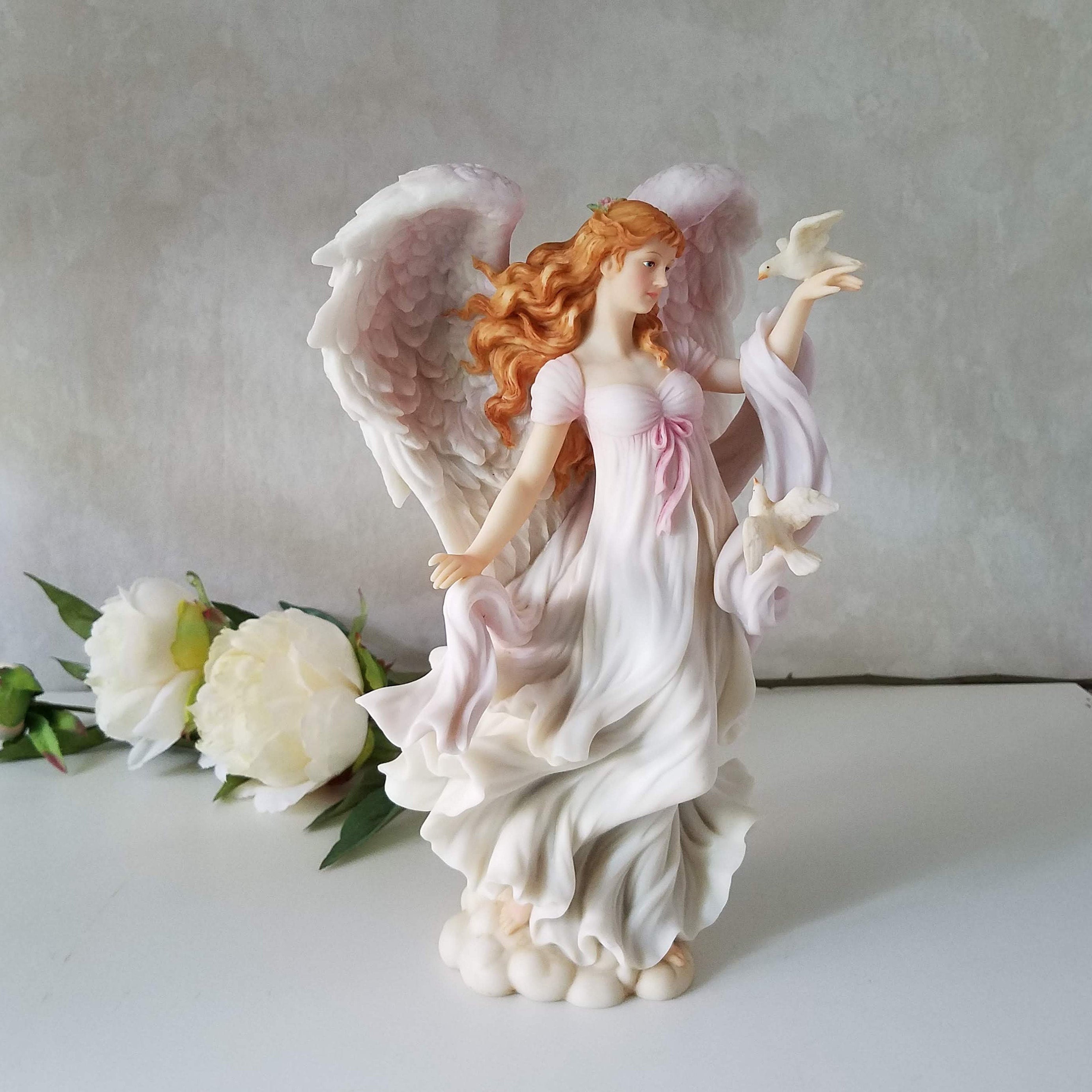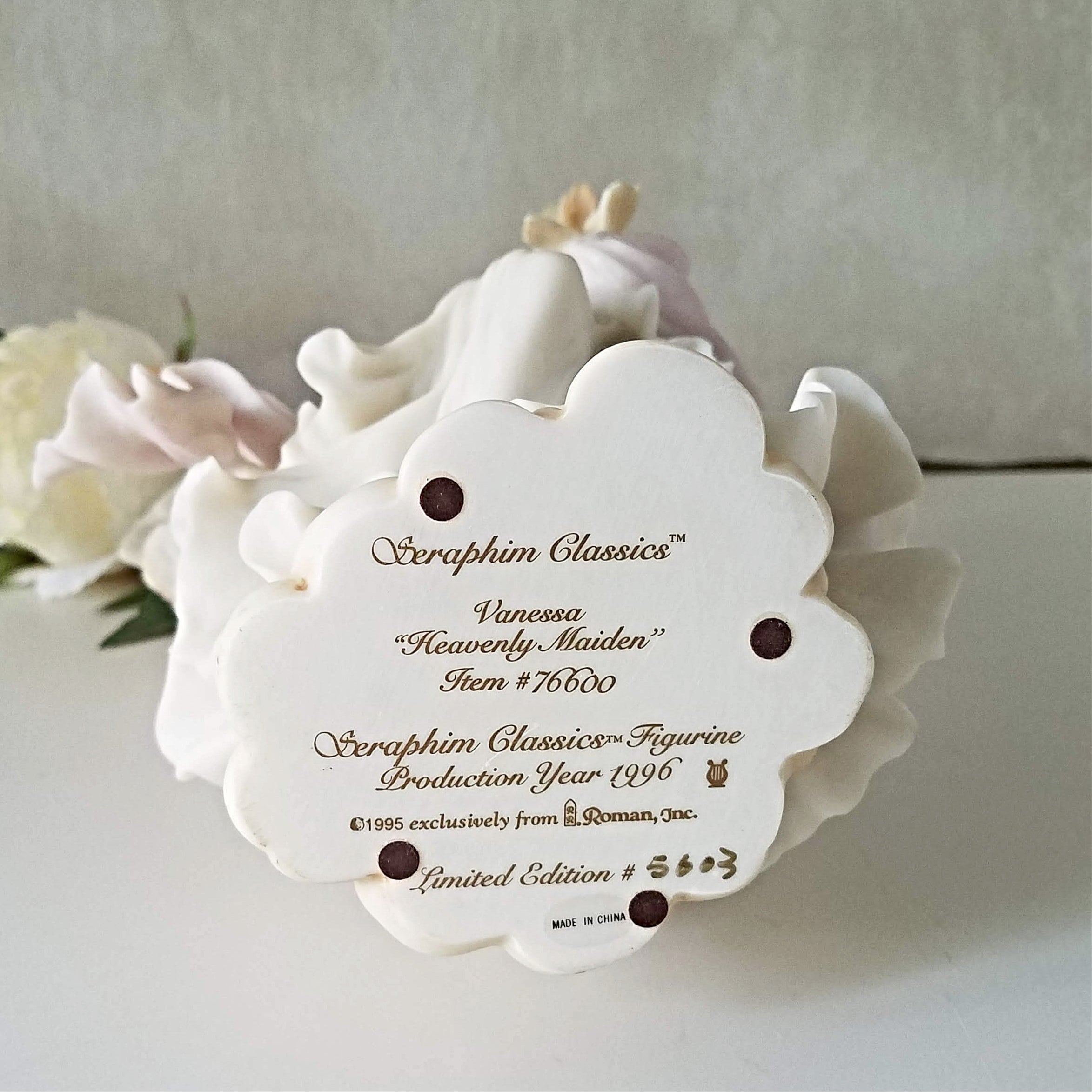 Seraphim Classics Angel figurine: Vanessa Heavenly Maiden Limited Edition Angel, model 76600 edition number 5603. This gorgeous white and pink angel has intricate details. A beautiful maiden with red hair, a flowing gown, gorgeous wings, and is holding doves. This is a 1996 limited edition Seraphim Classics 12" tall Angel. She is in excellent condition.
