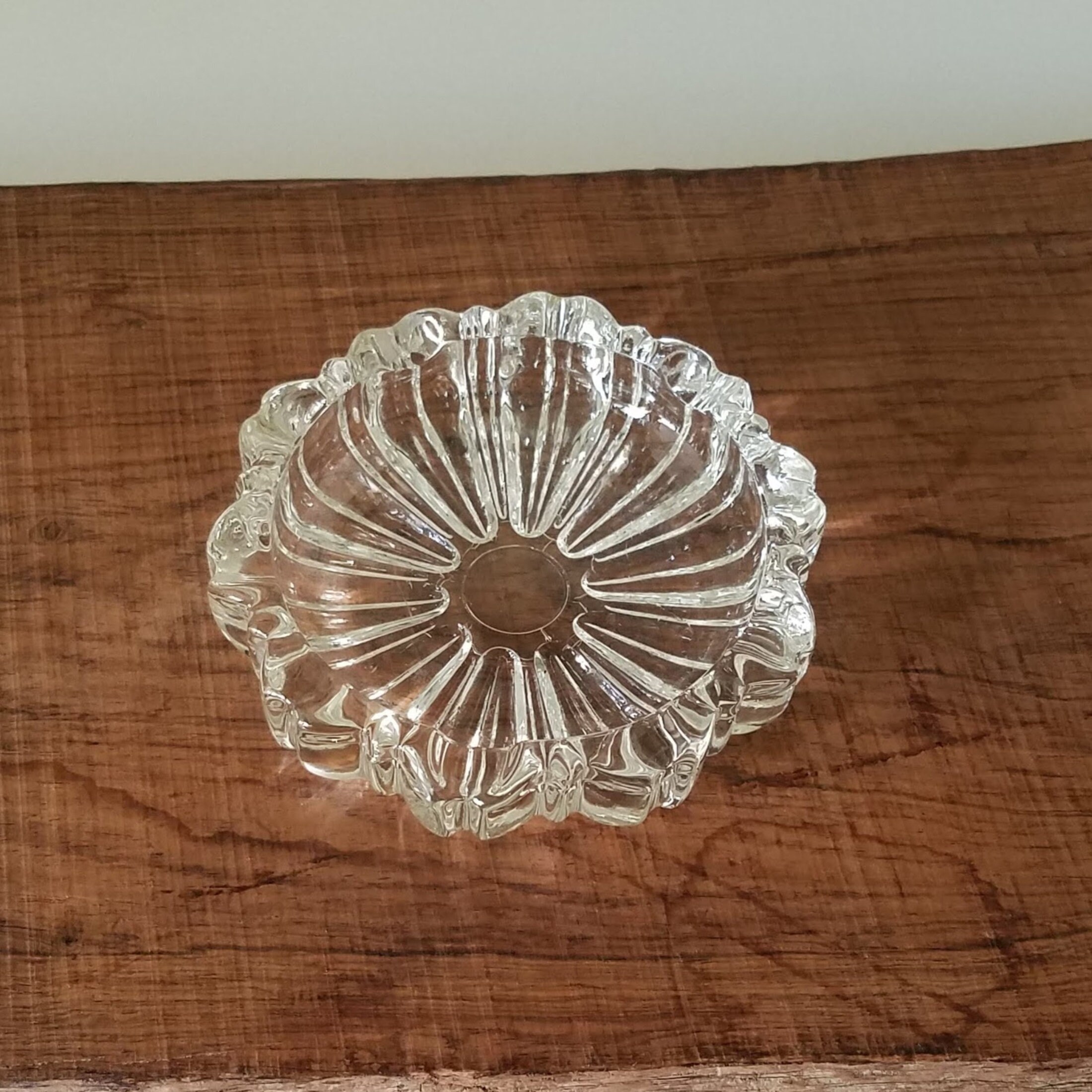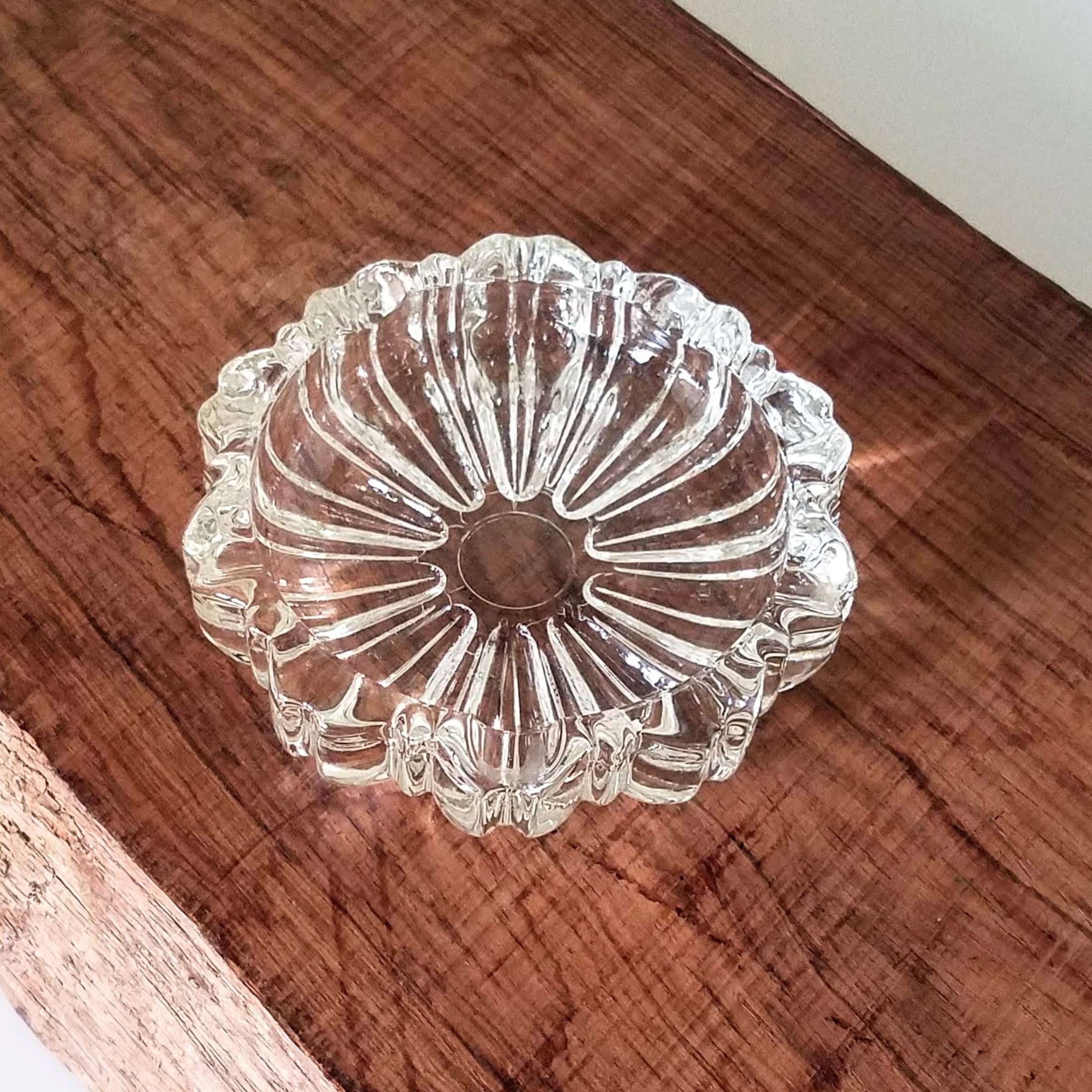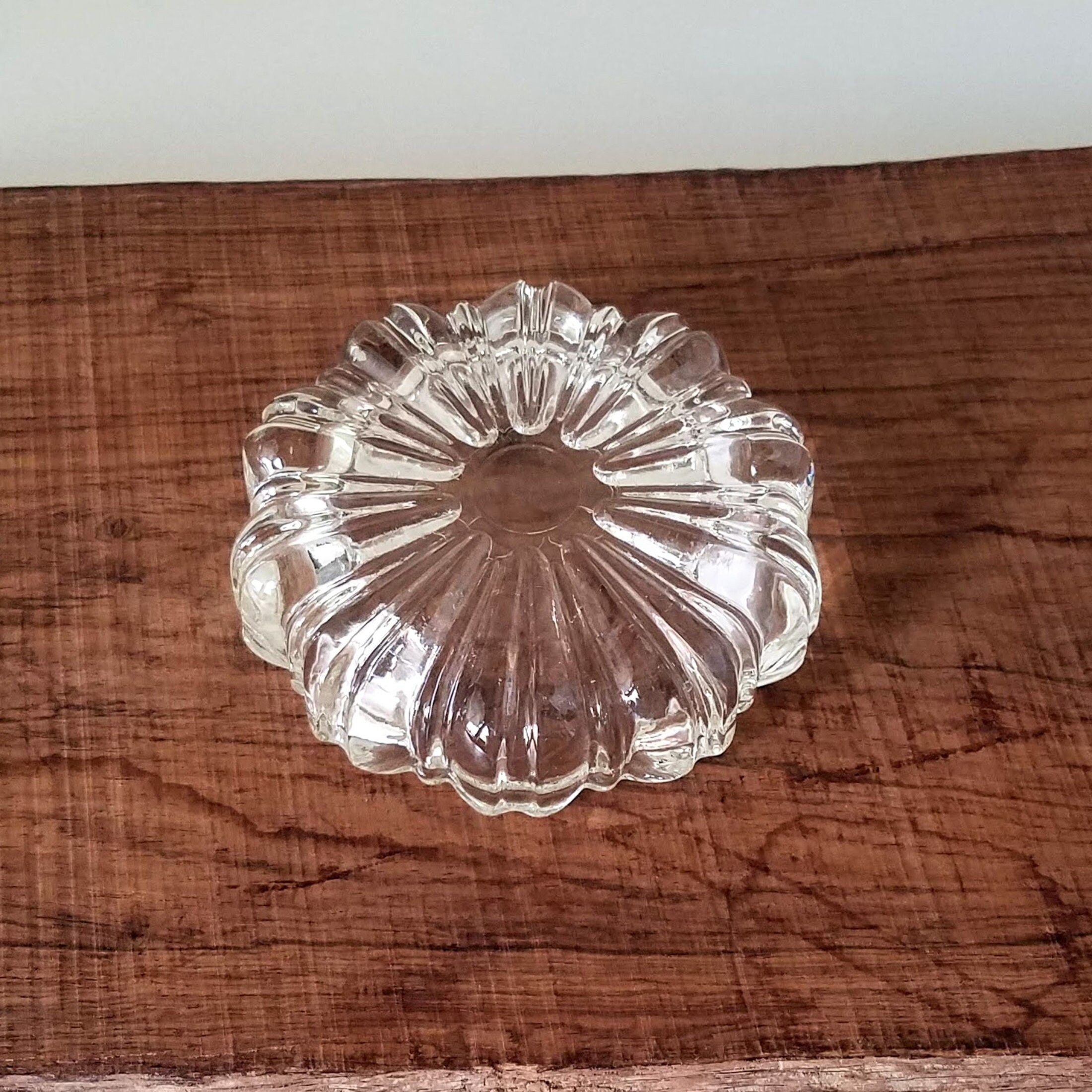 Clear glass ashtray: Vintage pressed glass mid-century modern decor. Tobacciana collectible ashtray measuring 4.25" (10.75 cm) wide and 1" (2.5 cm) high. This piece is in very good condition with no chips or cracks. Domestic shipping is included.