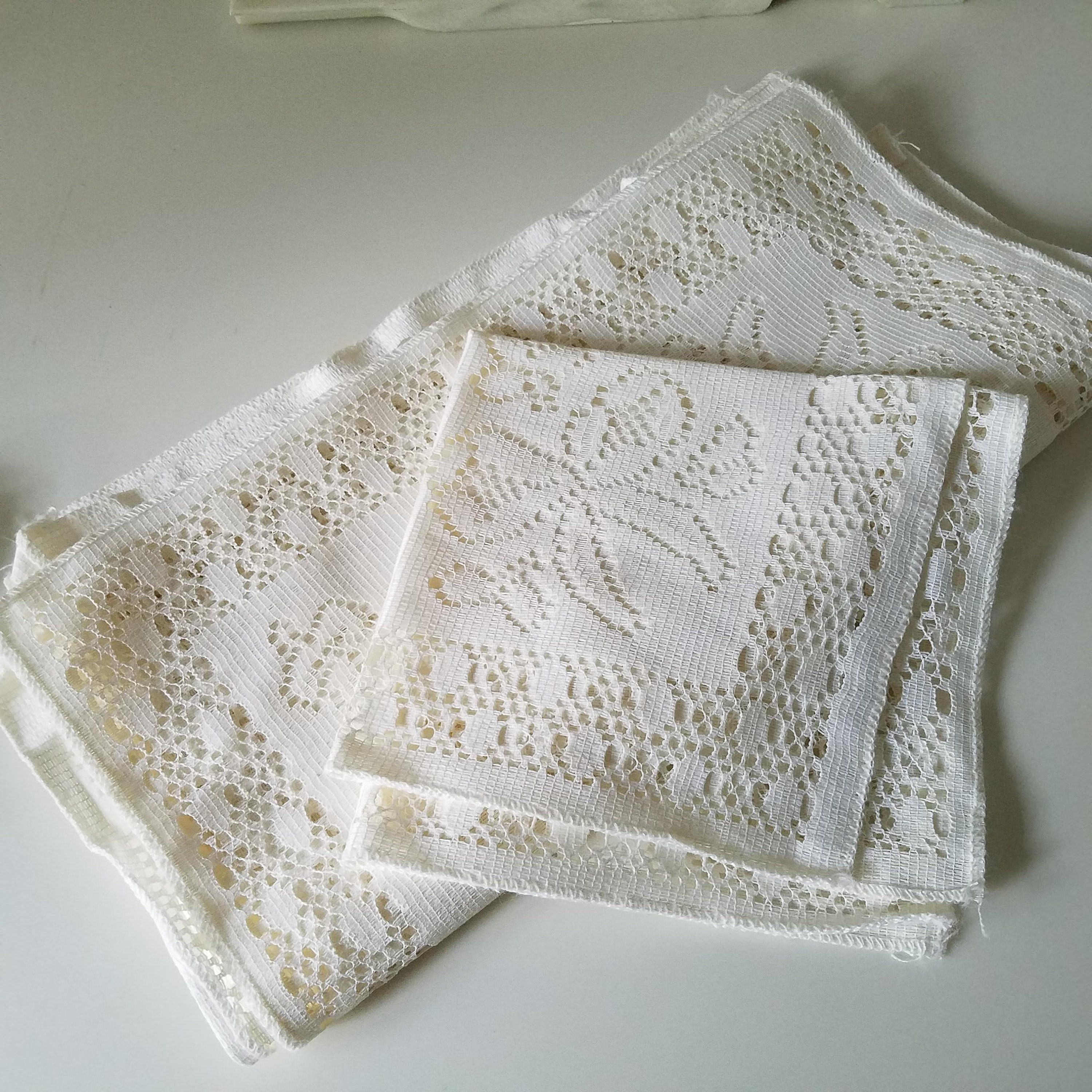Vintage fabric napkins: Set of 7 ivory white woven cloth napkins with ribbon and bow design. Ready for formal dining and vintage farmhouse decor. Each napkin measures 15" x 15". There are a couple of stains on the napkins which have not been washed.