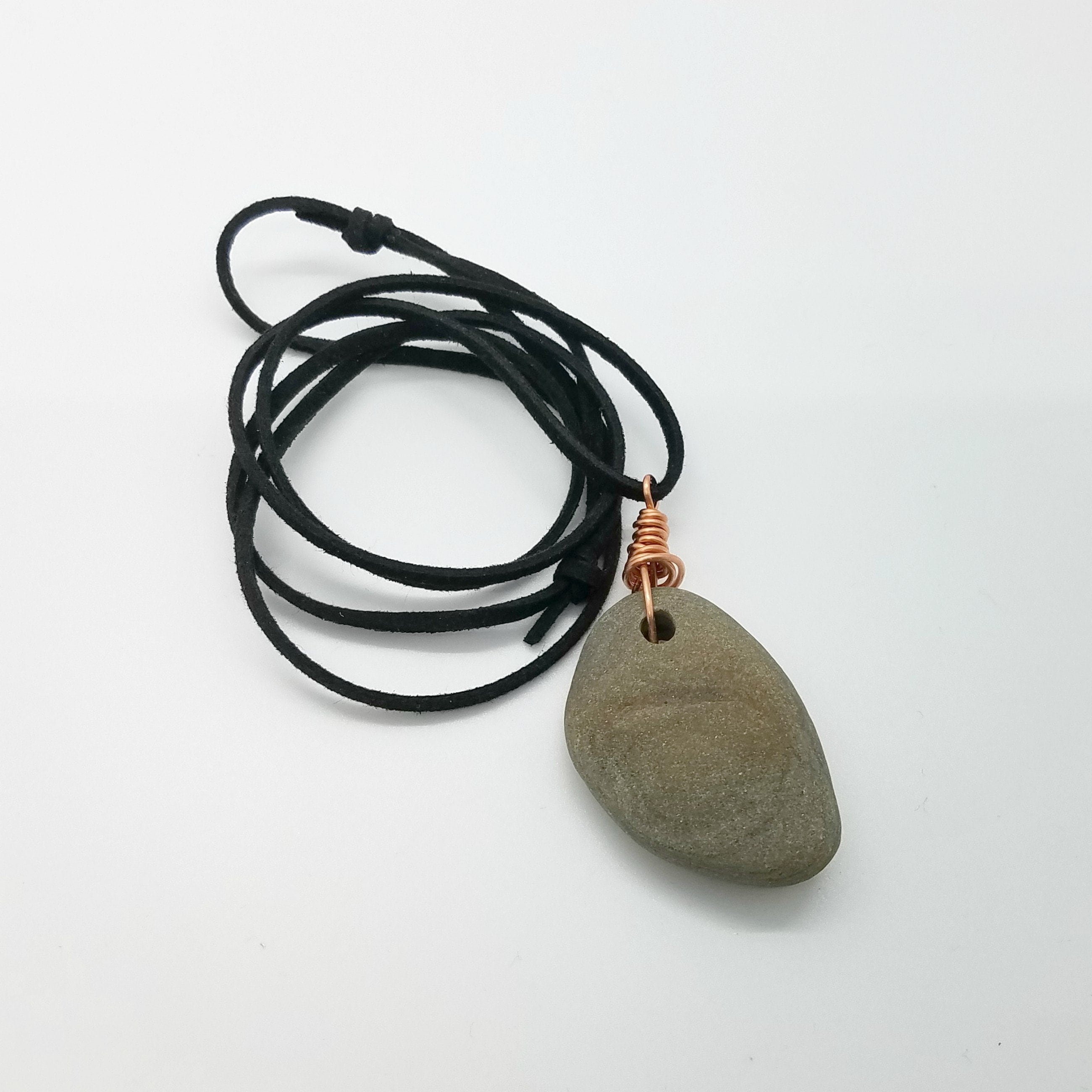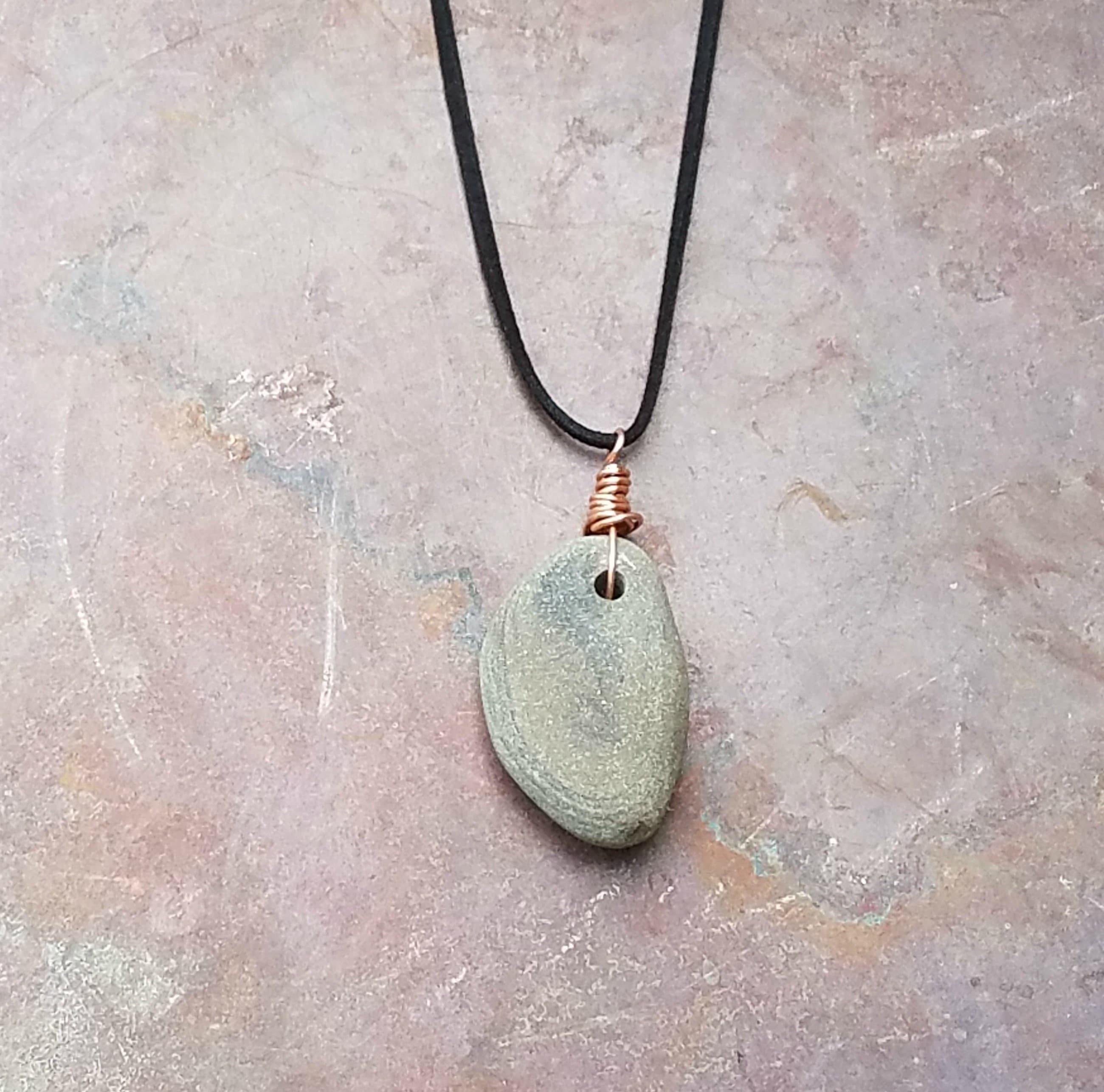 This unique rock necklace is made with a vegan suede cord and a hand-gathered and drilled stone pendant hand wire wrapped with copper wire. A unique piece of river rock jewelry and a wonderful gift for someone you love. The river stone necklace is a natural necklace, a vegan long adjustable necklace.