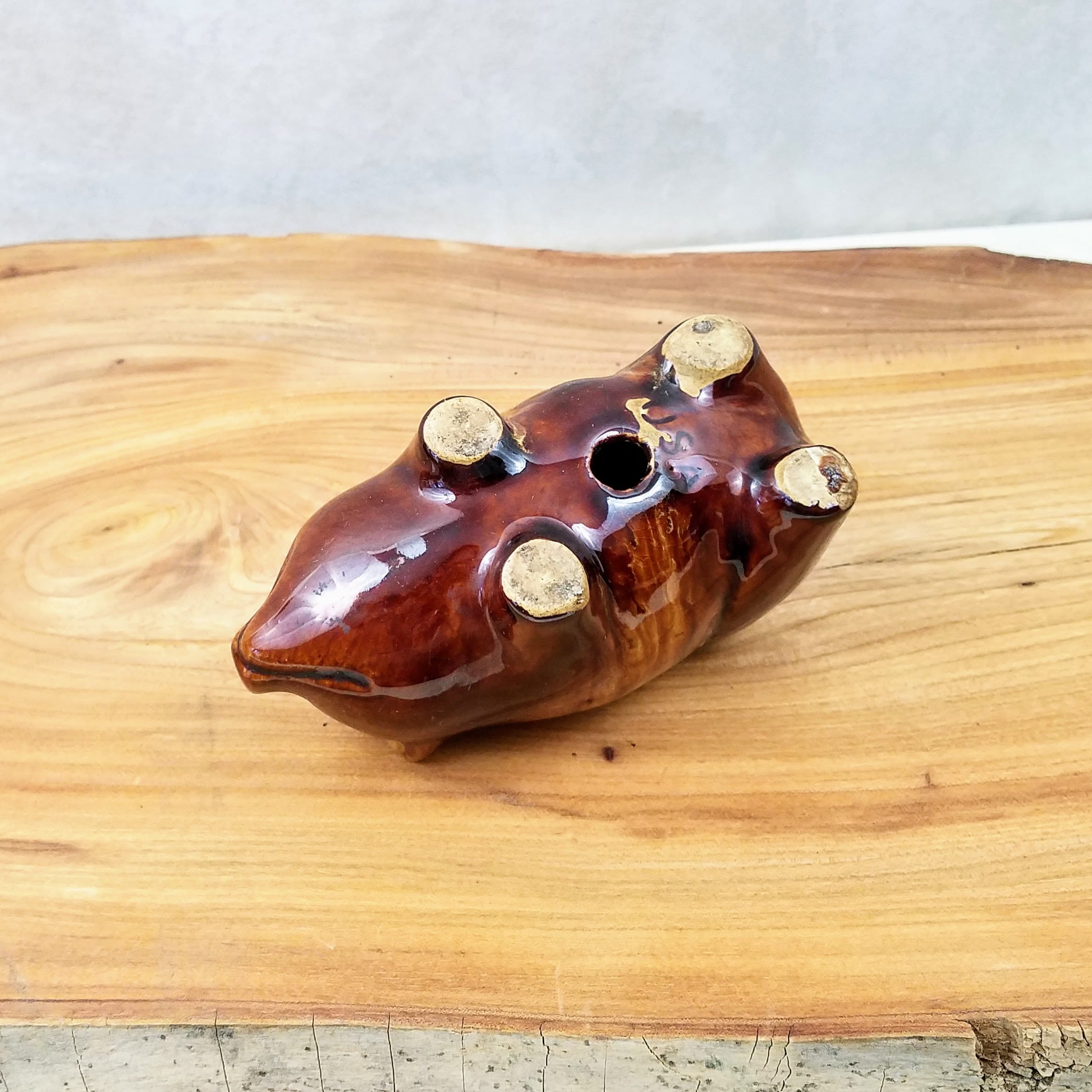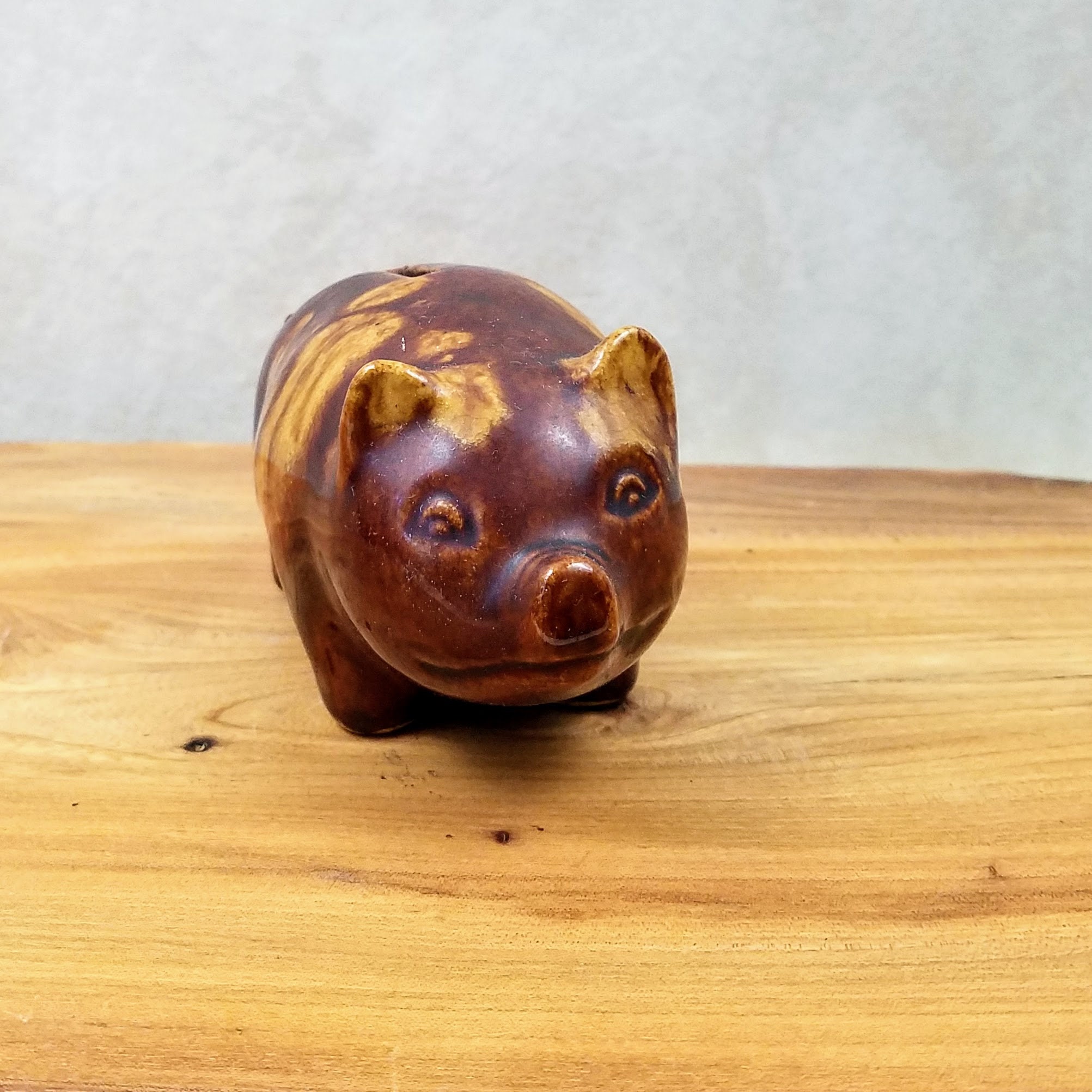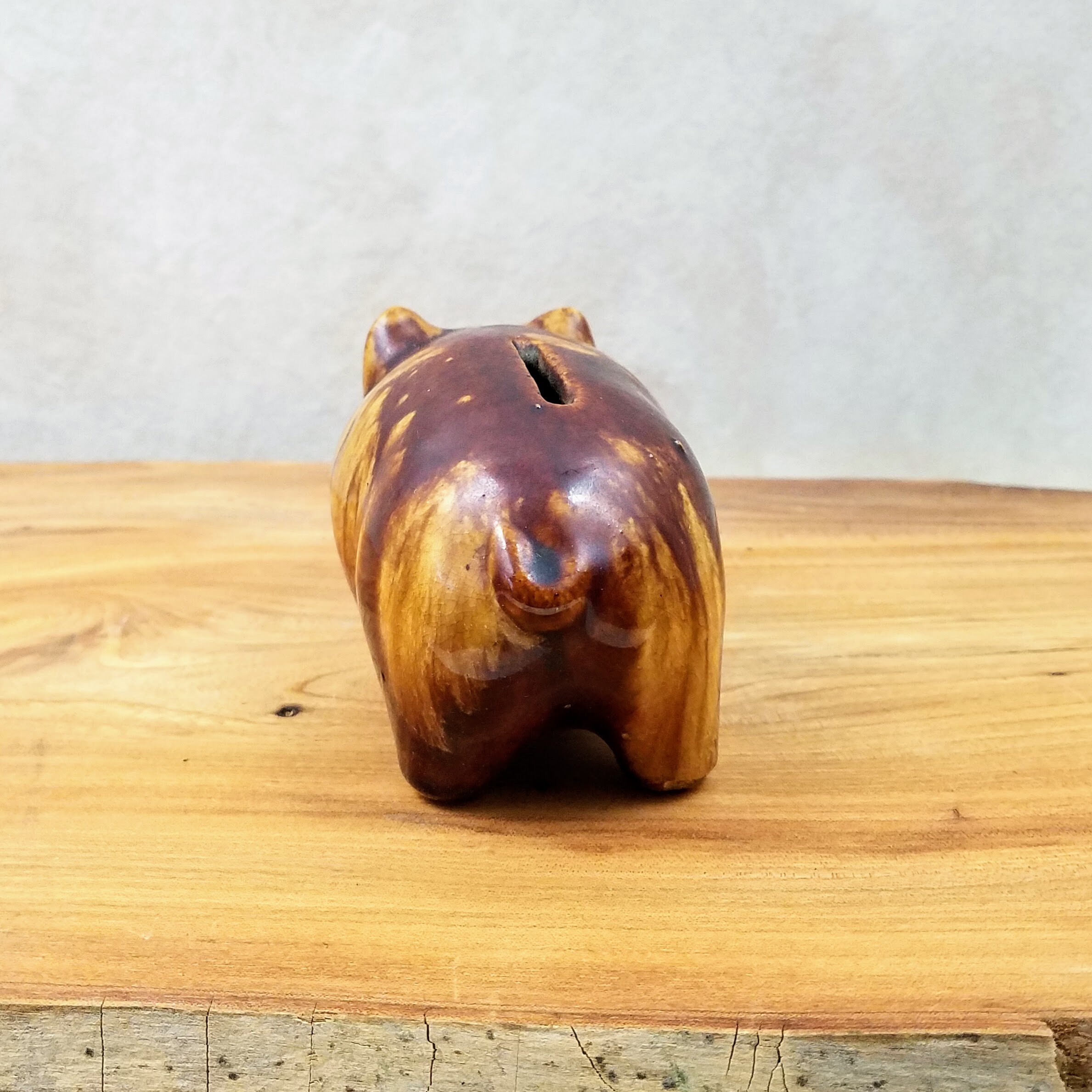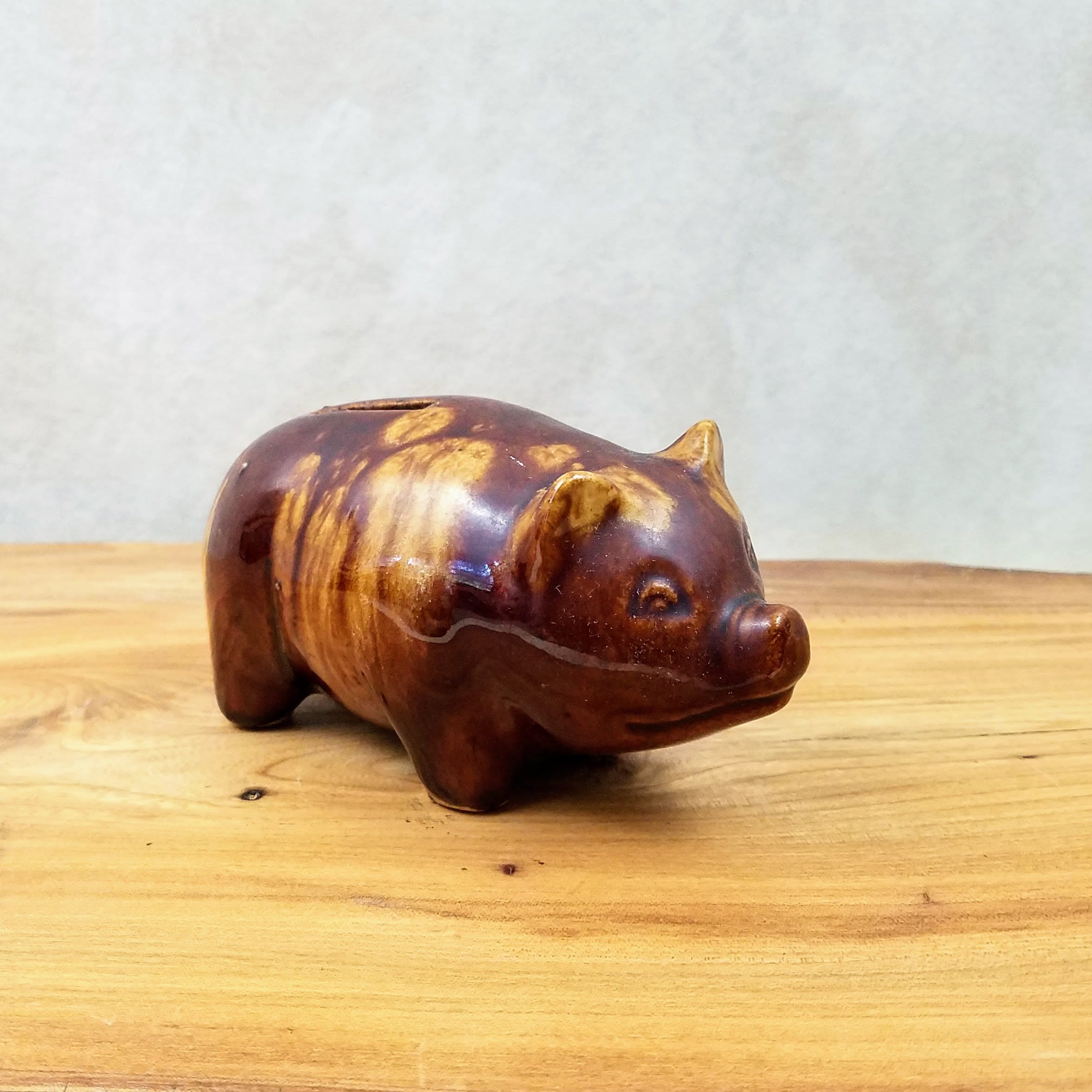Vintage McCoy brown ceramic piggy bank. This cute little piggy bank is a fabulous piece of collectible pottery measuring 6" (15.2 cm) long, 3" (7.5 cm) wide, and 2.75" (7 cm) tall. The little pottery pig has 'USA' on the bottom, there is no stopper. A unique vintage gift and addition to your farmhouse decor.