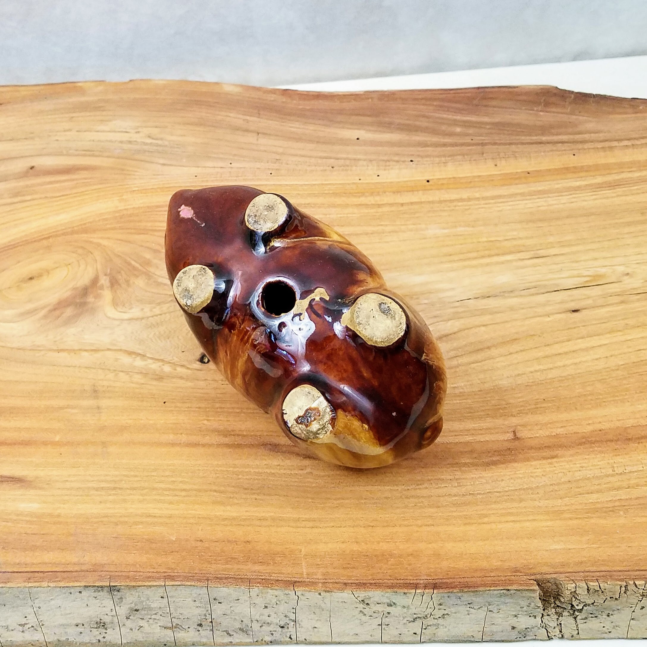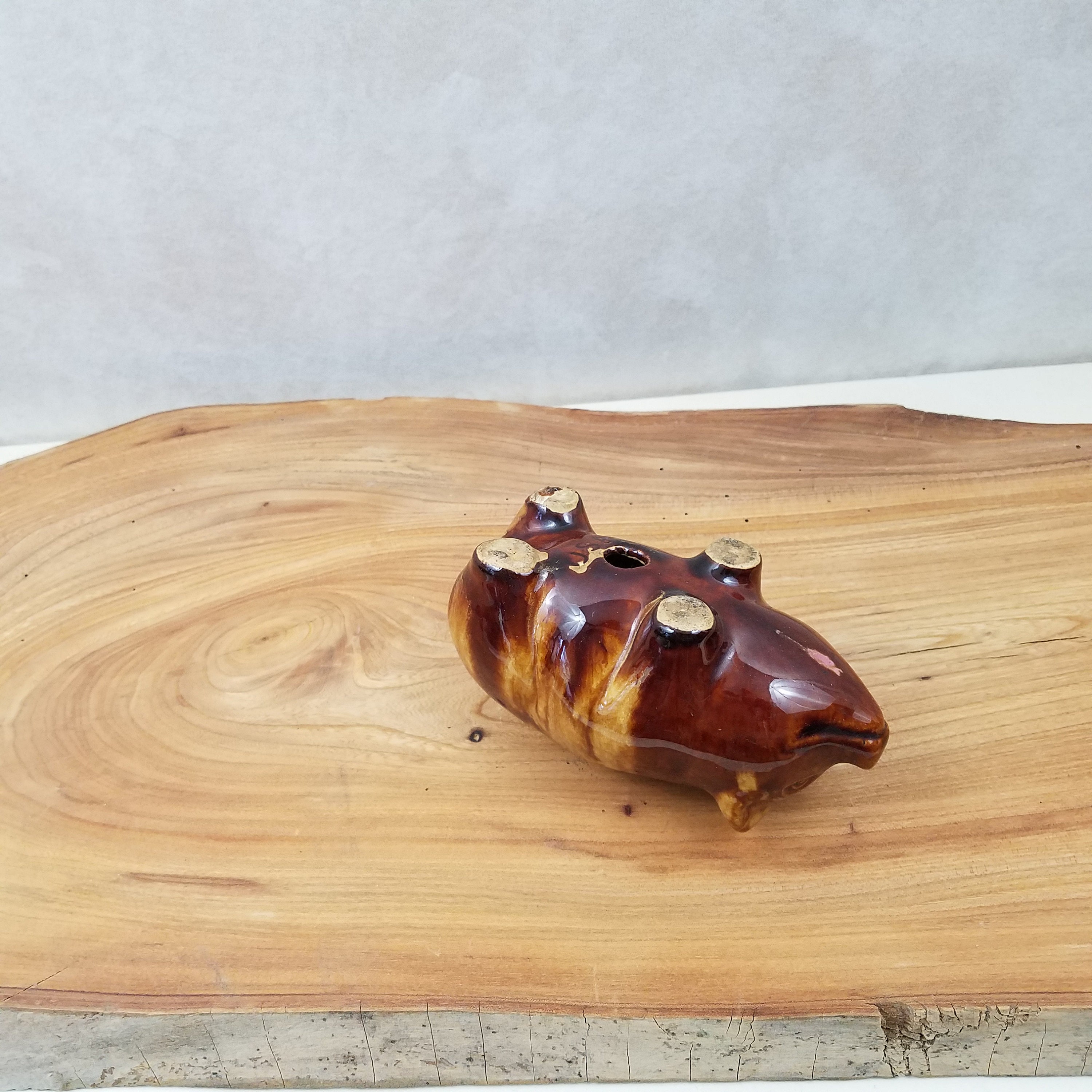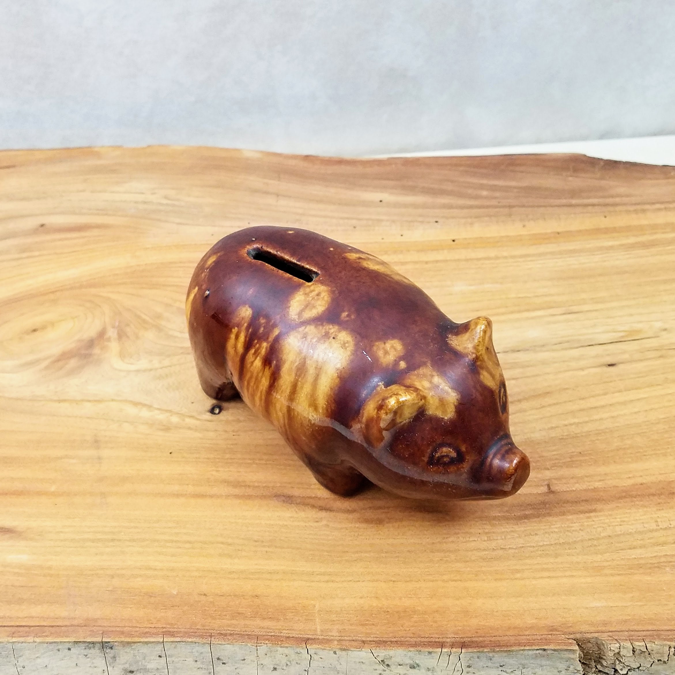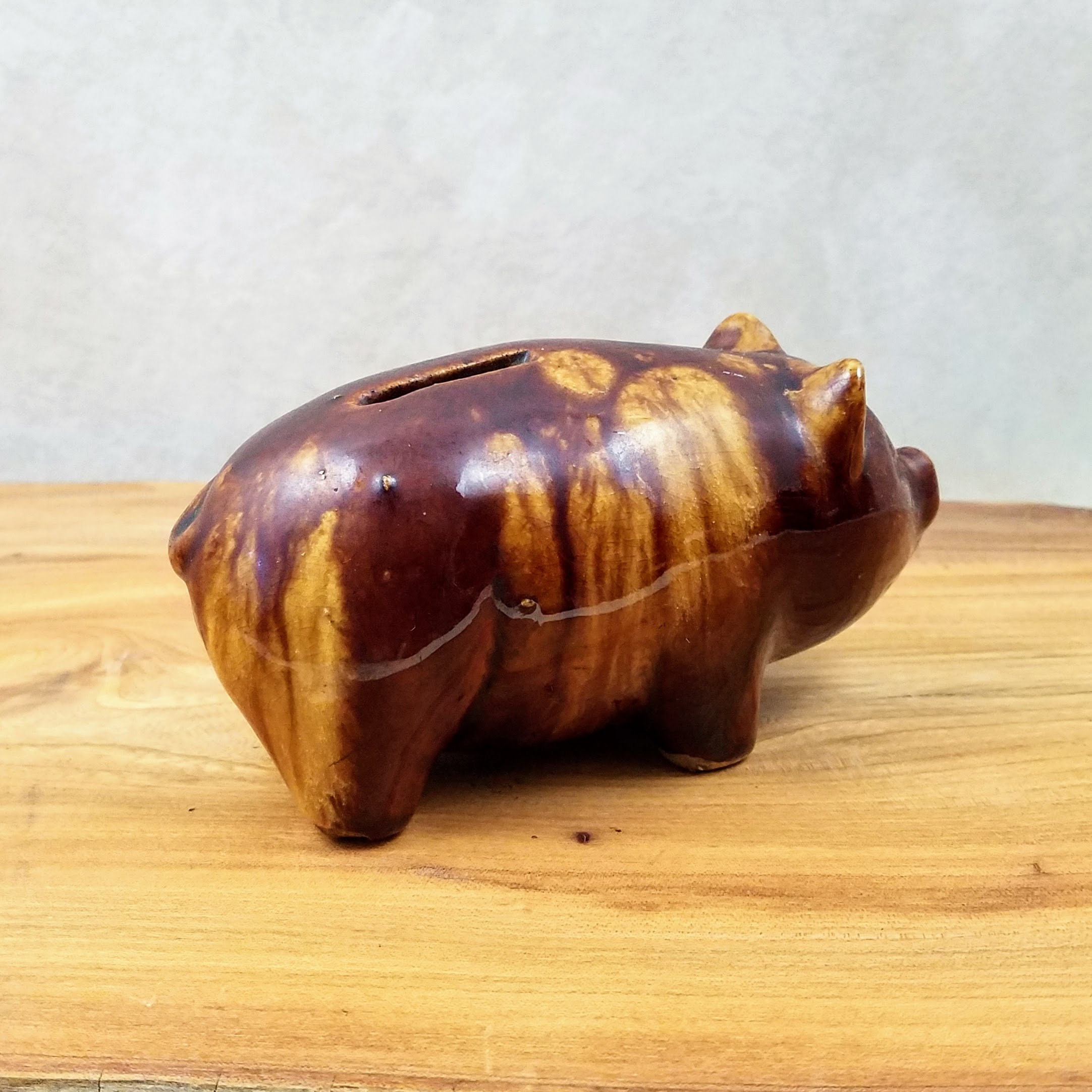 Vintage McCoy brown ceramic piggy bank. This cute little piggy bank is a fabulous piece of collectible pottery measuring 6" (15.2 cm) long, 3" (7.5 cm) wide, and 2.75" (7 cm) tall. The little pottery pig has 'USA' on the bottom, there is no stopper. A unique vintage gift and addition to your farmhouse decor.